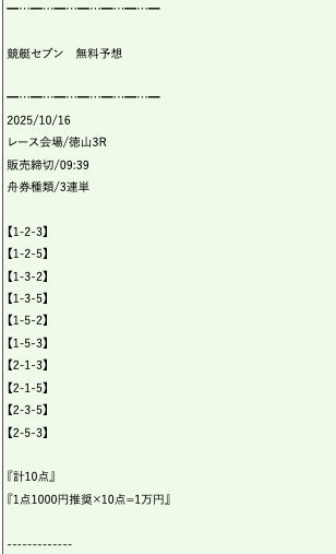 - 10月16日 徳山3R【買い目】三連単1-2-45.5倍0円 - 10,000円= -10,000円✕