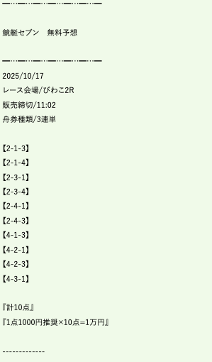 | 舟券代 | 1点1,000円 合計10,000円 |