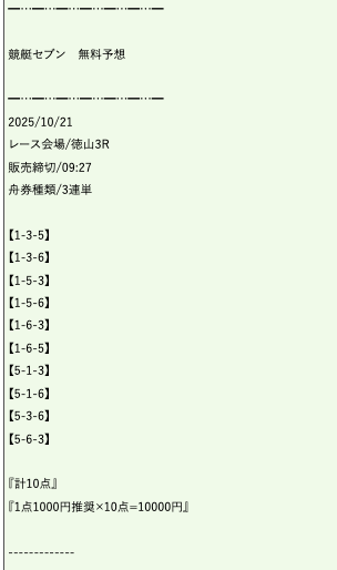 - 10月21日 徳山3R【買い目】三連単6-1-565.8倍0円 - 10,000円= -10,000円✕