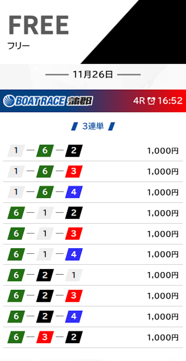 - 11月26日 蒲郡4R【買い目】三連単6-1-260.7倍60,700円 - 10,000円= 50,700円607%