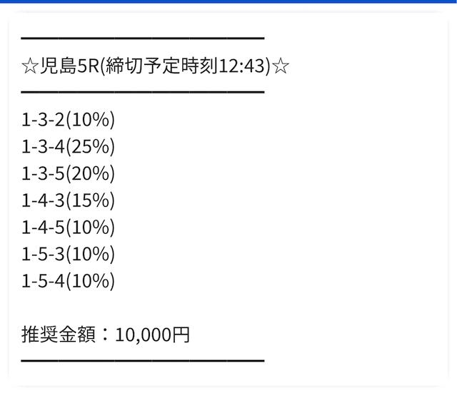 POINTポイント①.本命決着でも数万円の払い戻し!ポイント②.金額と点数調整がまさにプロ!ポイント③.2連勝で10万円超えのプラスも!- 匿名当たり前みたいに1号艇軸かと思いきや、3号艇から仕掛けて的中。ヒモ荒れまで拾ってくれてたのが地味にすごい。 ちょっと尖ってる構成だけど、変に手数が多くないのがありがたい。