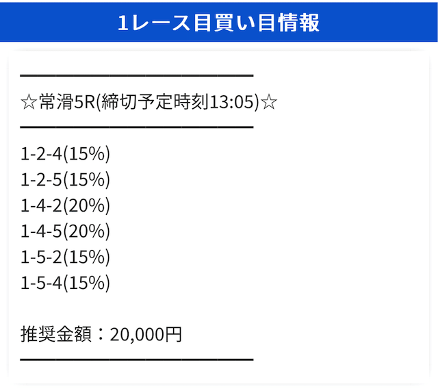 推奨投資金額は1レースあたり10,000円なので、当たった時に見込める利益は20,000円前後となります。