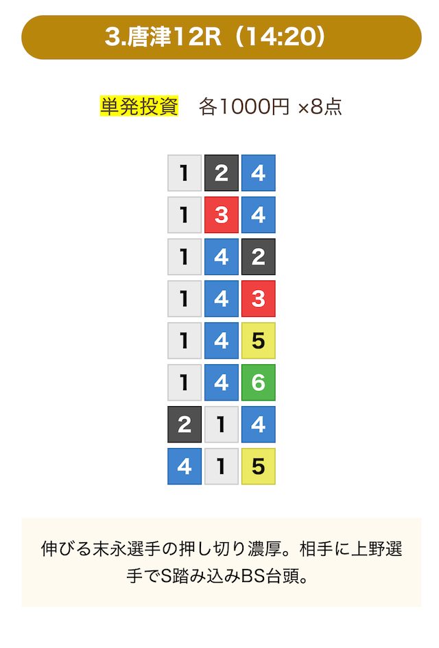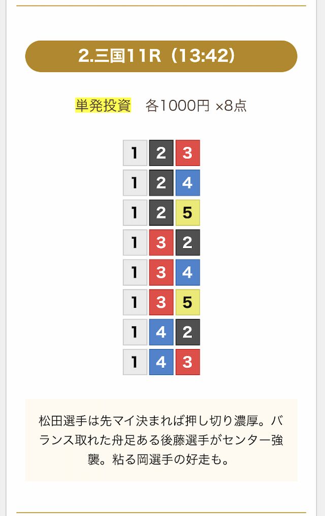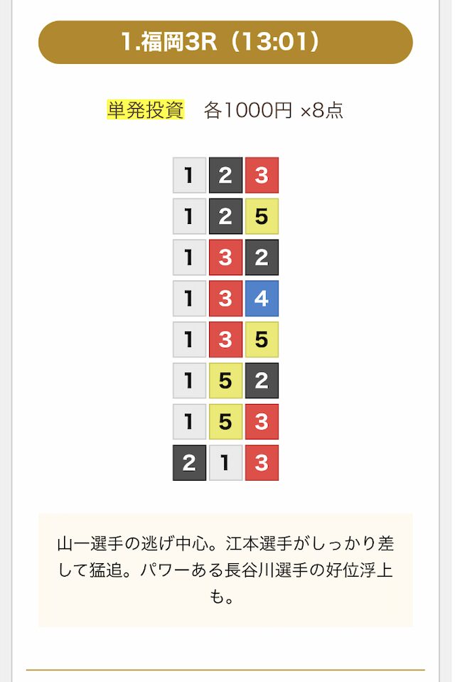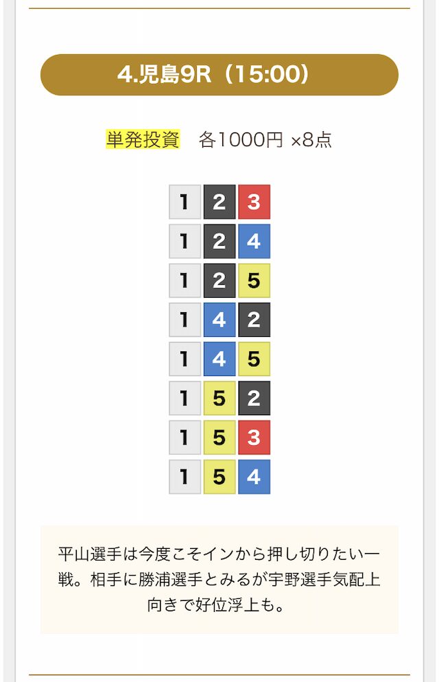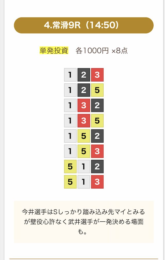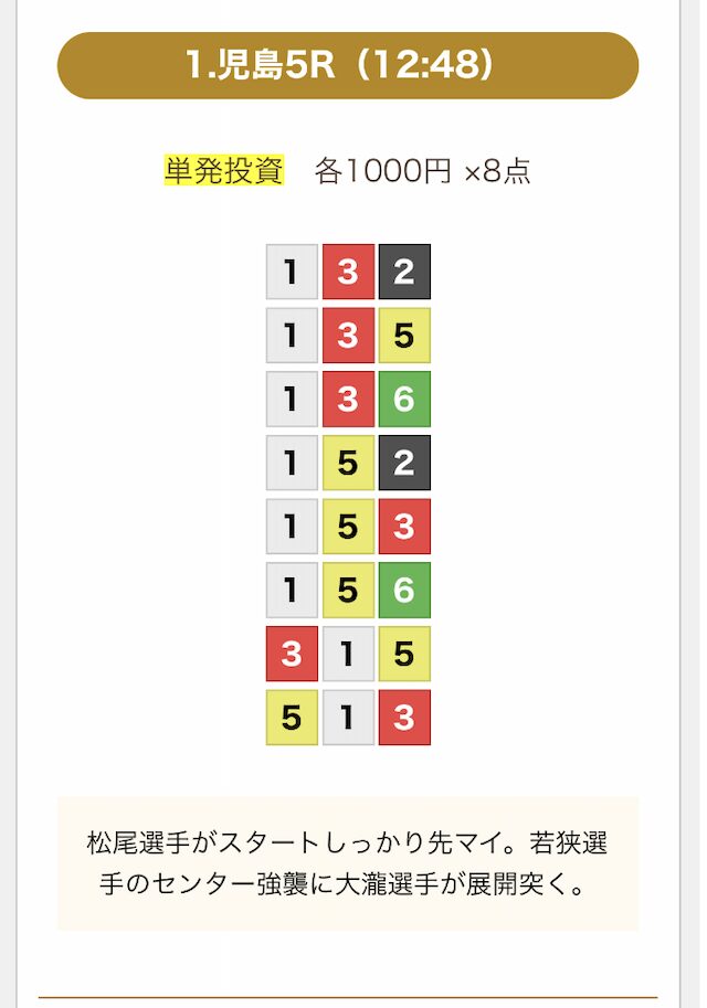 - 匿名1点1点の金額が調整されてて、オッズに対する意識の高さを感じた。 厚く押さえてたとこが来たから利益が残った。トリガミにならないように組んでる予想って少ないからこれは貴重かも。