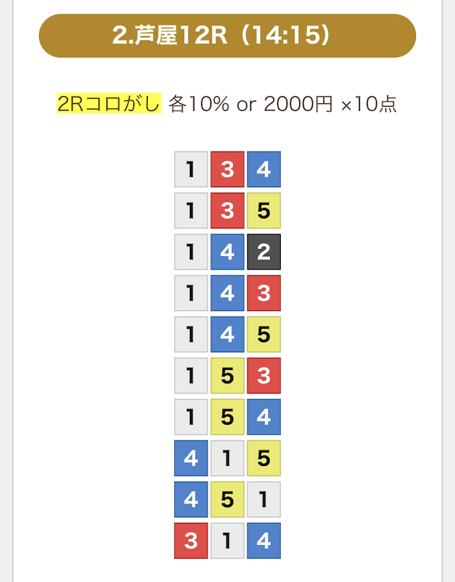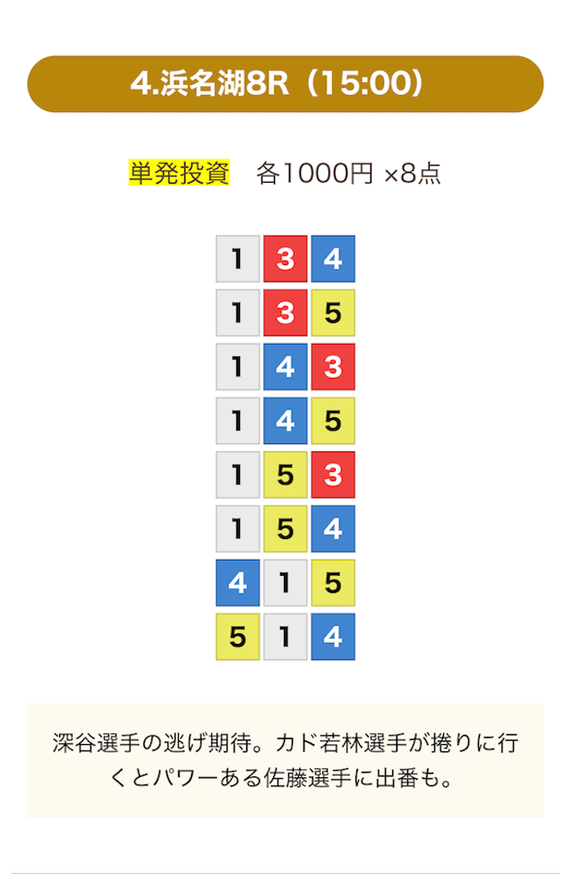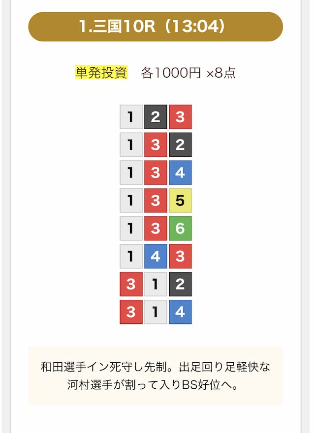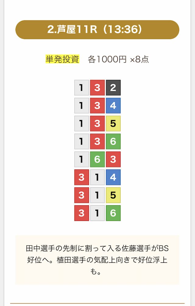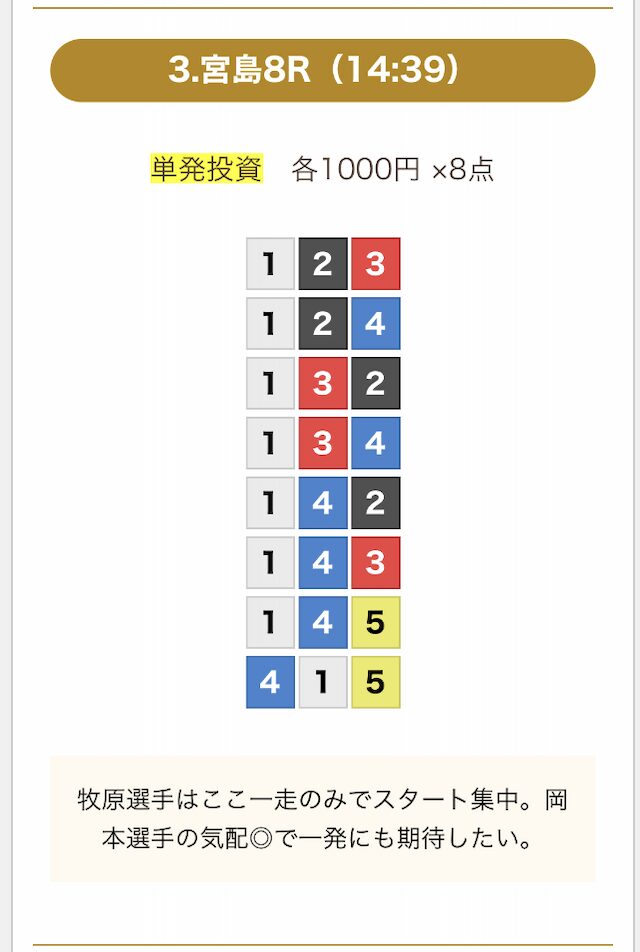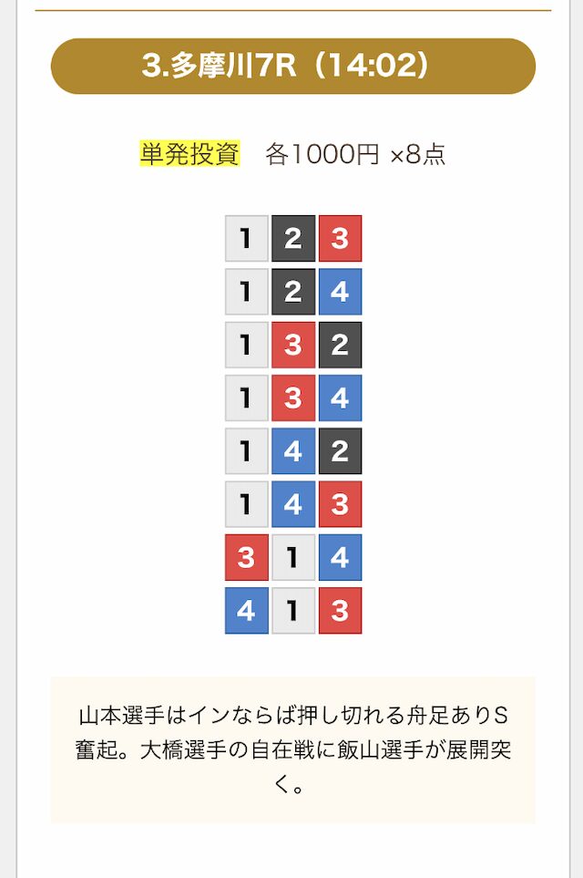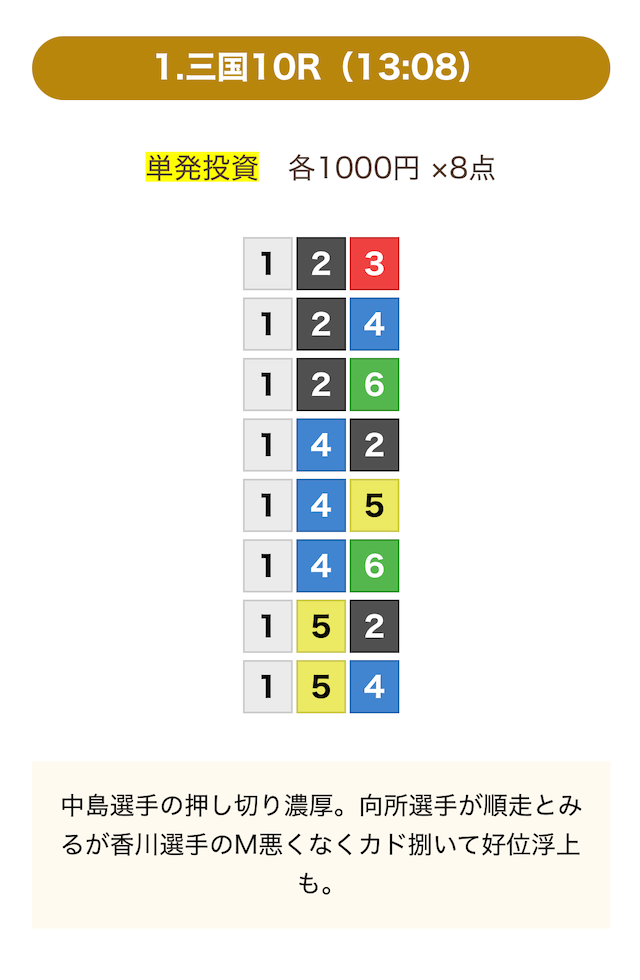 - 匿名1点1点の金額が調整されてて、オッズに対する意識の高さを感じた。 厚く押さえてたとこが来たから利益が残った。トリガミにならないように組んでる予想って少ないからこれは貴重かも。