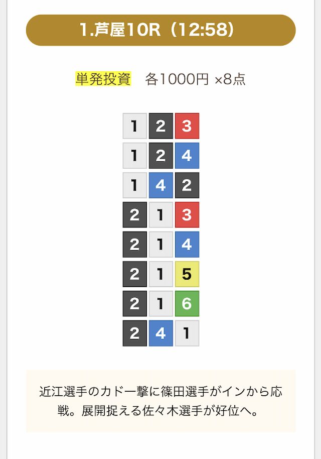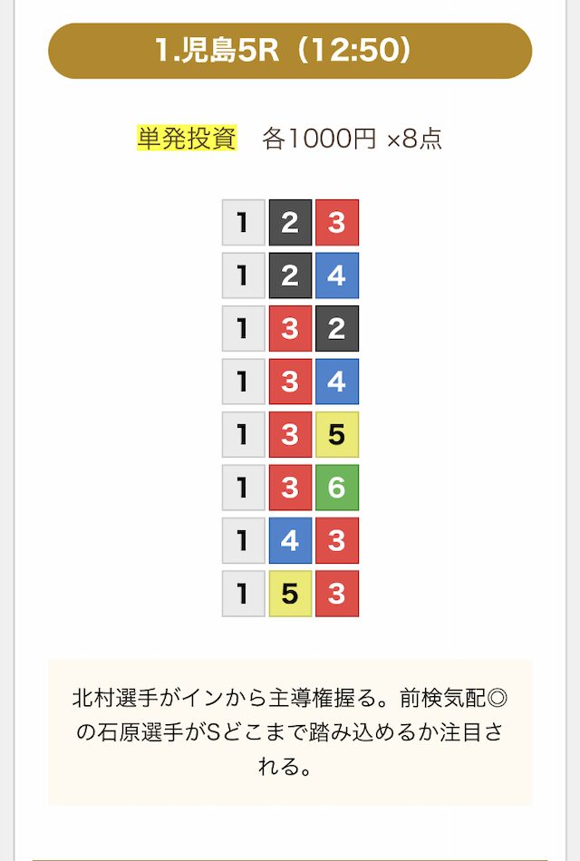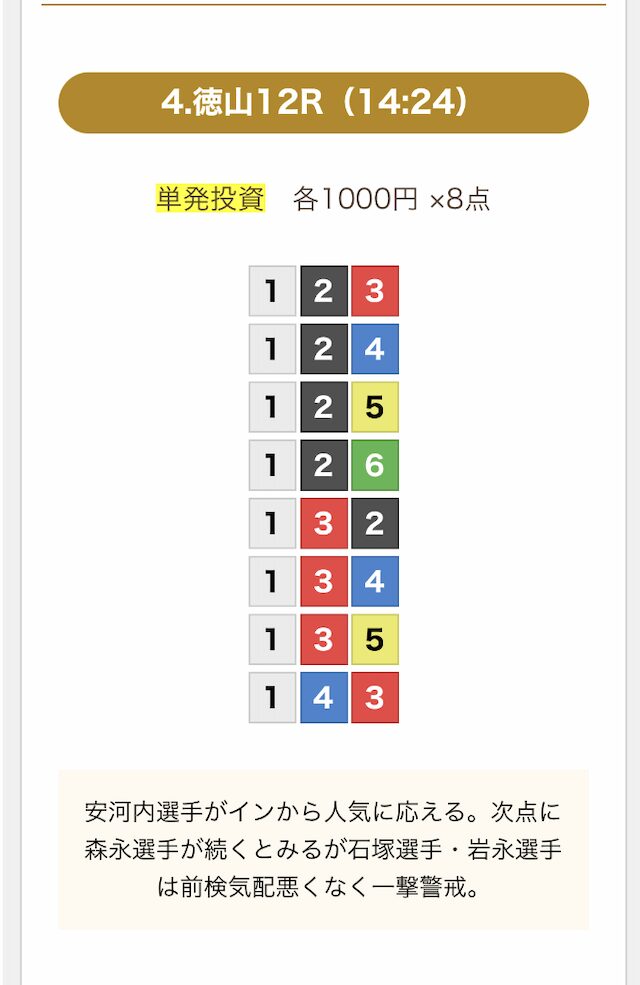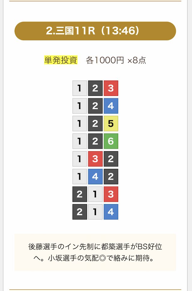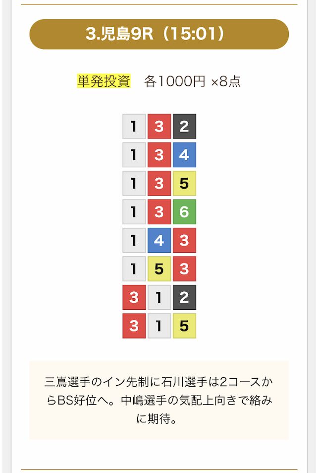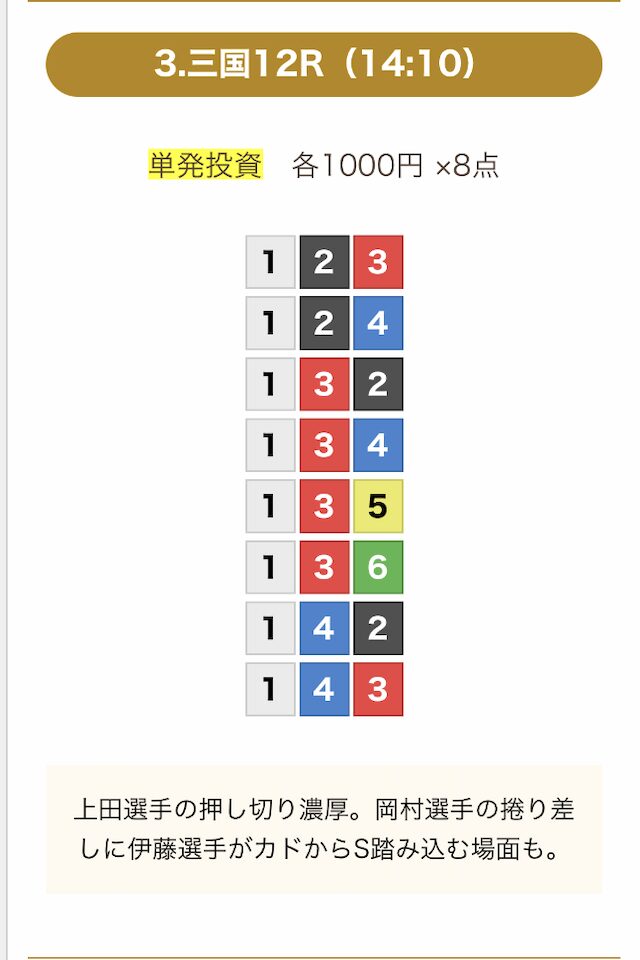 POINTポイント①.本命決着でも数万円の払い戻し!ポイント②.金額と点数調整がまさにプロ!ポイント③.2連勝で10万円超えのプラスも!- 匿名当たり前みたいに1号艇軸かと思いきや、3号艇から仕掛けて的中。ヒモ荒れまで拾ってくれてたのが地味にすごい。 ちょっと尖ってる構成だけど、変に手数が多くないのがありがたい。