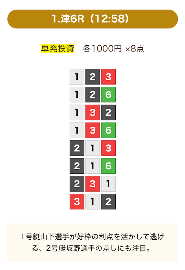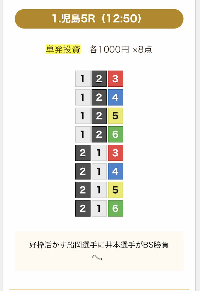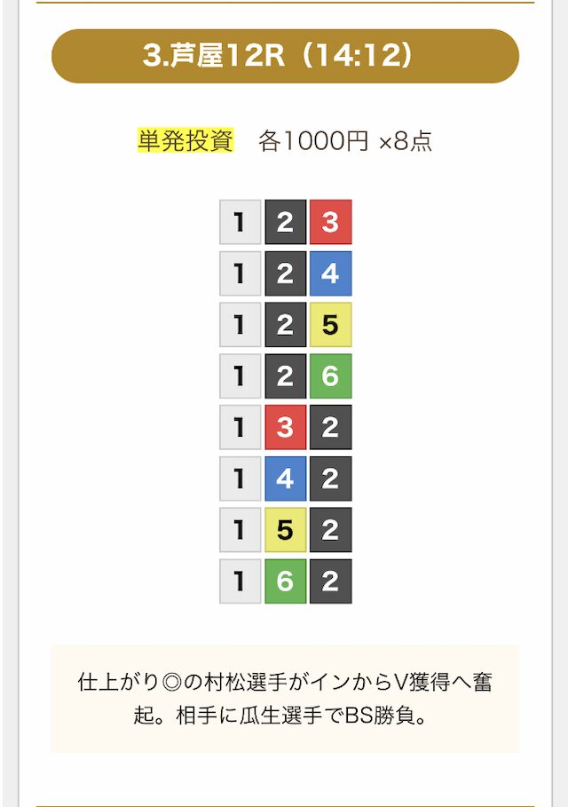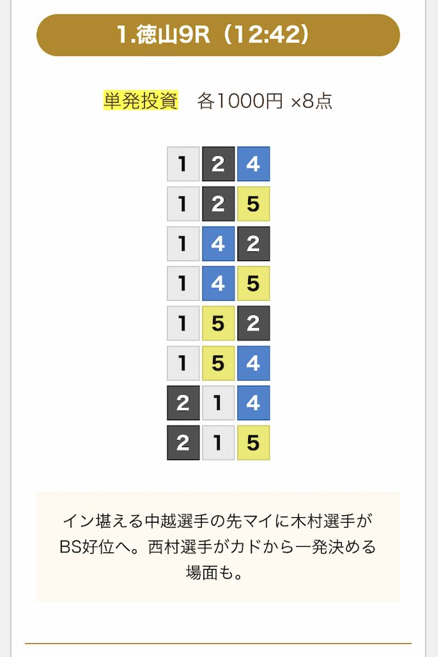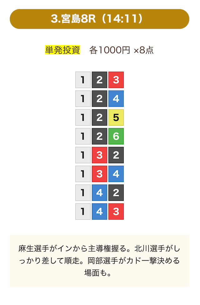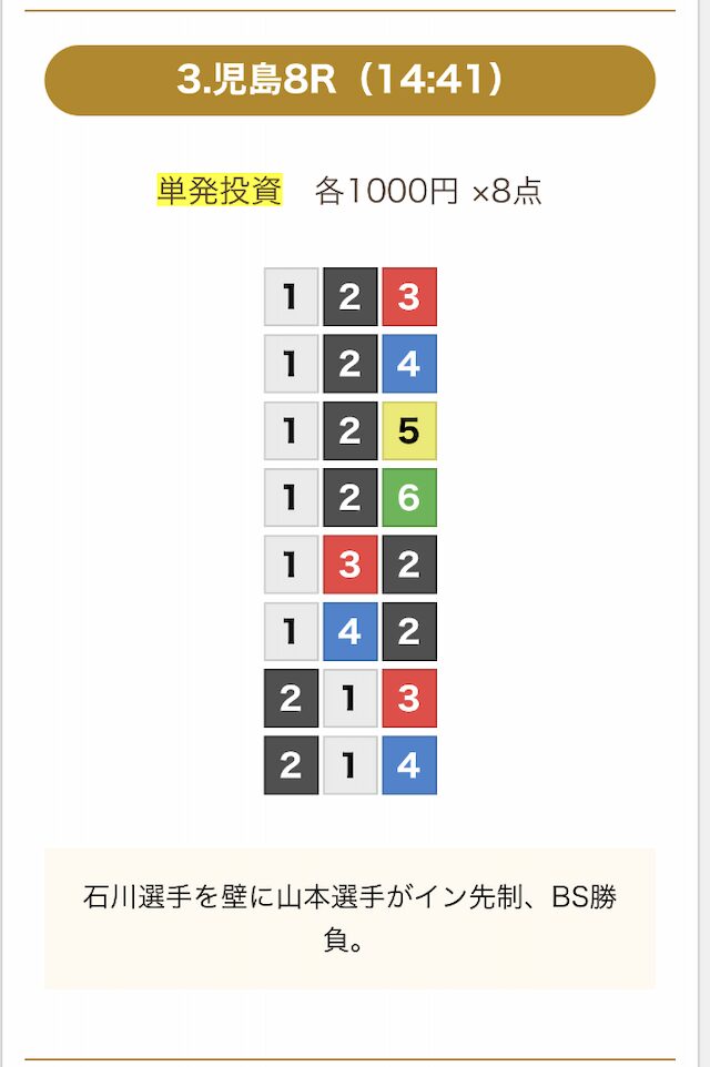 POINTポイント①.本命決着でも数万円の払い戻し!ポイント②.金額と点数調整がまさにプロ!ポイント③.2連勝で10万円超えのプラスも!- 匿名当たり前みたいに1号艇軸かと思いきや、3号艇から仕掛けて的中。ヒモ荒れまで拾ってくれてたのが地味にすごい。 ちょっと尖ってる構成だけど、変に手数が多くないのがありがたい。