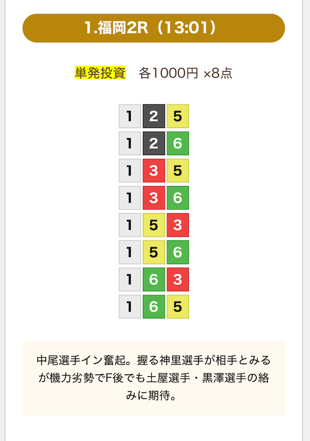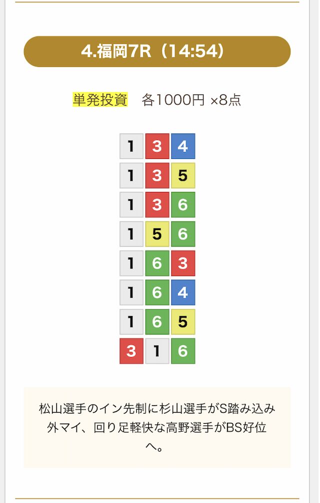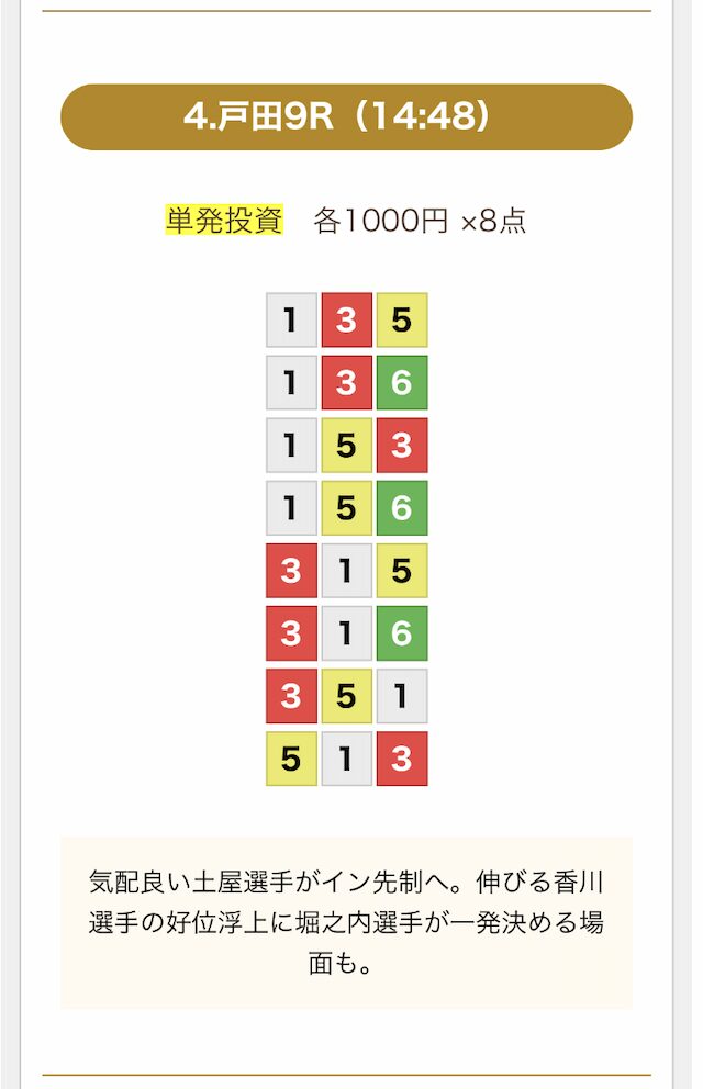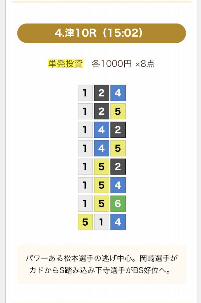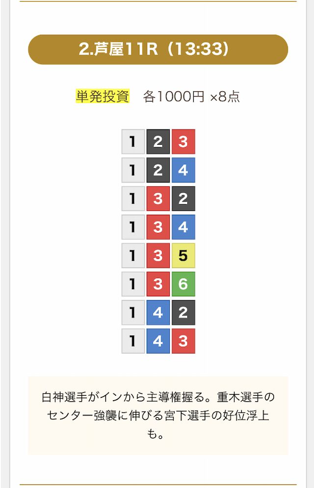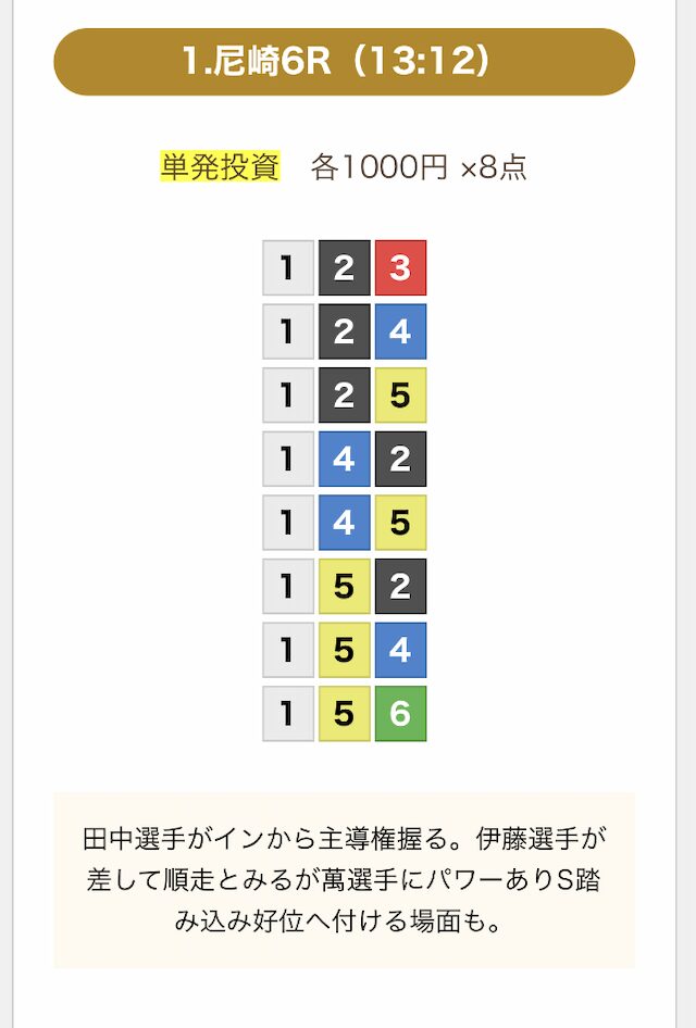 無料とは思えない予想の精度! 数百戦しても的中率の高さは健在! 買い目の点数は常に8点をキープしている。 低コストかつ勝率が高い予想で勝負可能! |