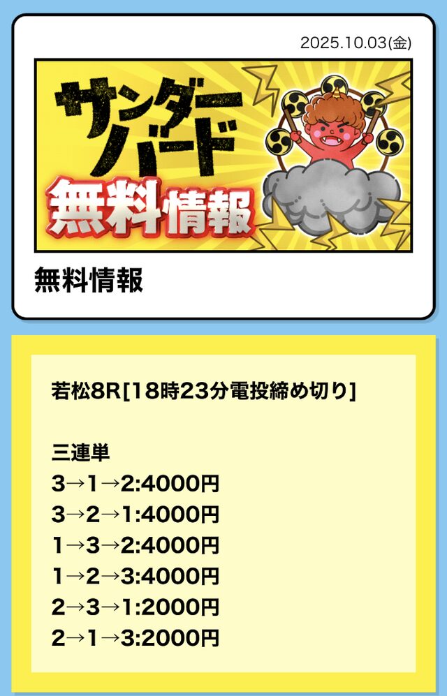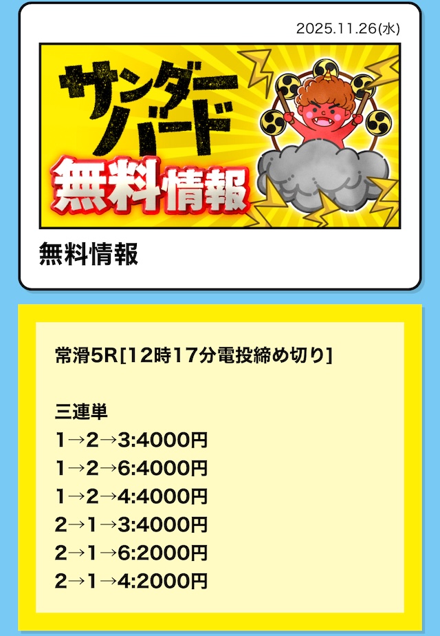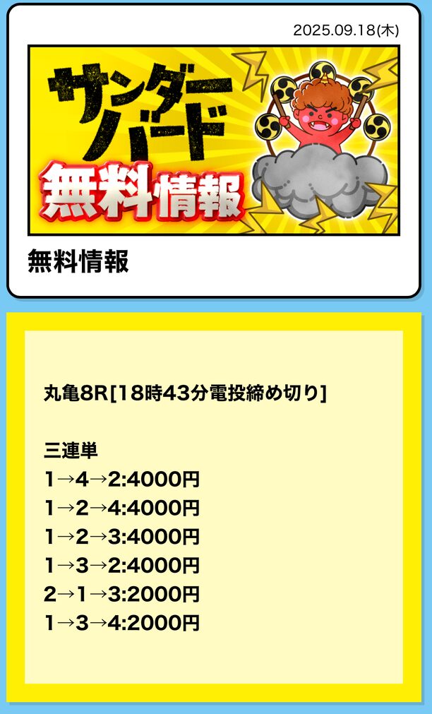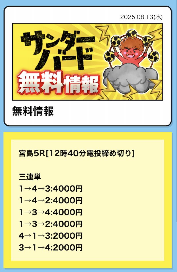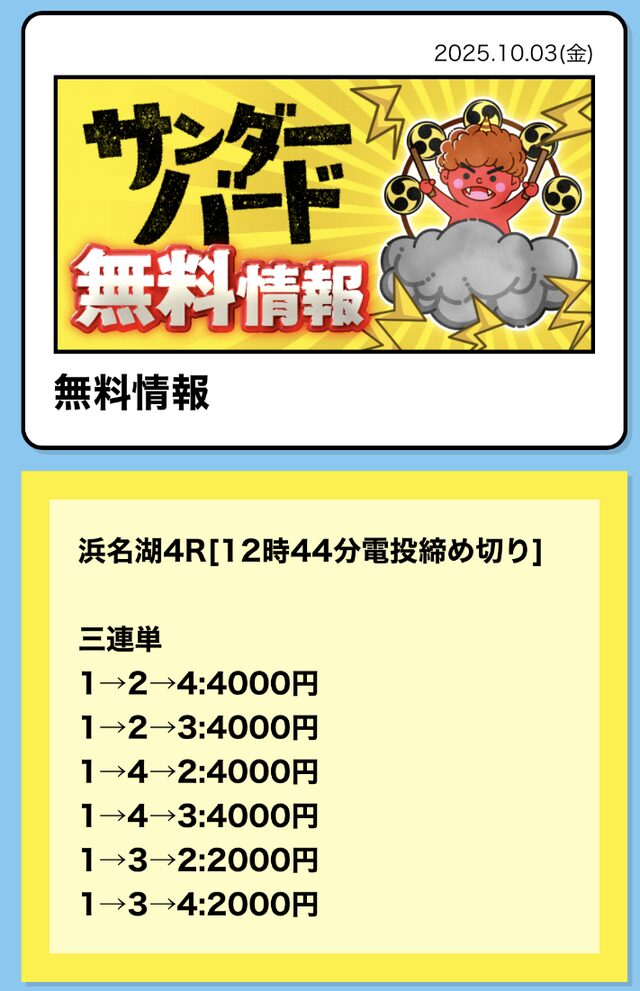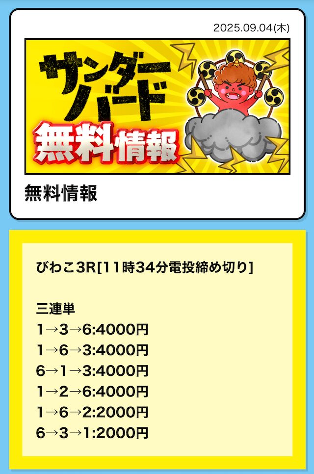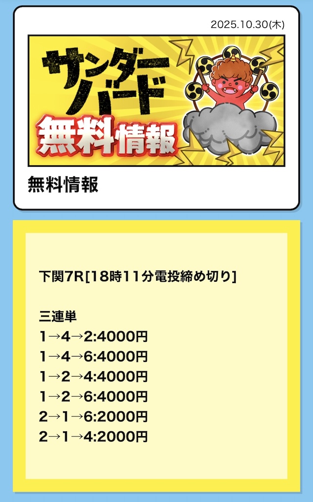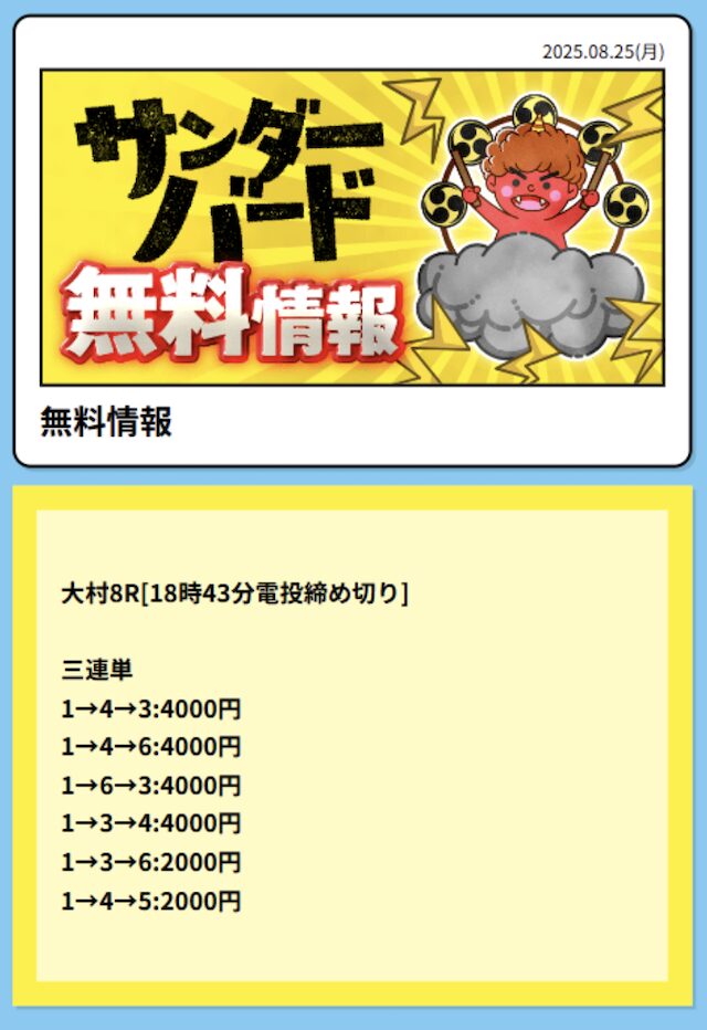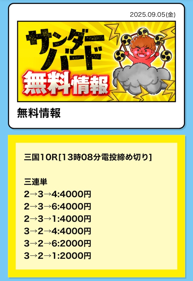 早速、アンケートの回答をもとに競艇サンダーバードの無料予想に参加して検証していきます。