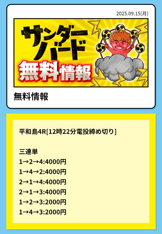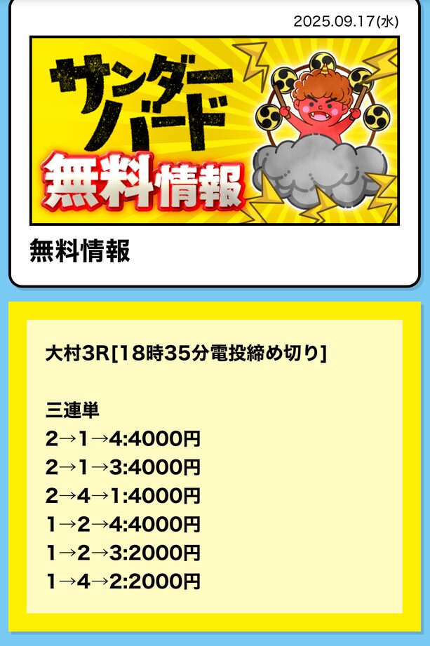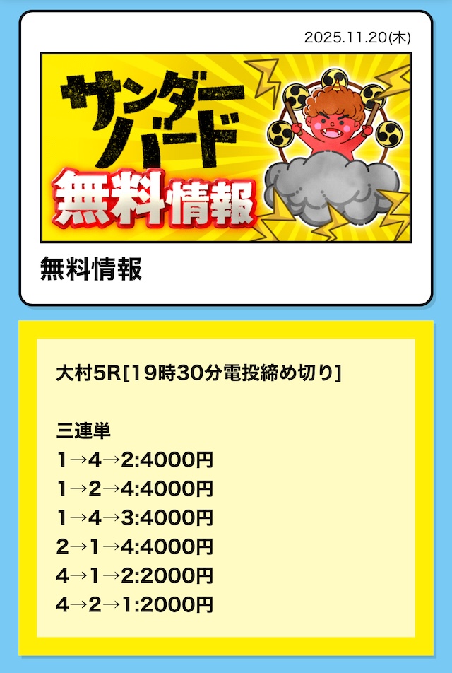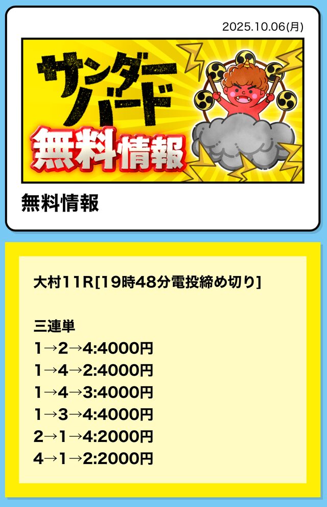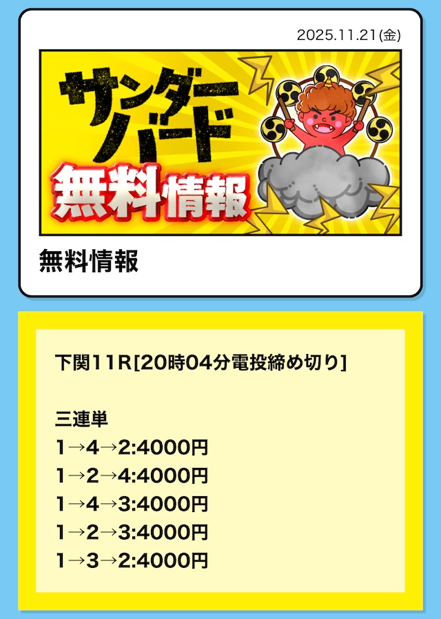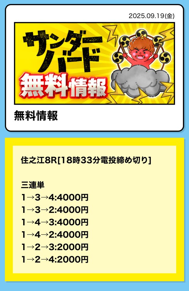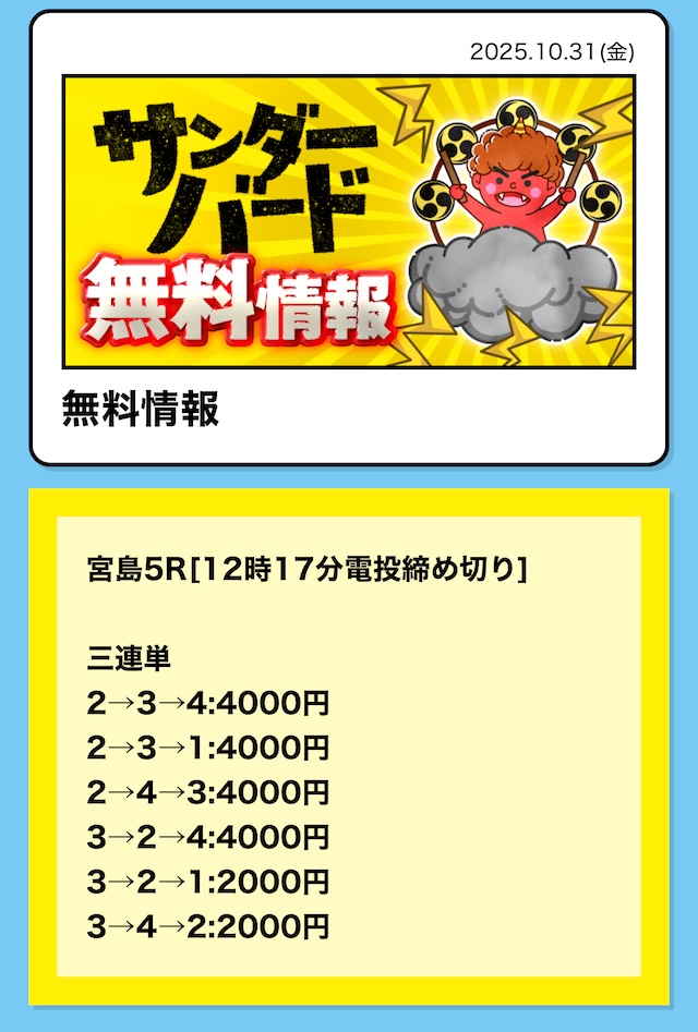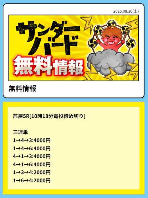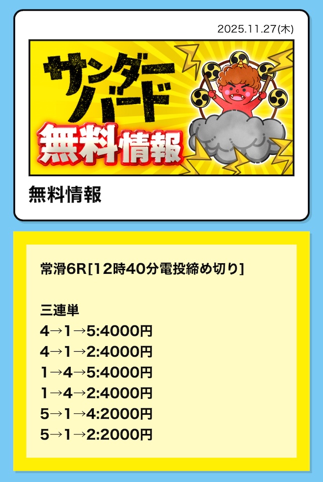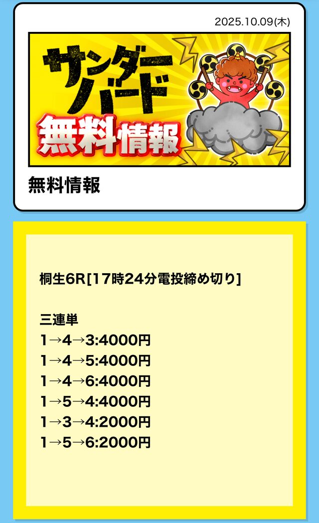 早速、アンケートの回答をもとに競艇サンダーバードの無料予想に参加して検証していきます。