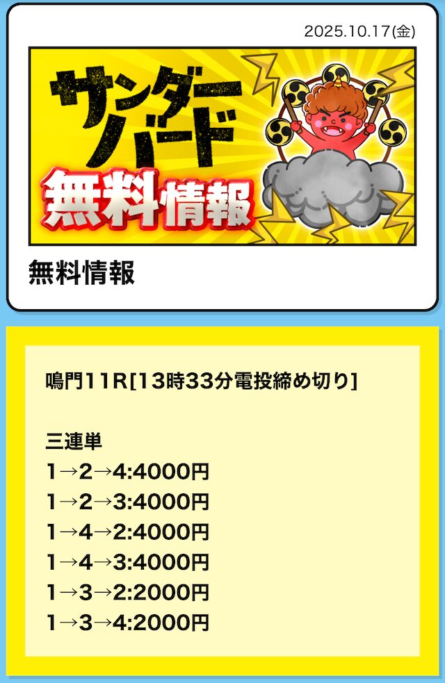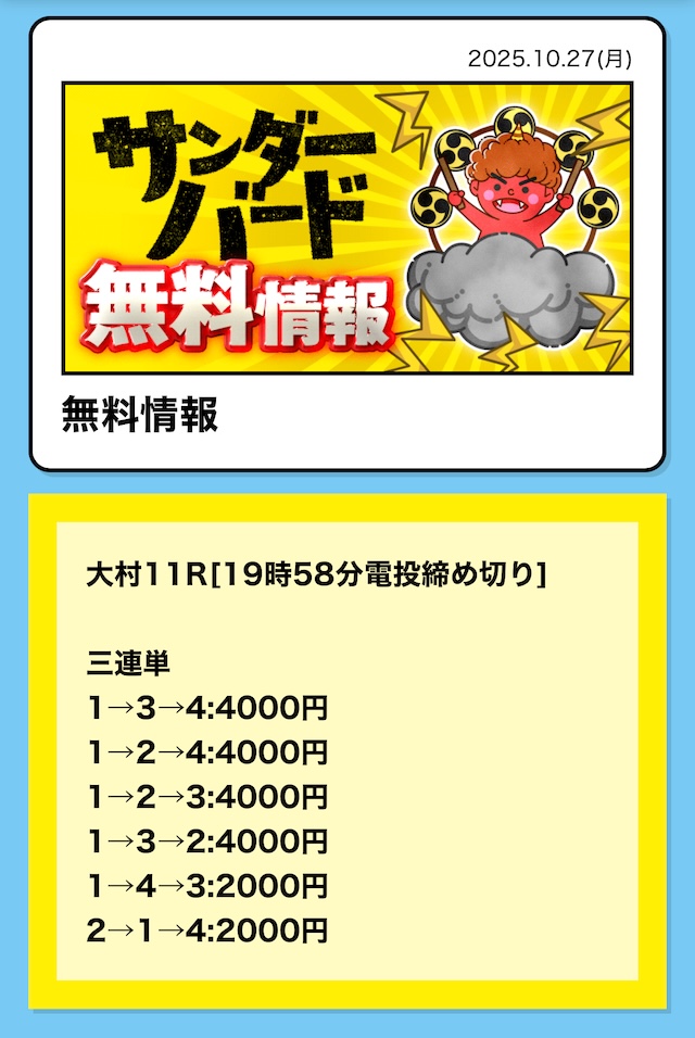 一撃特化のサイトが登場! 無料予想でも10万円以上の払戻実績アリ! 有料予想を使えば、たったの数日で年収レベルを稼ぐことも可能です! | |