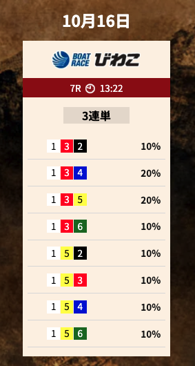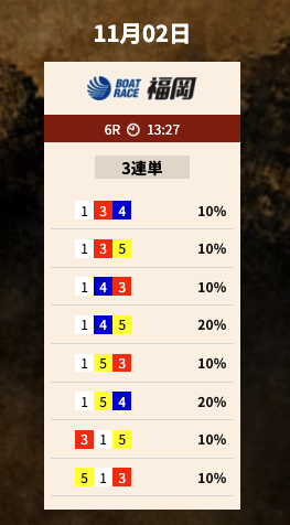 唯一A2級選手であり当地勝率がずば抜けて高い3号艇と、インコースの1号艇を軸に予想。