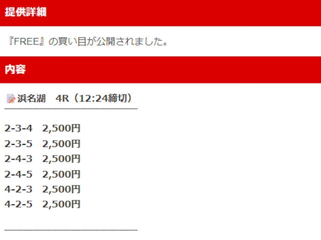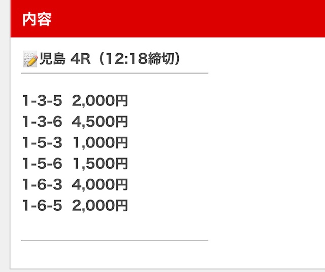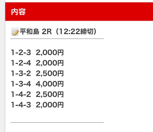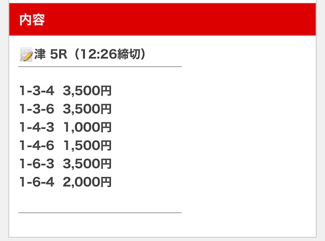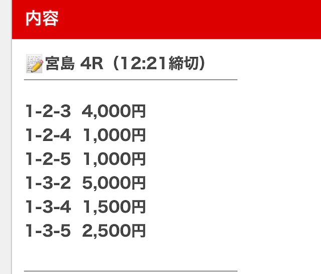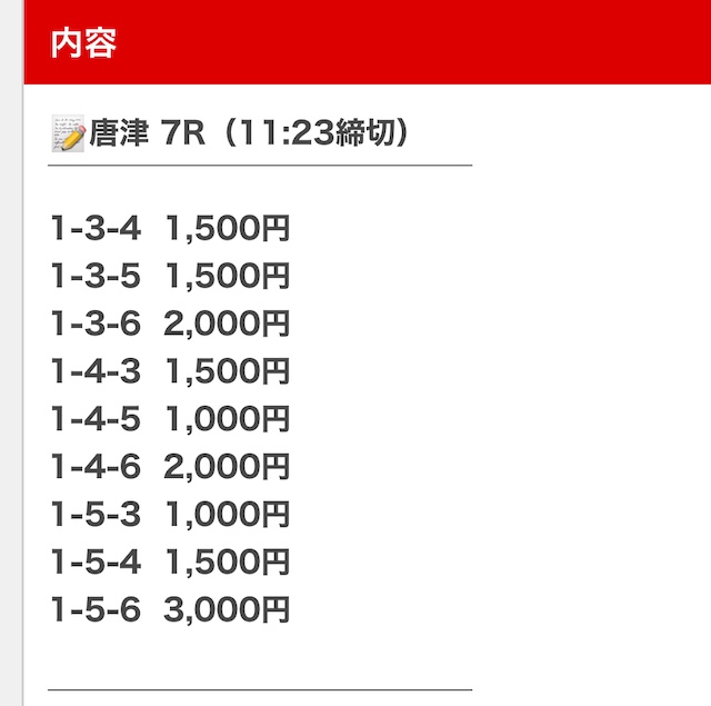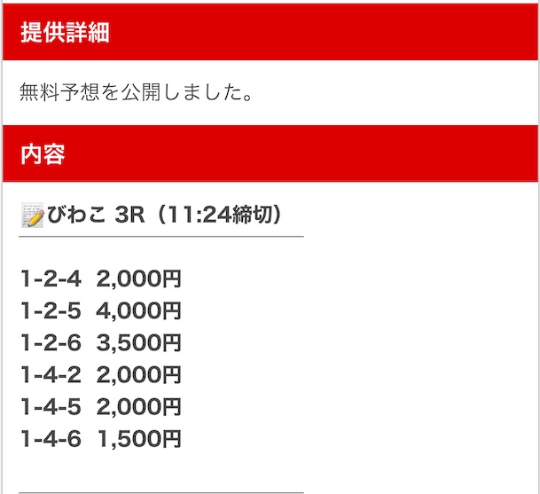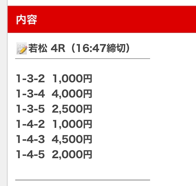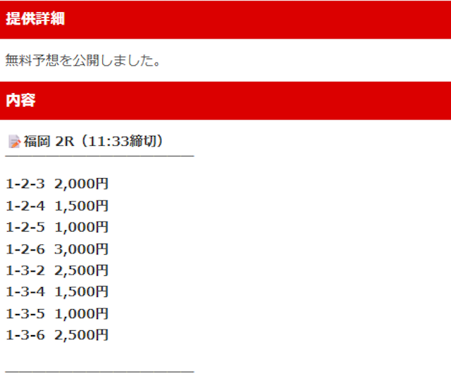 × | 有料プランを購入したが予想買い目が 時間になっても送られてこない。 そのあとサイトにアクセスできなくなった。 |