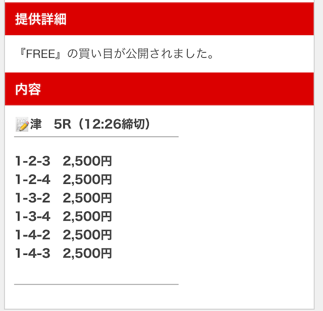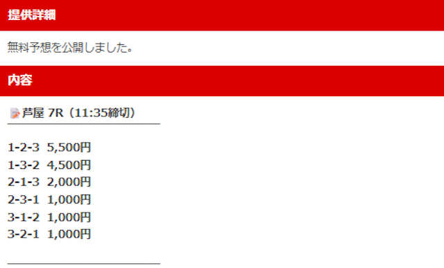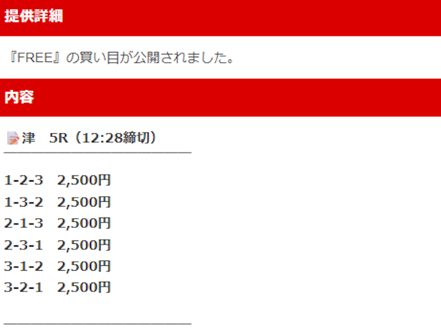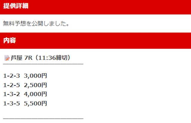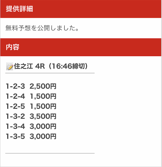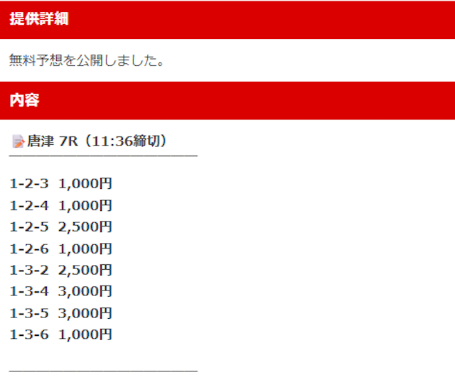 ◯ | 実際に購入した有料予想の 的中結果がそのまま掲載されていた |