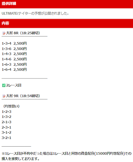 高配当ではないけど、利益は残せる予想。 - 有料予想はオッズ30〜100倍になるようなレースを選んでいる。
