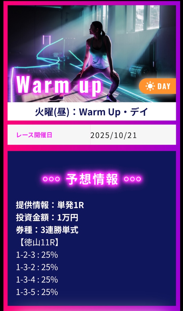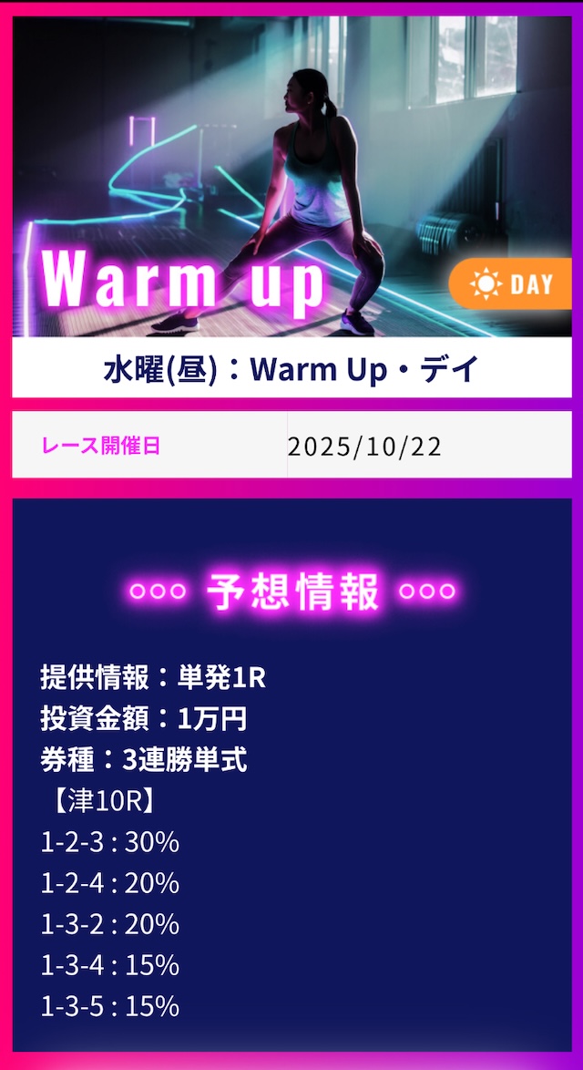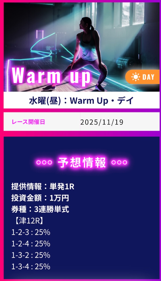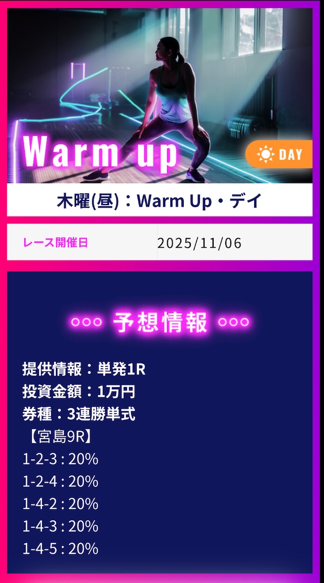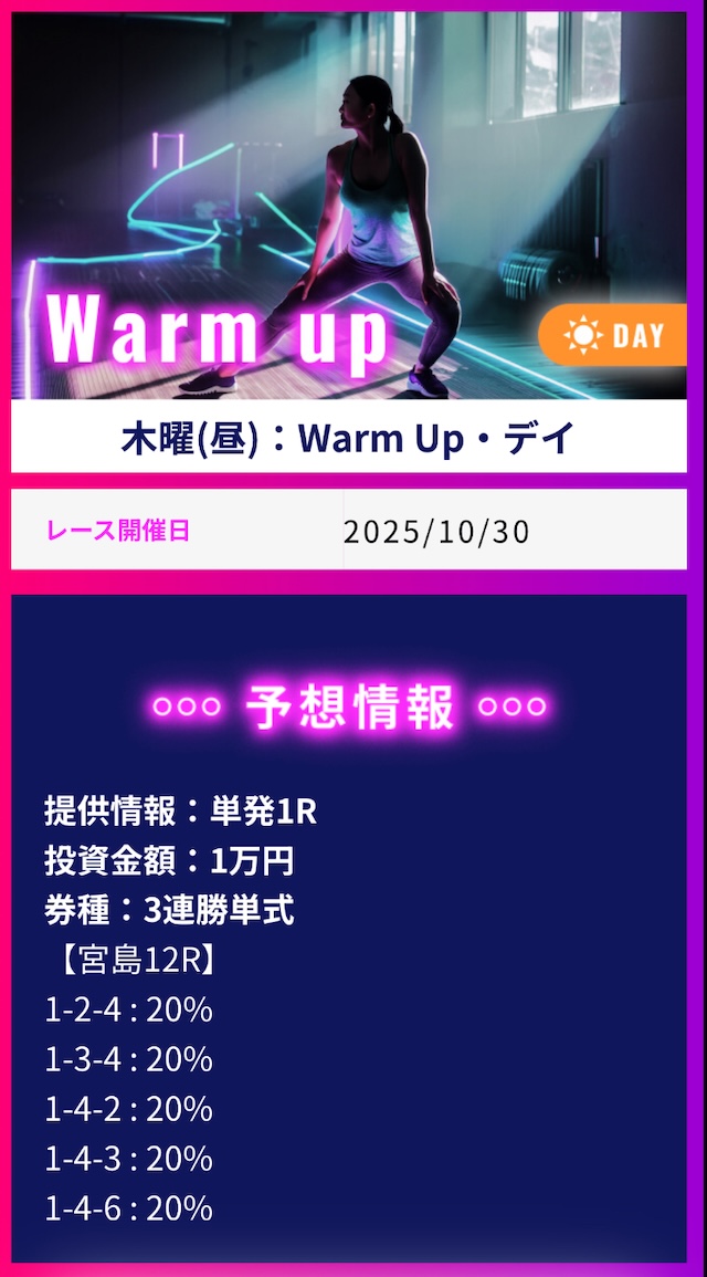 的中率たかい!なんか一撃でデカく稼ぎます、みたいなサイト多くて全然当たらなくて時々本当に当たるんだけどトータルマイナスみたいなサイトばっかだったんだけど、ワークアウトはかなり当たるので使いやすいです!