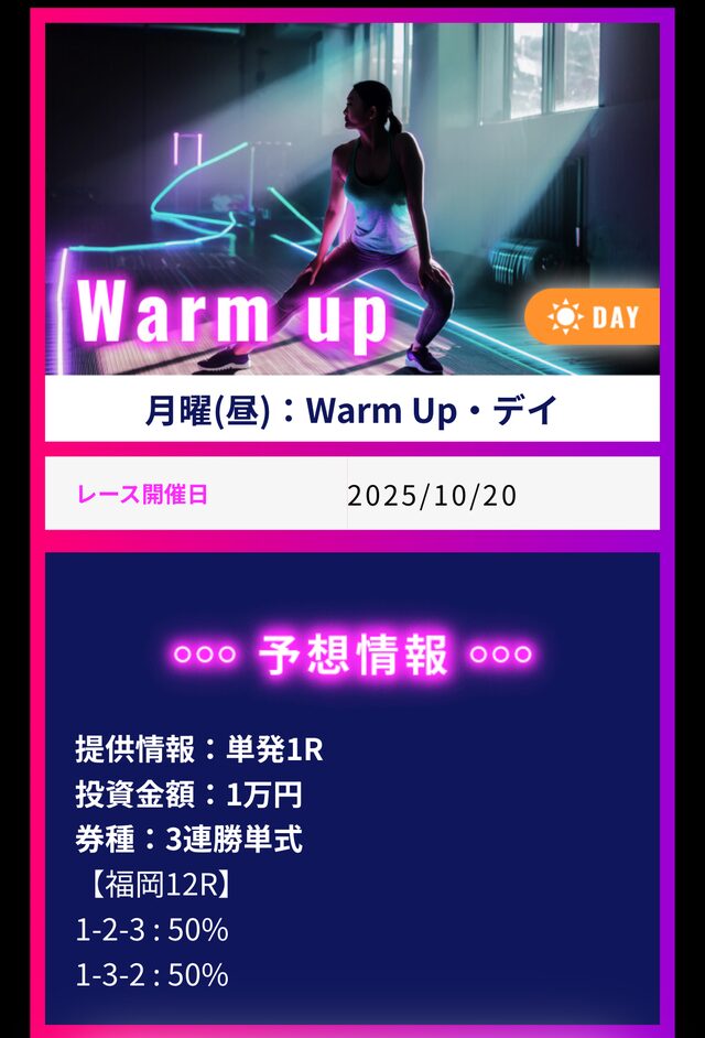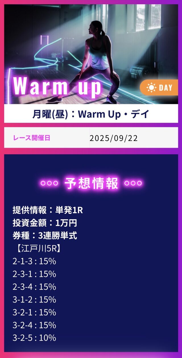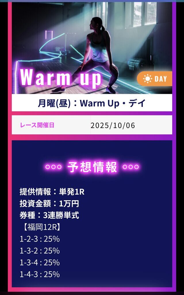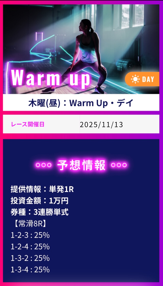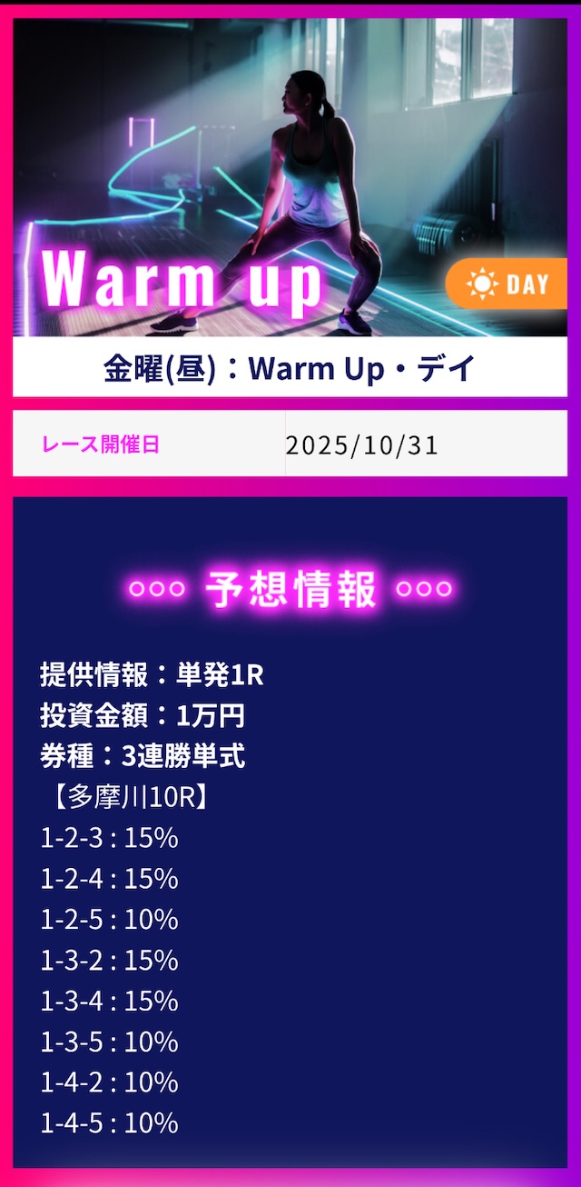 的中率たかい!なんか一撃でデカく稼ぎます、みたいなサイト多くて全然当たらなくて時々本当に当たるんだけどトータルマイナスみたいなサイトばっかだったんだけど、ワークアウトはかなり当たるので使いやすいです!