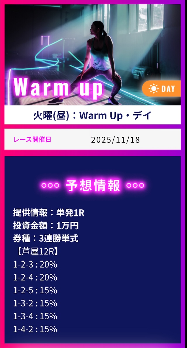 競艇ワークアウトは、無料・有料関係なく制度が抜群! しかも、LINEで簡単に利用可能! もちろん無料なので、ぜひ使ってみてください! | |