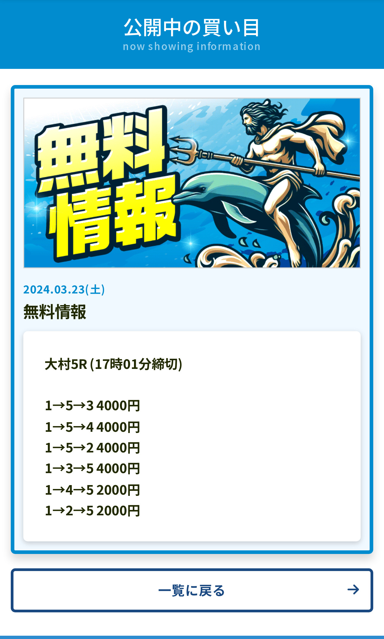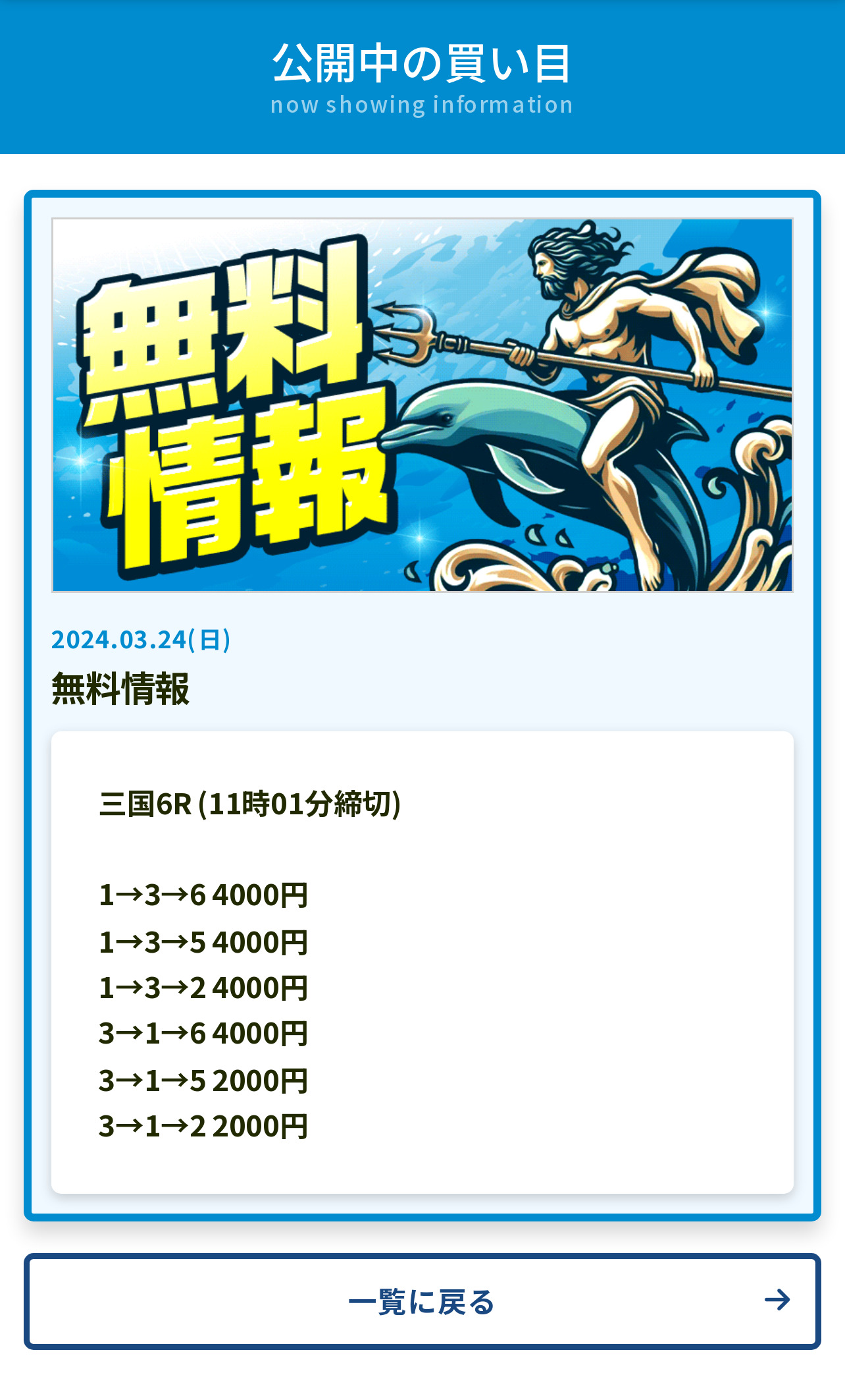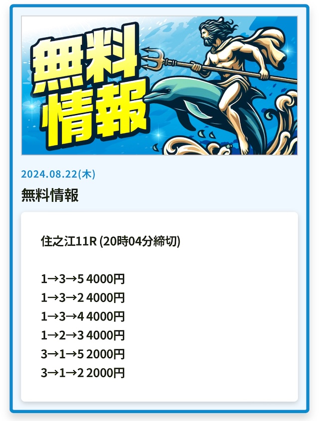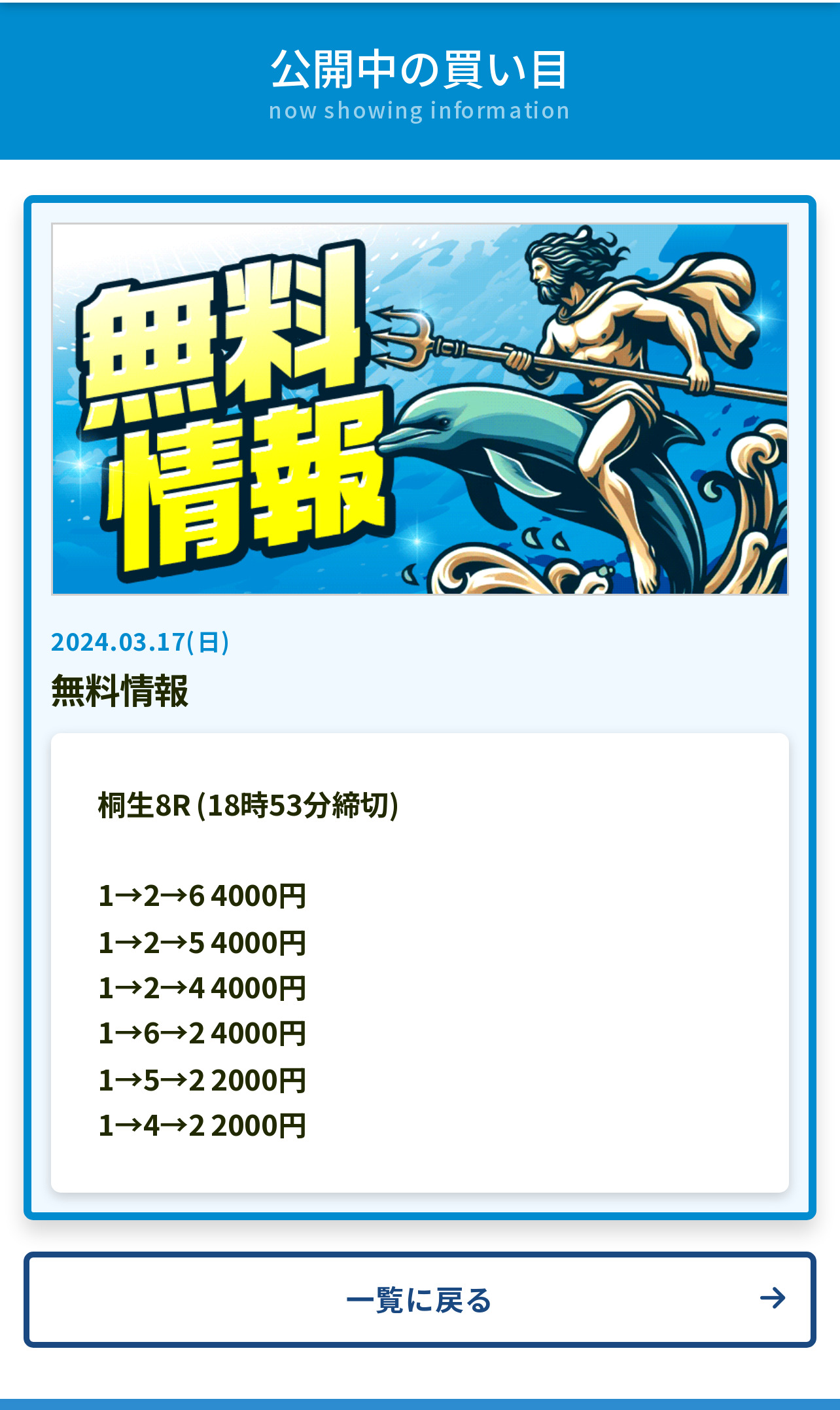 POINTポイント①.一撃で6万円を超える払戻金を獲得!ポイント②.6連勝も実現させる予想の精度!ポイント③.登録は無料&1万円分のポイントが貰える!- レガリアクレスト100万当たるとか言われた時は「またまた〜」って思ったけど、実際に近い数字叩き出した時は手震えた。