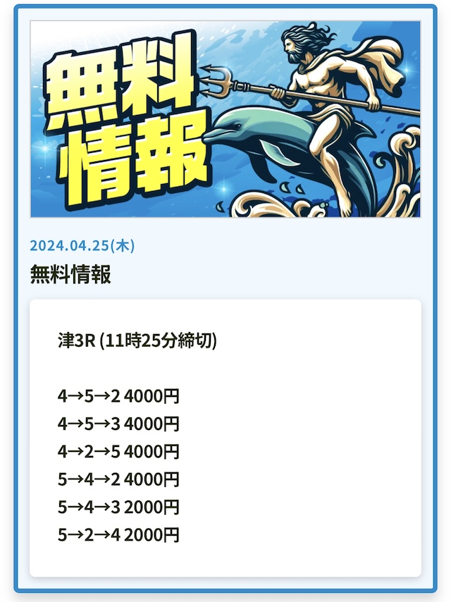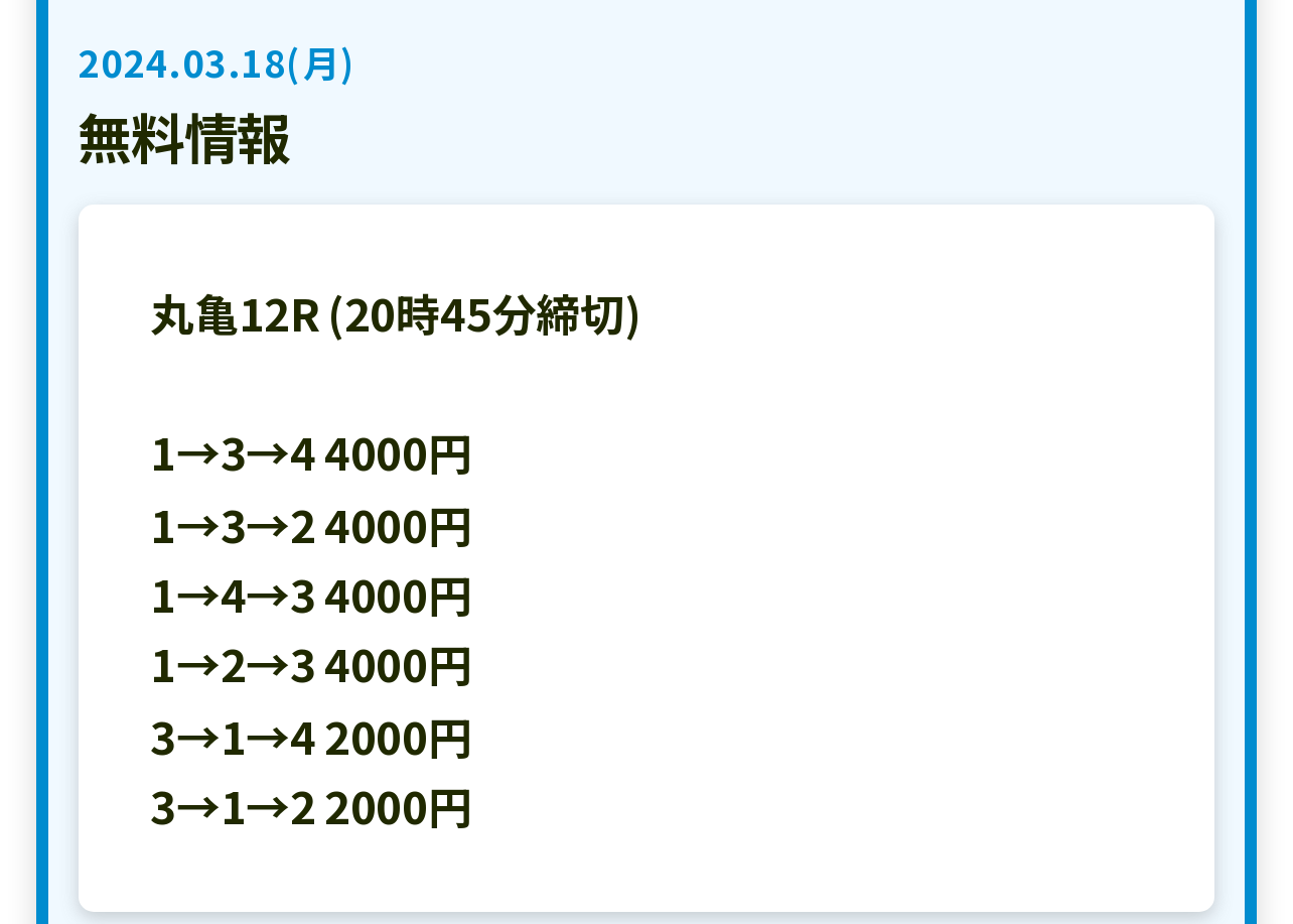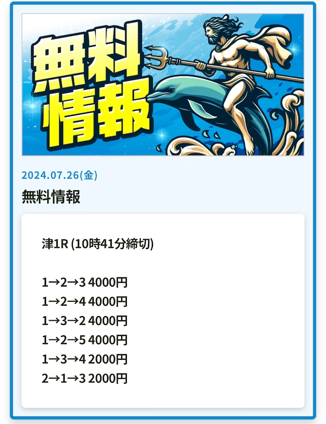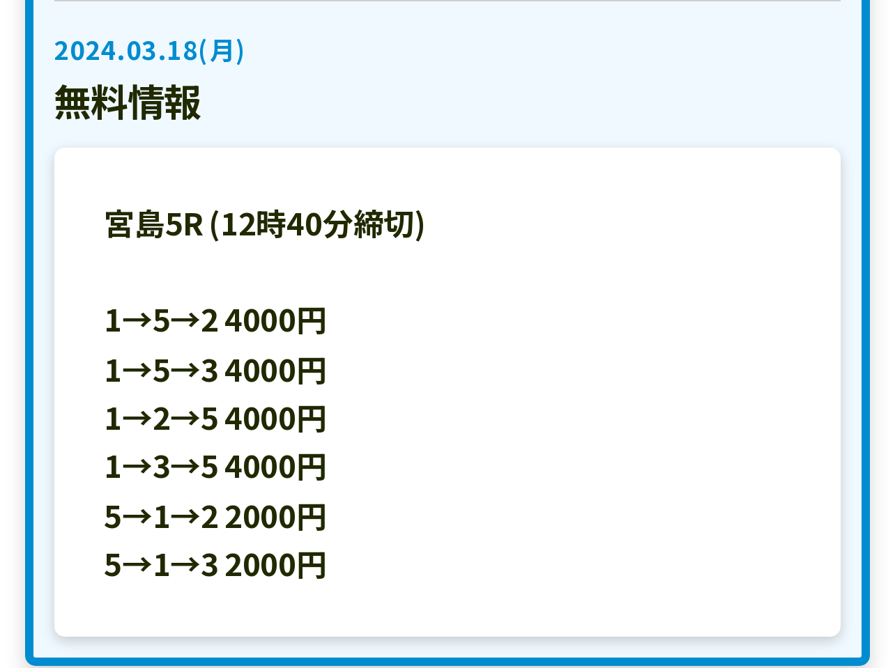 普段の一撃が大きい分、調子が悪い時が目立つ。無料で公開されている予想ってことを考えると仕方ないけど、もう少し調子が安定したら満点かなー