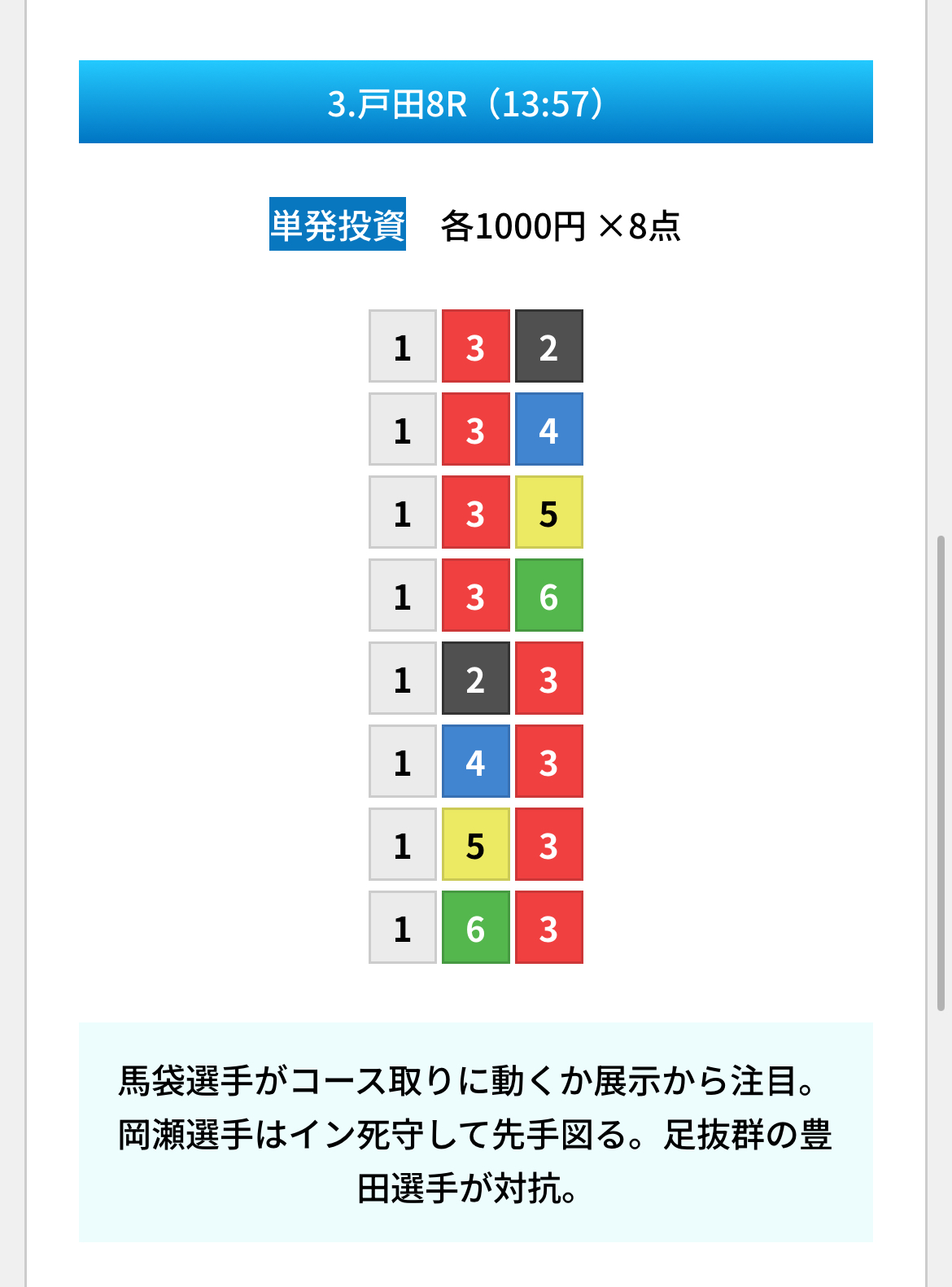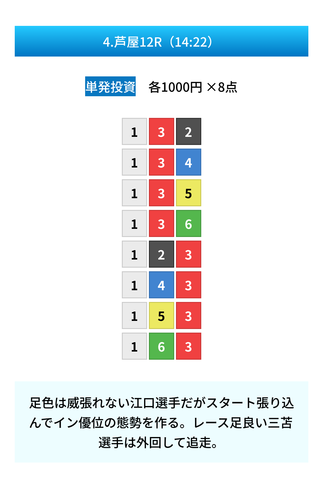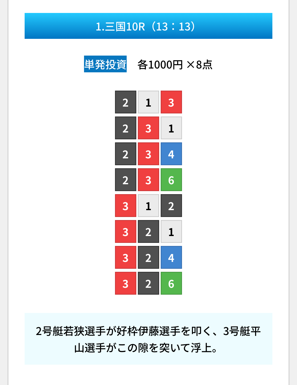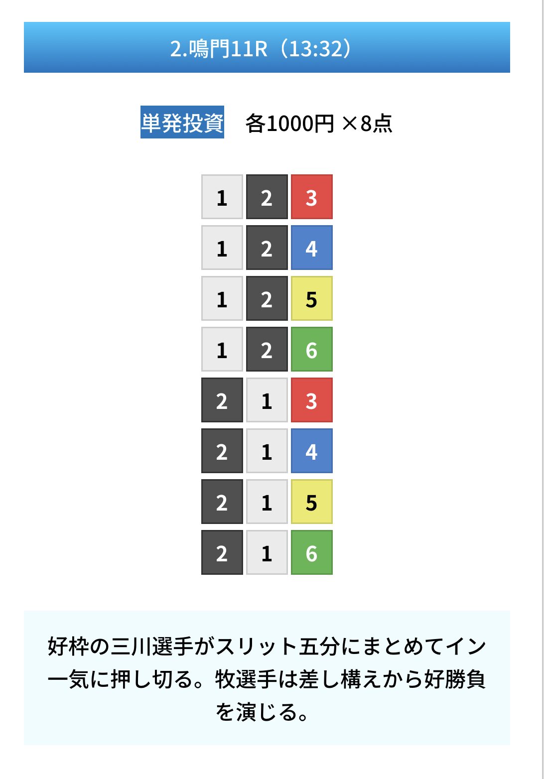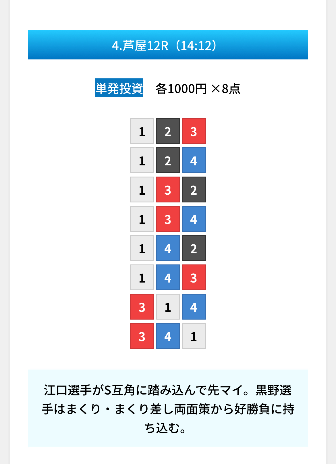 POINTポイント①.本命決着でも数万円の払い戻し!ポイント②.金額と点数調整がまさにプロ!ポイント③.2連勝で10万円超えのプラスも!- 匿名当たり前みたいに1号艇軸かと思いきや、3号艇から仕掛けて的中。ヒモ荒れまで拾ってくれてたのが地味にすごい。 ちょっと尖ってる構成だけど、変に手数が多くないのがありがたい。