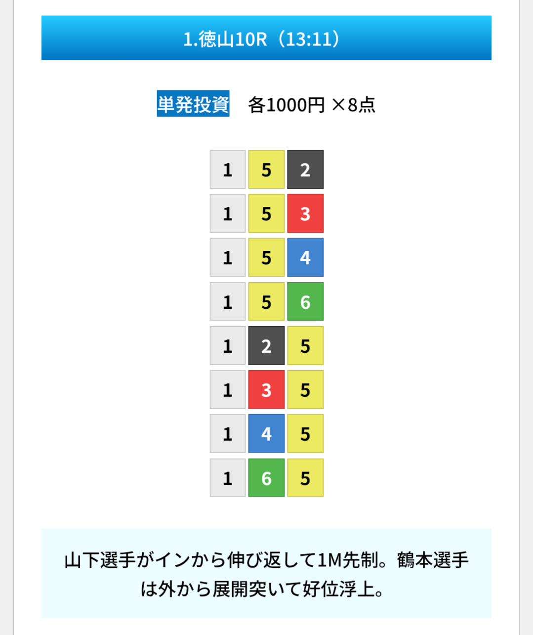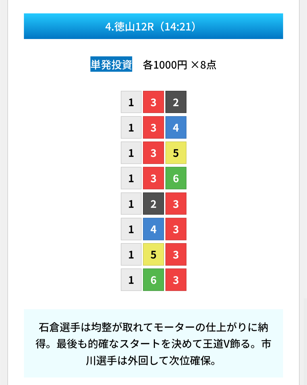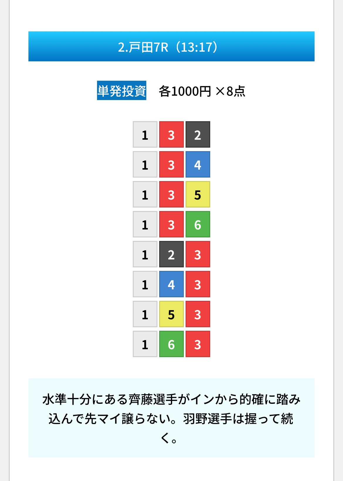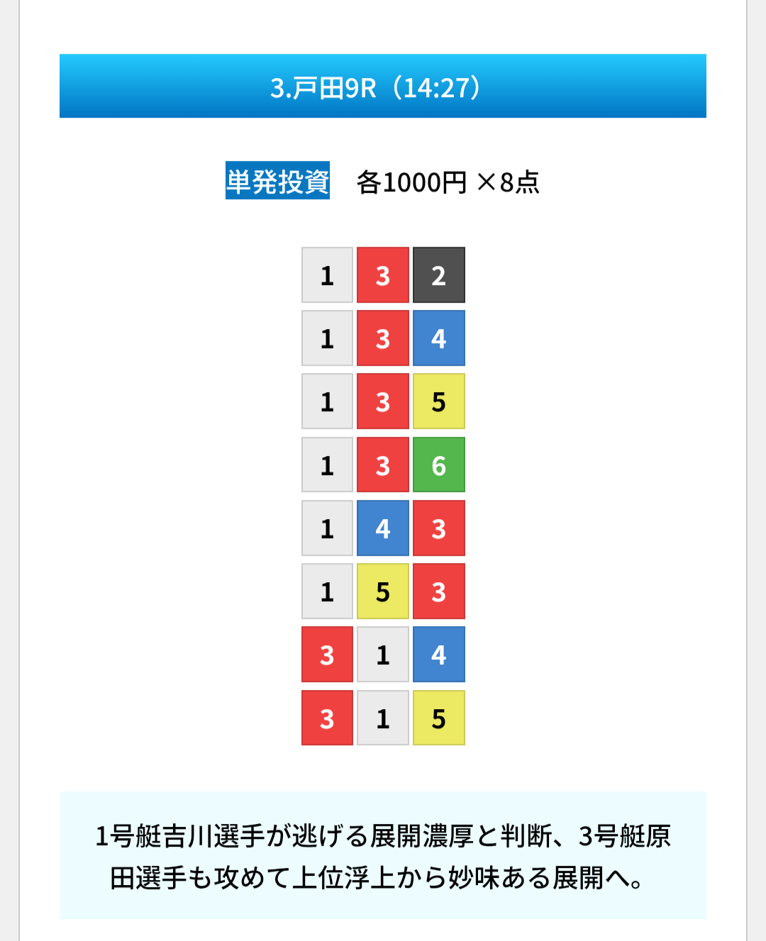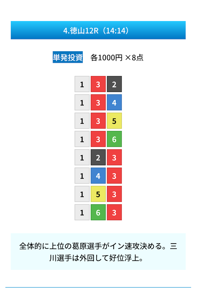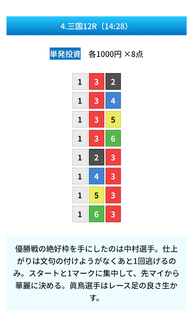 POINTポイント①.本命決着でも数万円の払い戻し!ポイント②.金額と点数調整がまさにプロ!ポイント③.2連勝で10万円超えのプラスも!- 匿名当たり前みたいに1号艇軸かと思いきや、3号艇から仕掛けて的中。ヒモ荒れまで拾ってくれてたのが地味にすごい。 ちょっと尖ってる構成だけど、変に手数が多くないのがありがたい。