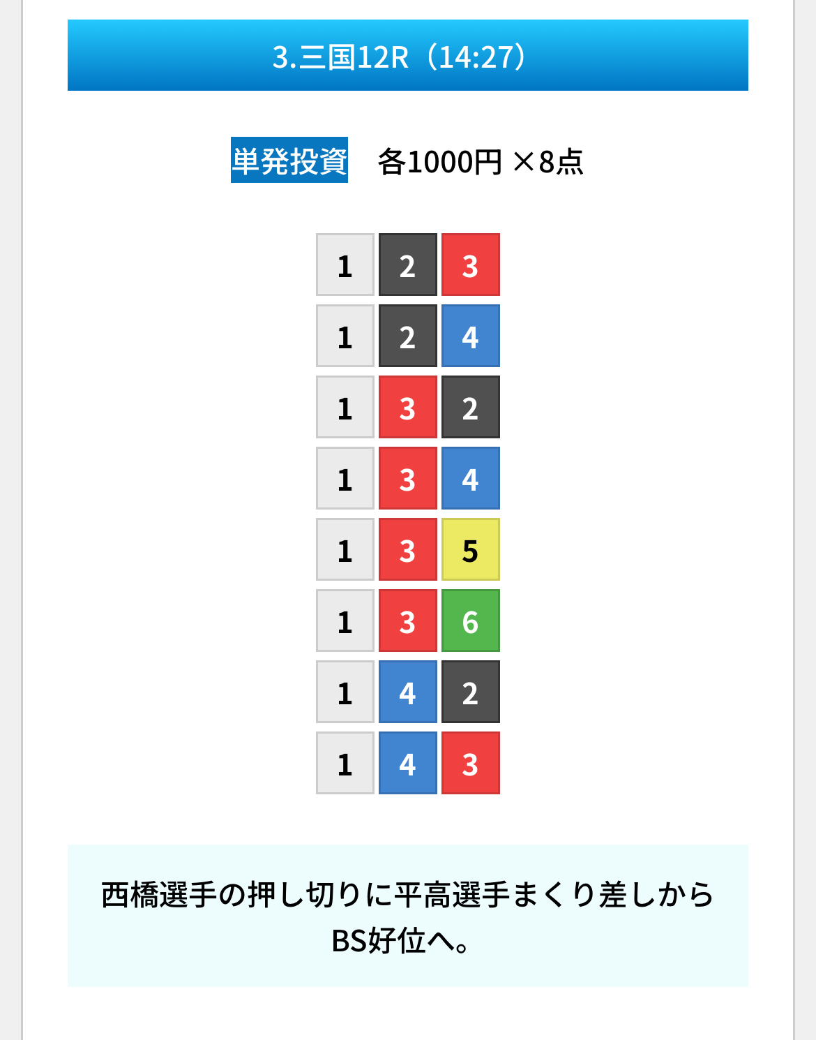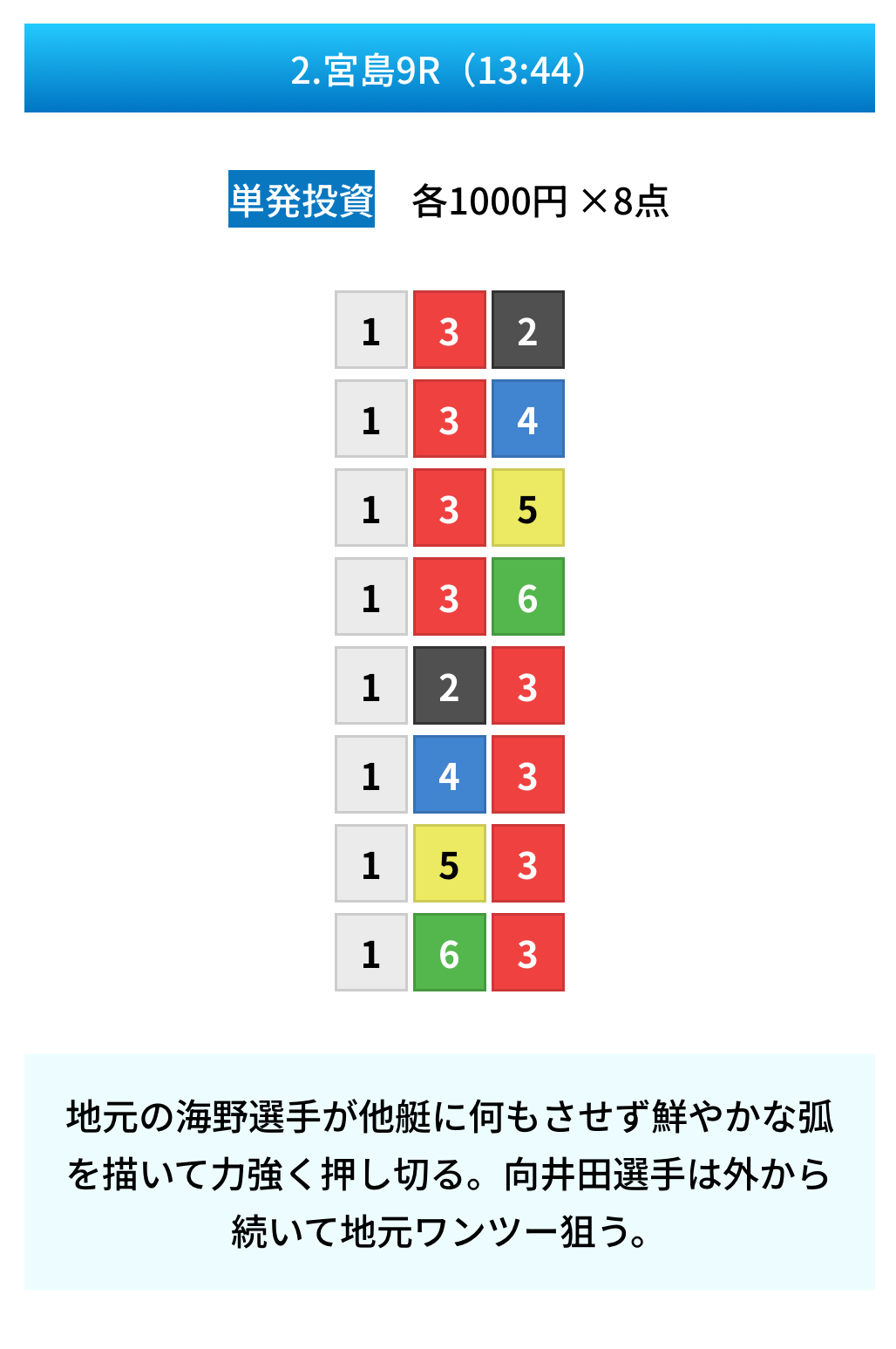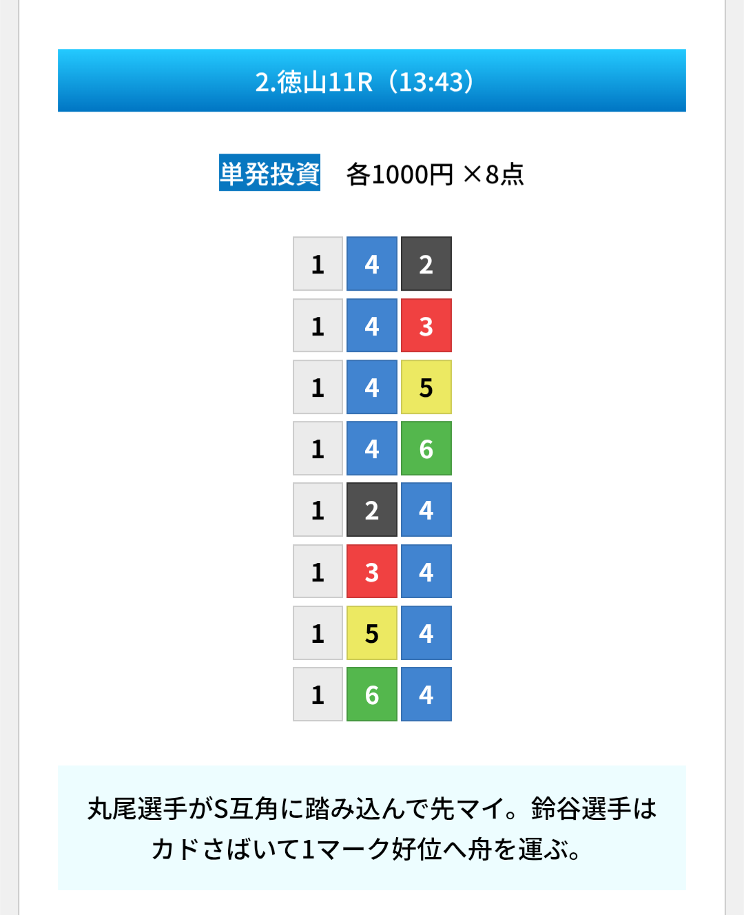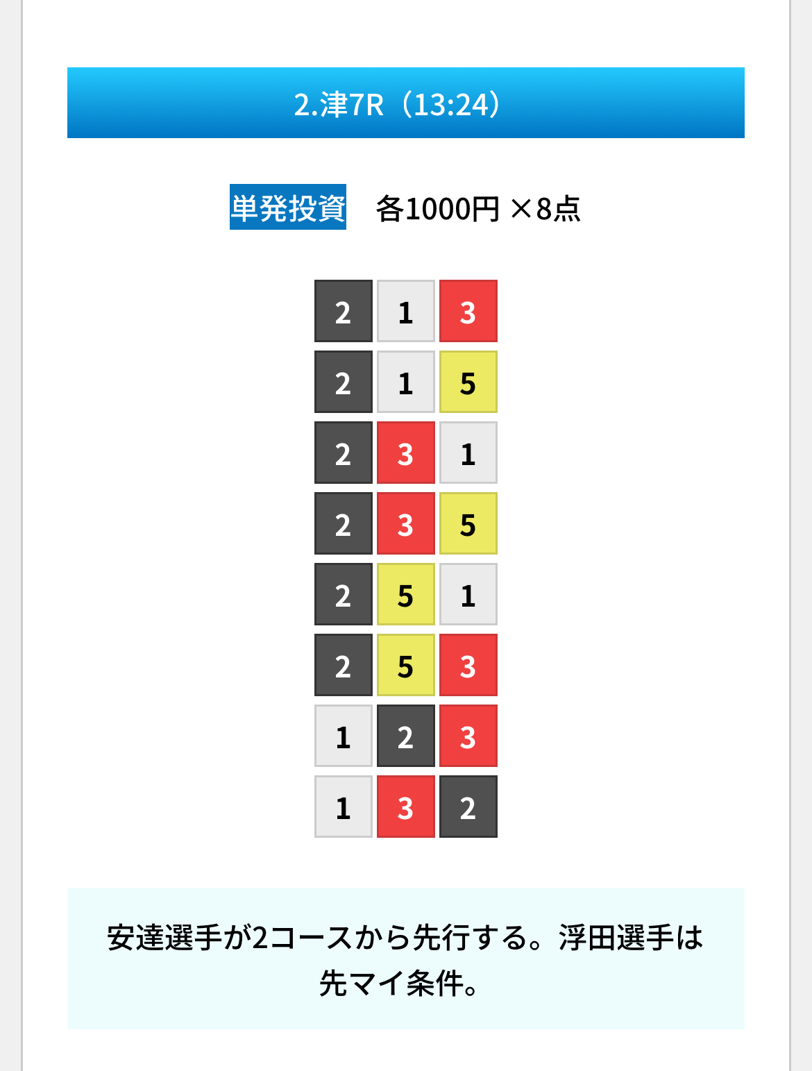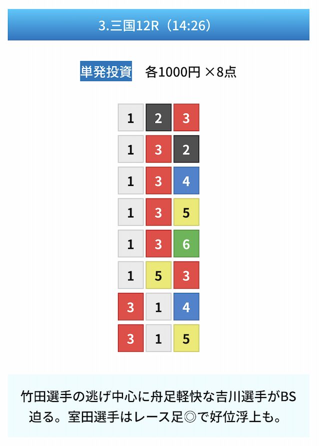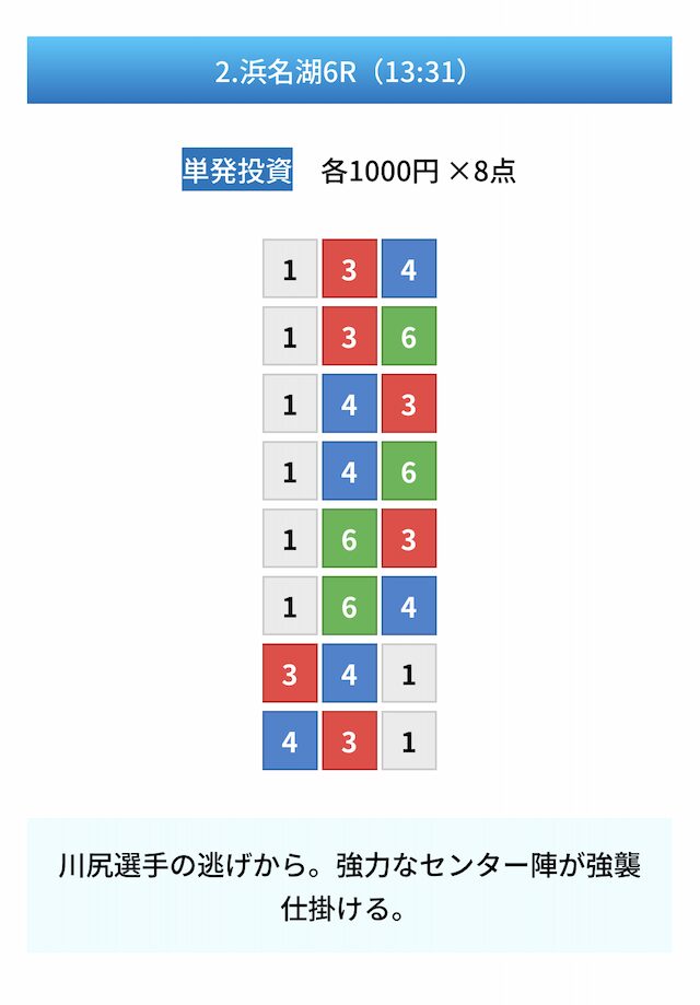 POINTポイント①.本命決着でも数万円の払い戻し!ポイント②.金額と点数調整がまさにプロ!ポイント③.2連勝で10万円超えのプラスも!- 匿名当たり前みたいに1号艇軸かと思いきや、3号艇から仕掛けて的中。ヒモ荒れまで拾ってくれてたのが地味にすごい。 ちょっと尖ってる構成だけど、変に手数が多くないのがありがたい。