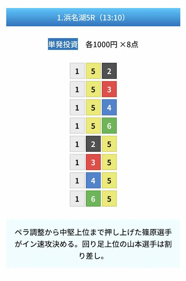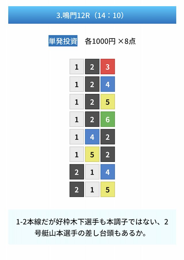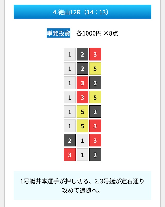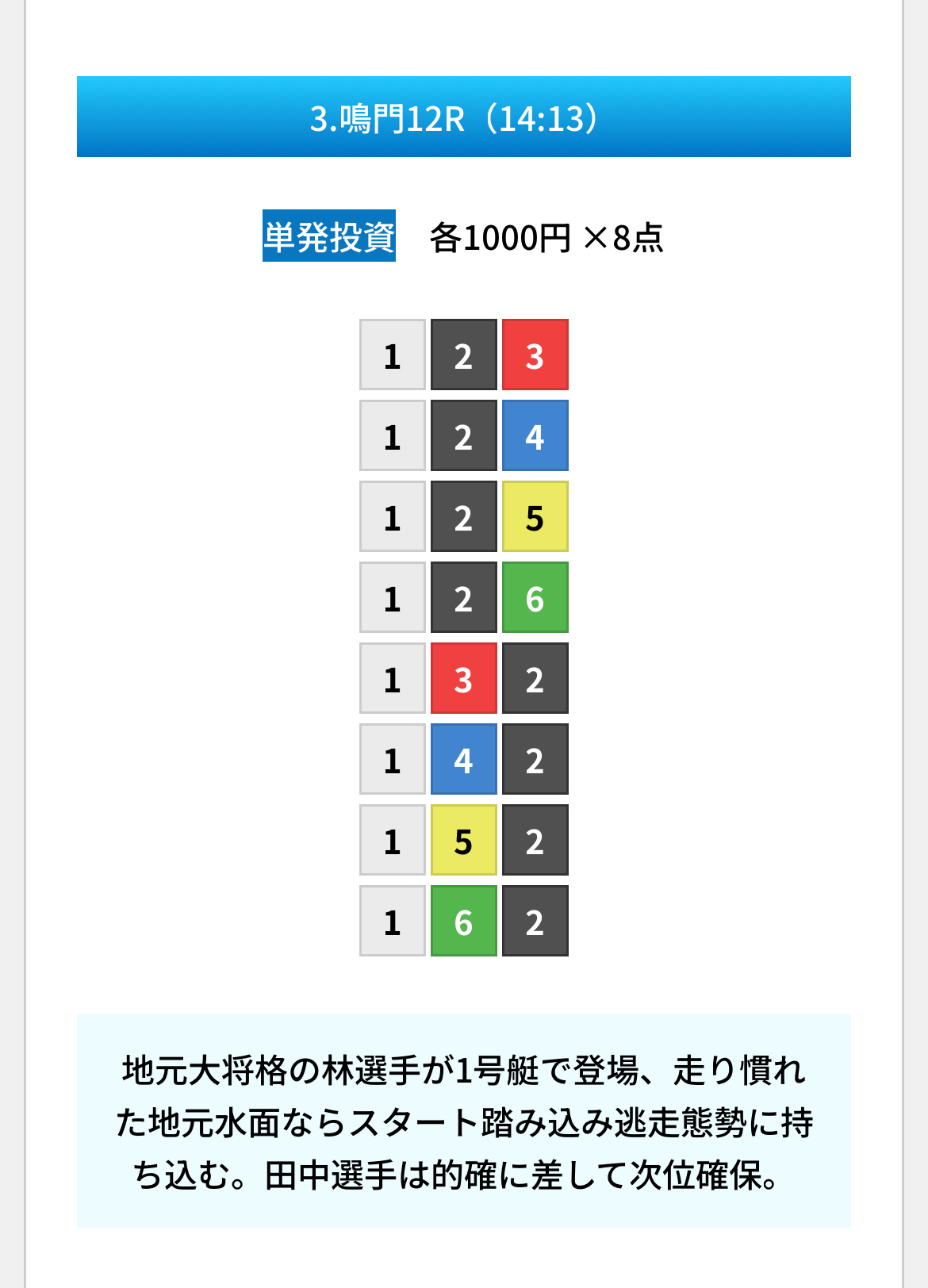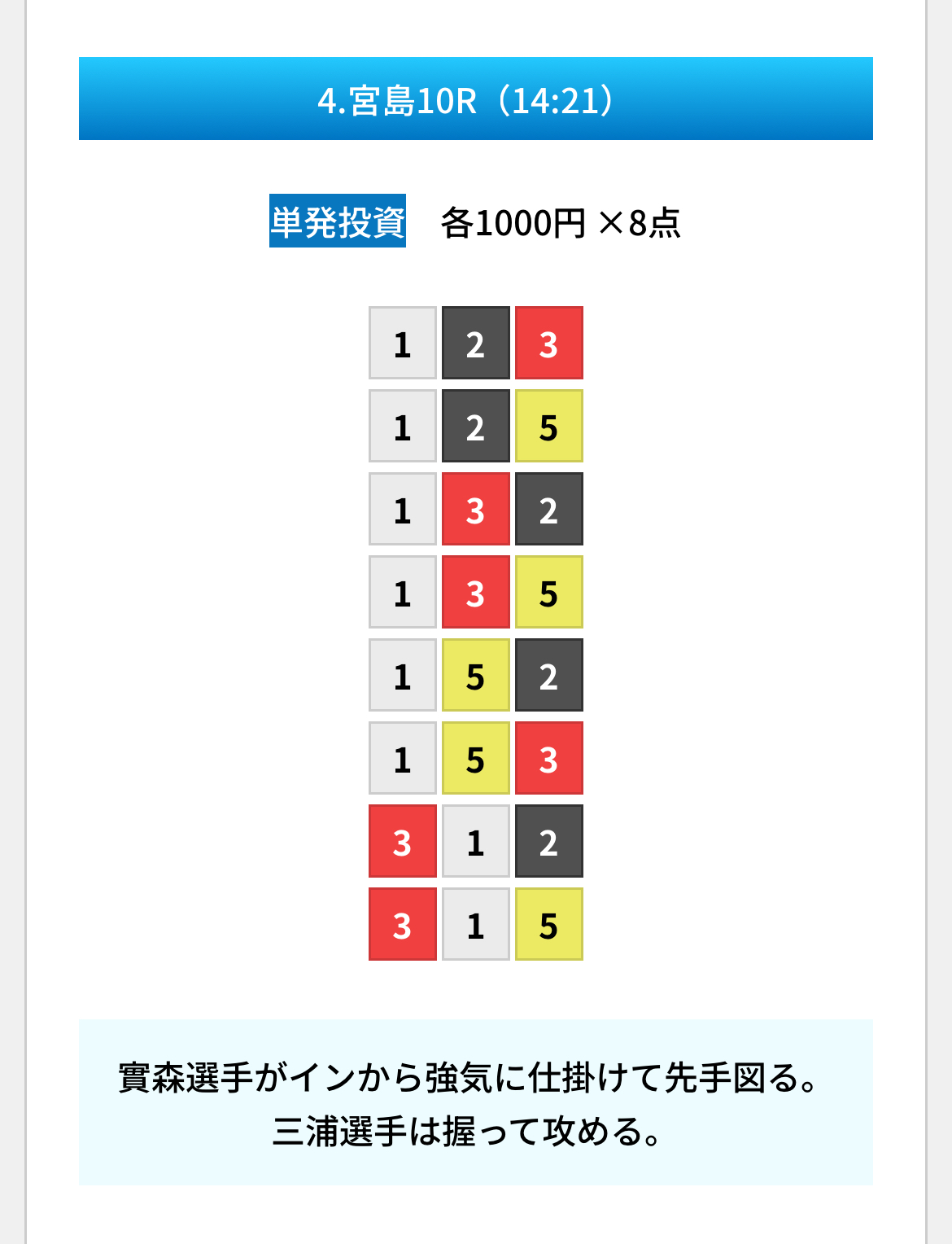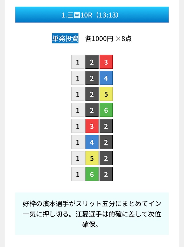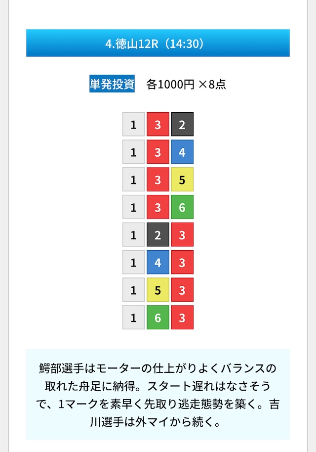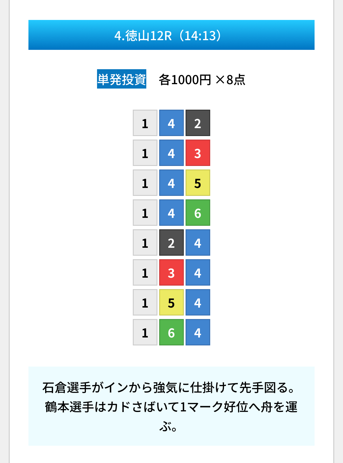 POINTポイント①.本命決着でも数万円の払い戻し!ポイント②.金額と点数調整がまさにプロ!ポイント③.2連勝で10万円超えのプラスも!- 匿名当たり前みたいに1号艇軸かと思いきや、3号艇から仕掛けて的中。ヒモ荒れまで拾ってくれてたのが地味にすごい。 ちょっと尖ってる構成だけど、変に手数が多くないのがありがたい。