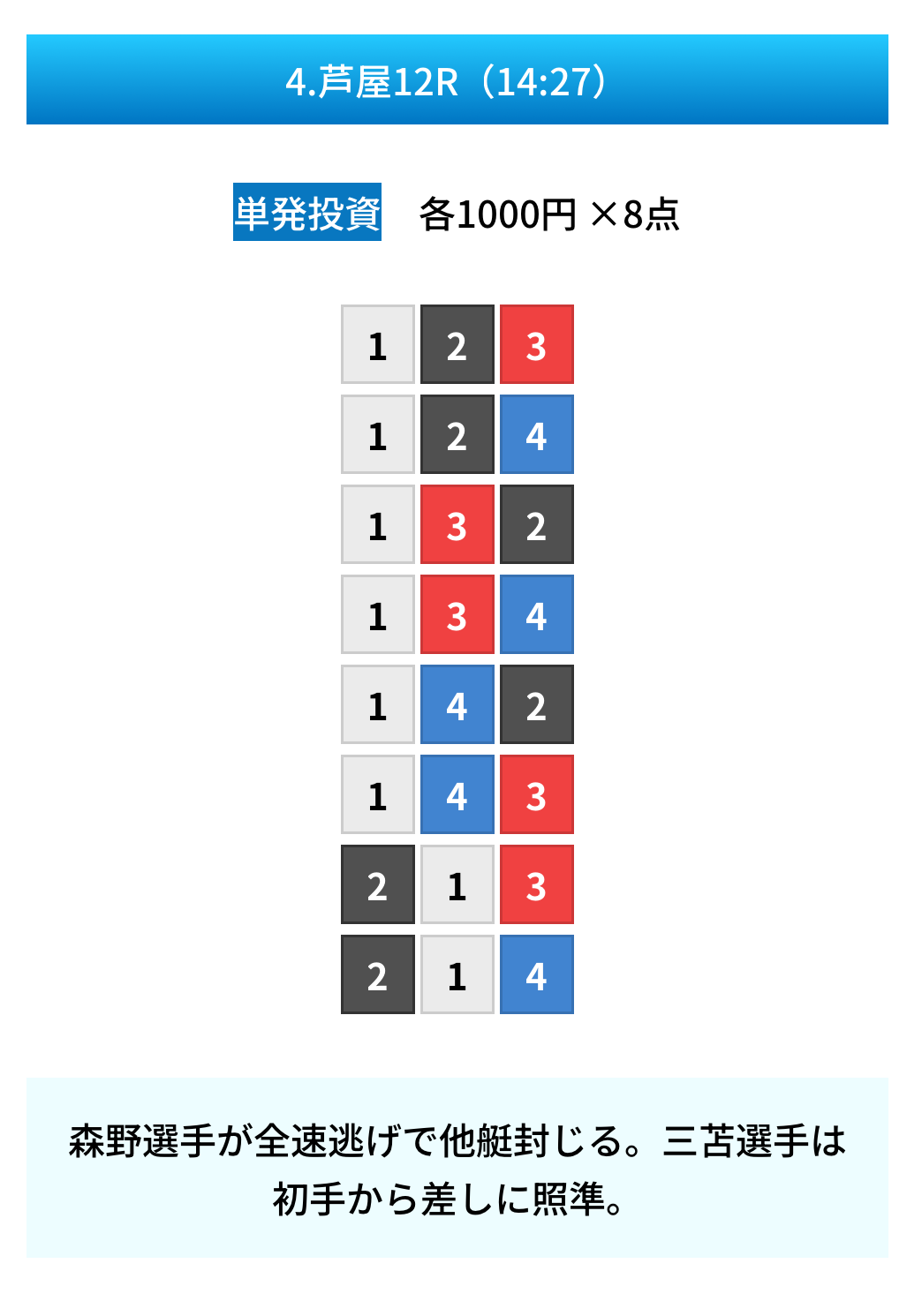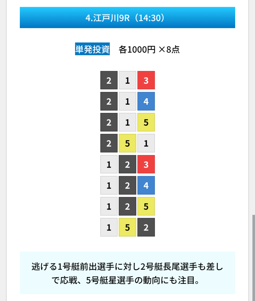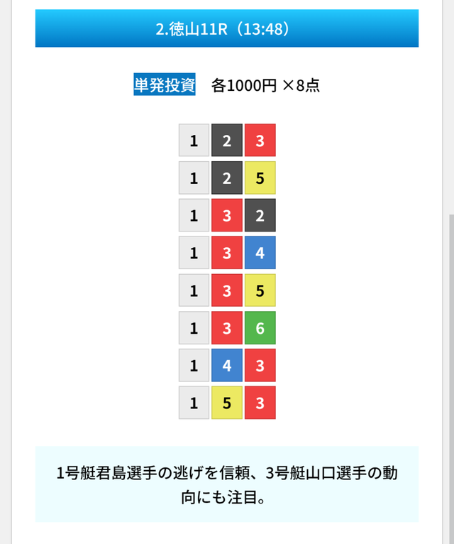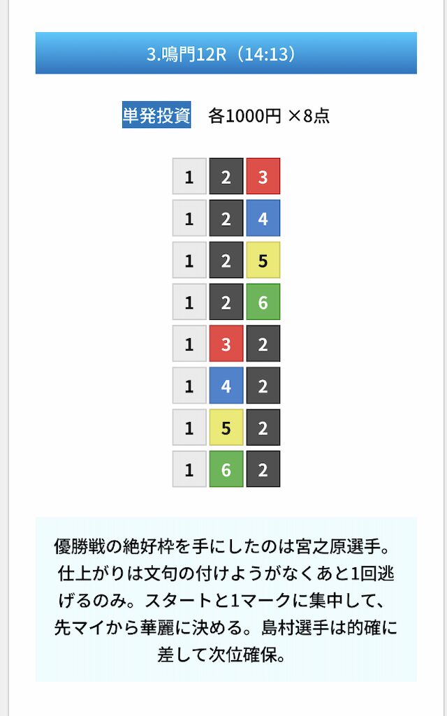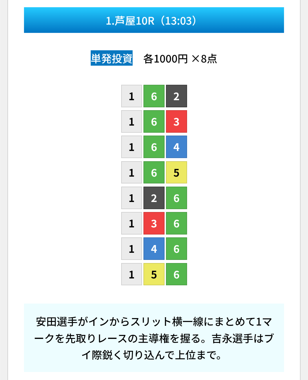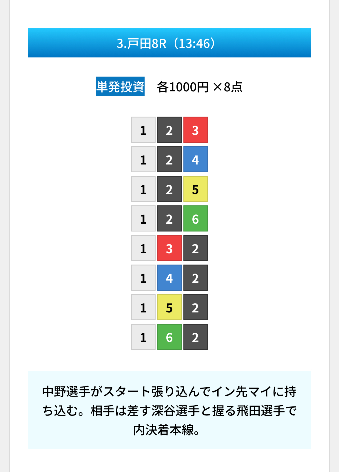 POINTポイント①.本命決着でも数万円の払い戻し!ポイント②.金額と点数調整がまさにプロ!ポイント③.2連勝で10万円超えのプラスも!- 匿名当たり前みたいに1号艇軸かと思いきや、3号艇から仕掛けて的中。ヒモ荒れまで拾ってくれてたのが地味にすごい。 ちょっと尖ってる構成だけど、変に手数が多くないのがありがたい。