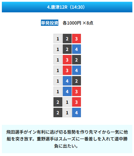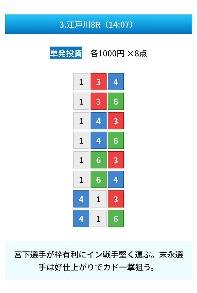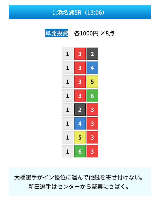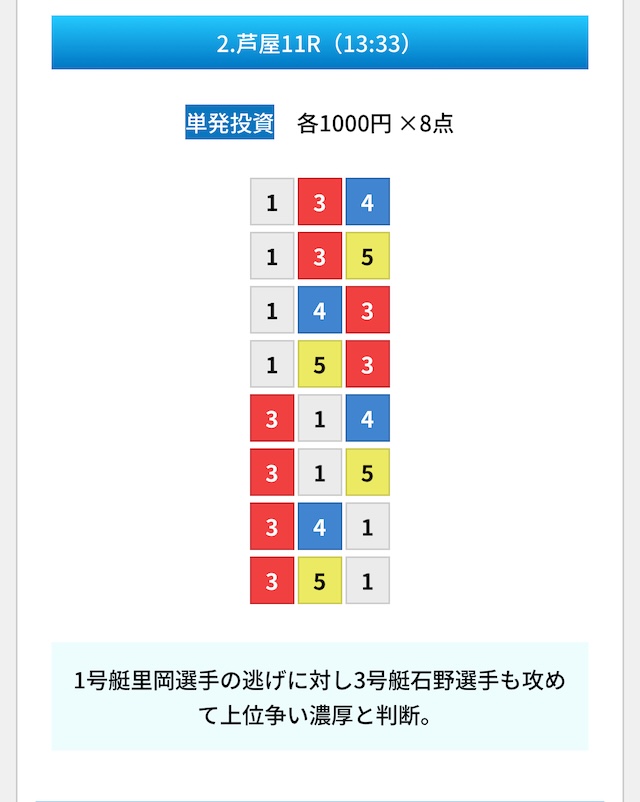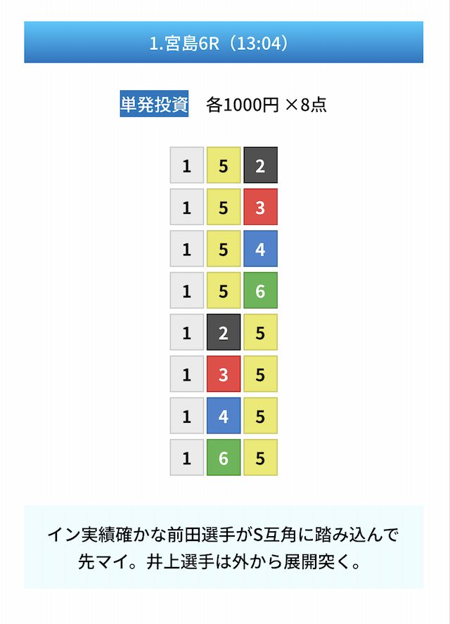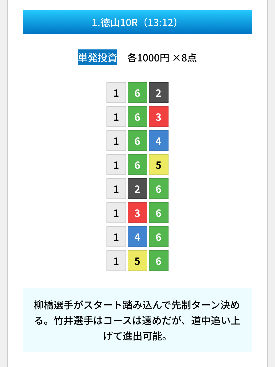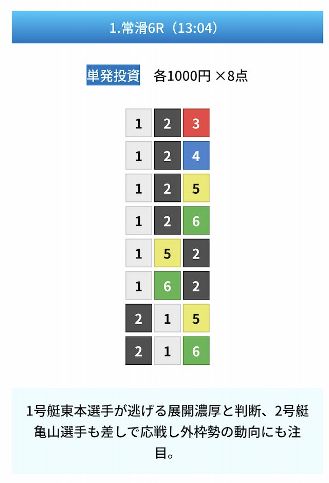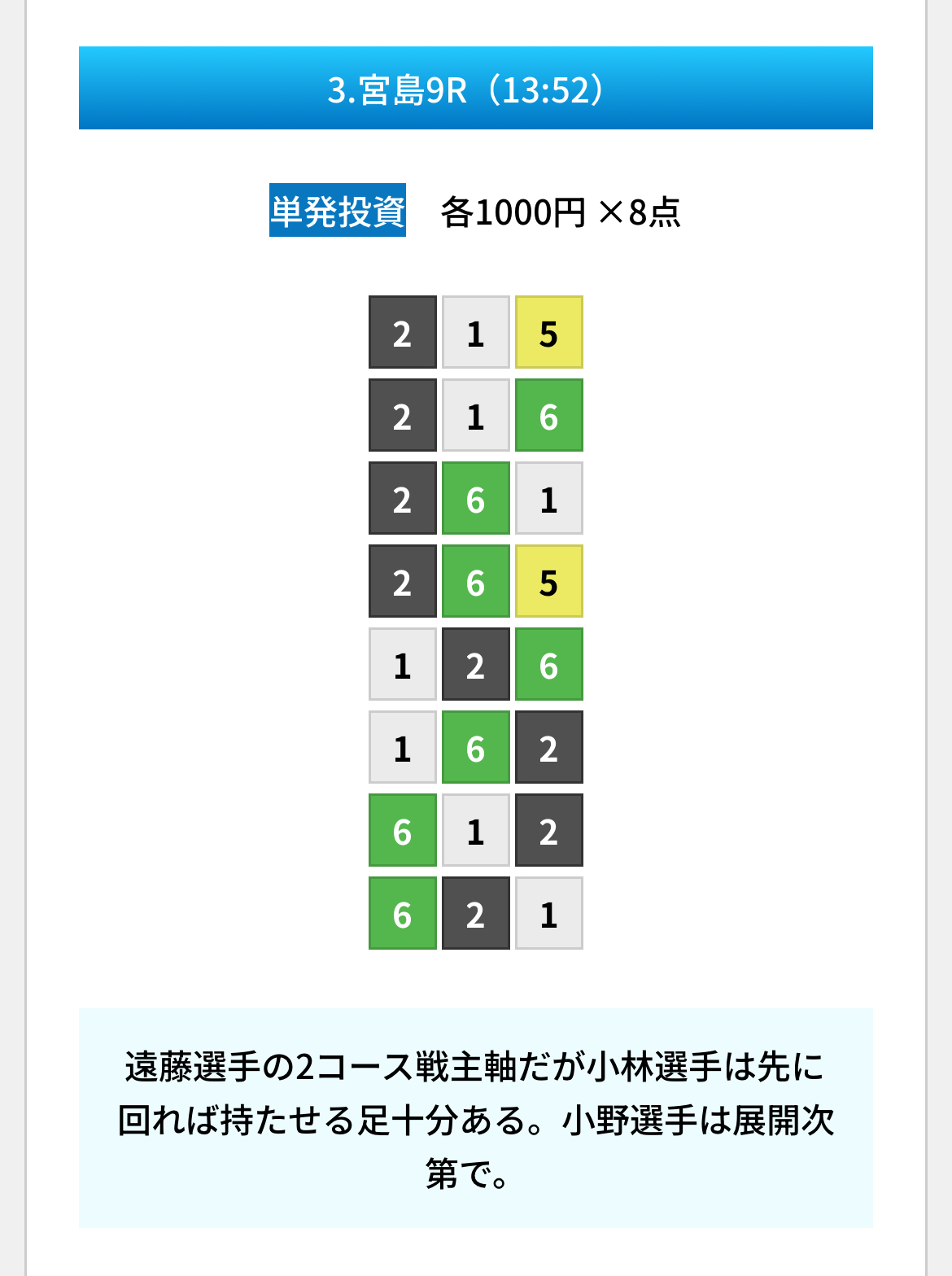POINTポイント①.本命決着でも数万円の払い戻し!ポイント②.金額と点数調整がまさにプロ!ポイント③.2連勝で10万円超えのプラスも!- 匿名当たり前みたいに1号艇軸かと思いきや、3号艇から仕掛けて的中。ヒモ荒れまで拾ってくれてたのが地味にすごい。 ちょっと尖ってる構成だけど、変に手数が多くないのがありがたい。