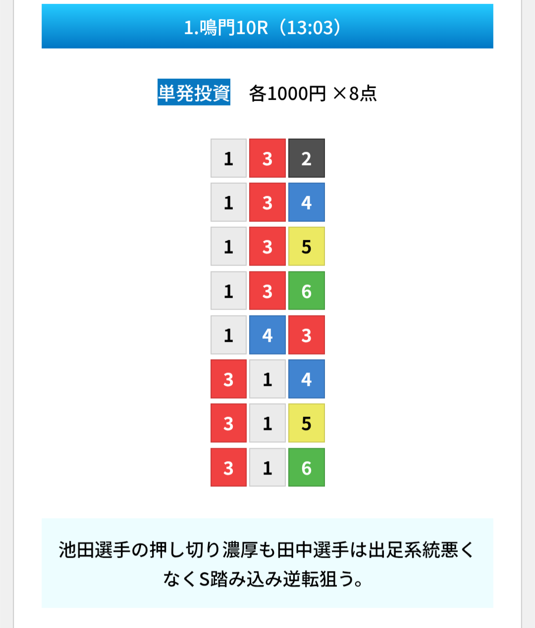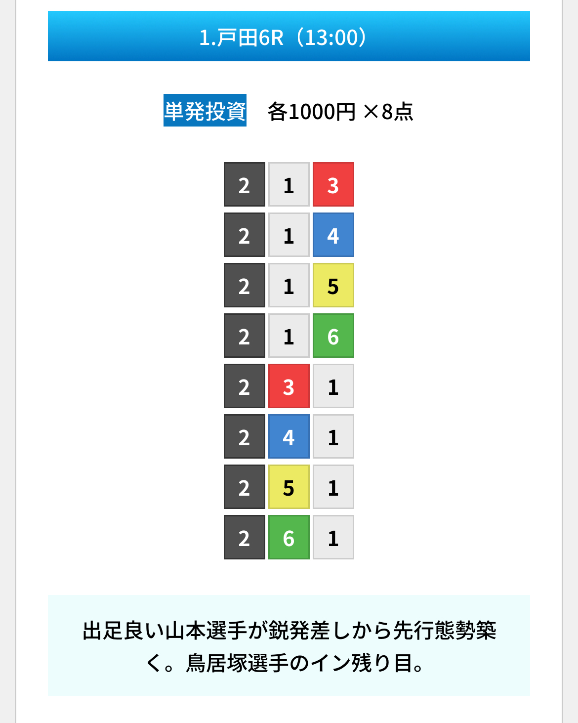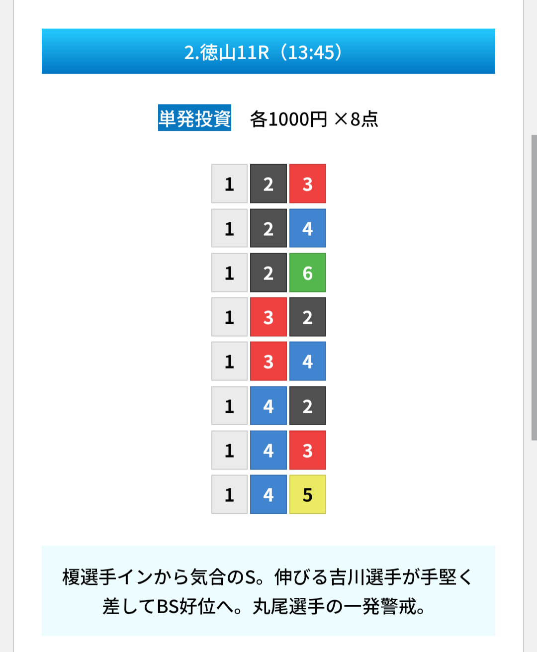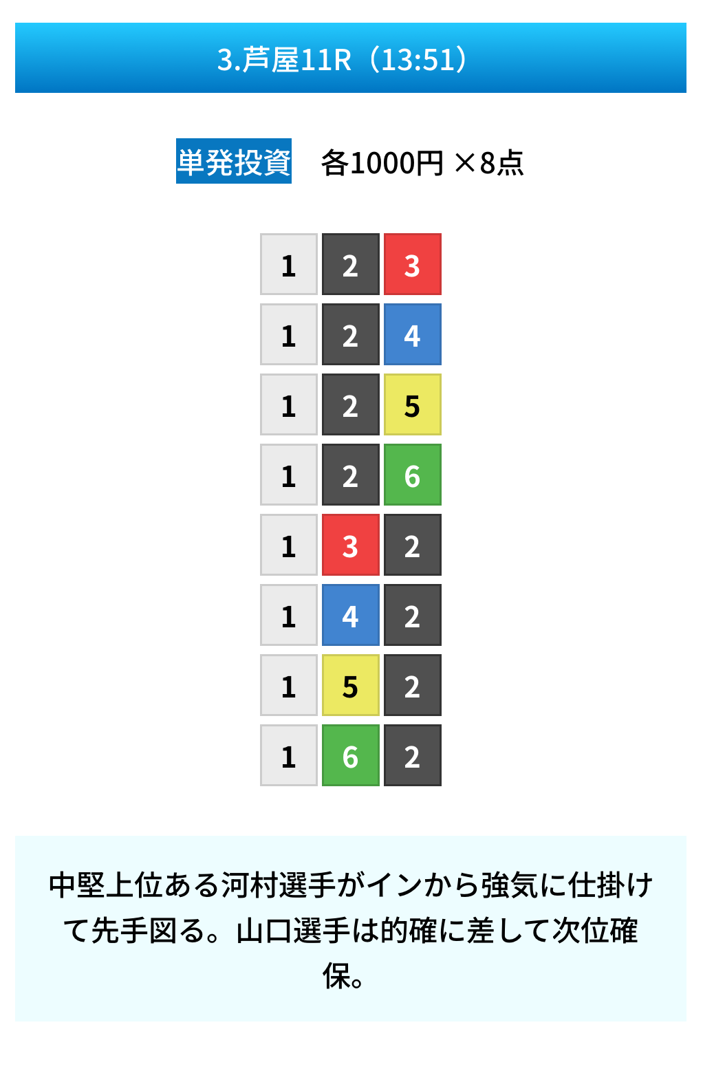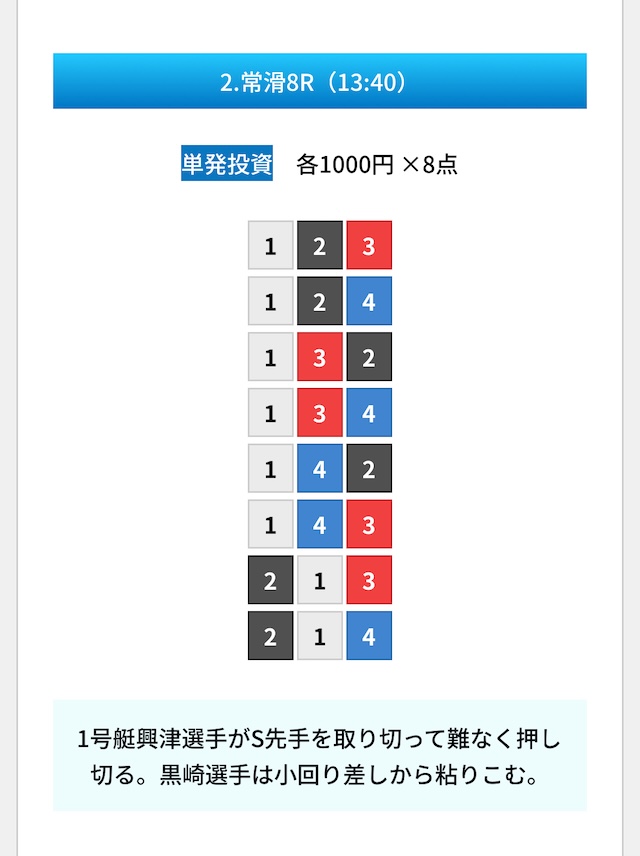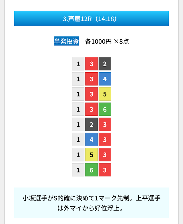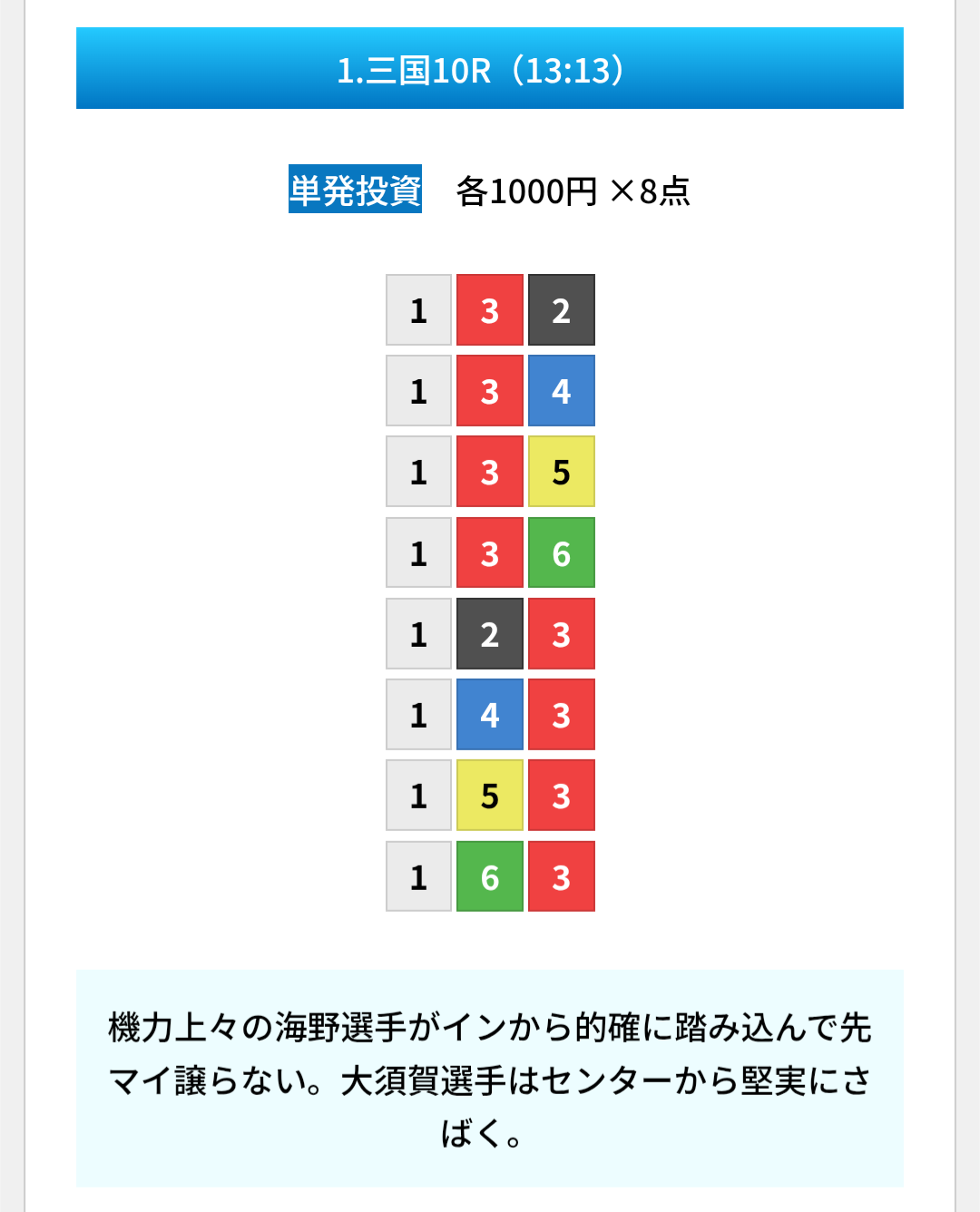 POINTポイント①.本命決着でも数万円の払い戻し!ポイント②.金額と点数調整がまさにプロ!ポイント③.2連勝で10万円超えのプラスも!- 匿名当たり前みたいに1号艇軸かと思いきや、3号艇から仕掛けて的中。ヒモ荒れまで拾ってくれてたのが地味にすごい。 ちょっと尖ってる構成だけど、変に手数が多くないのがありがたい。