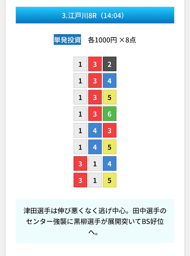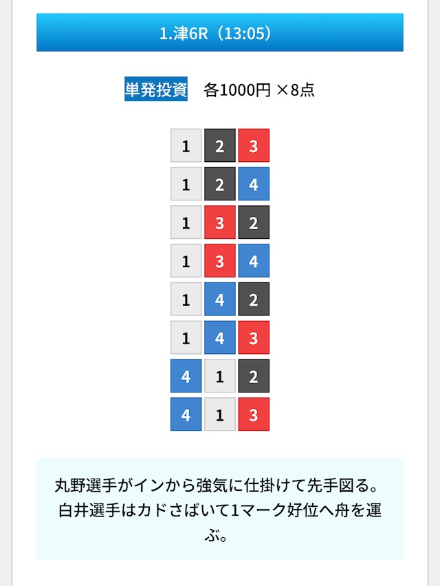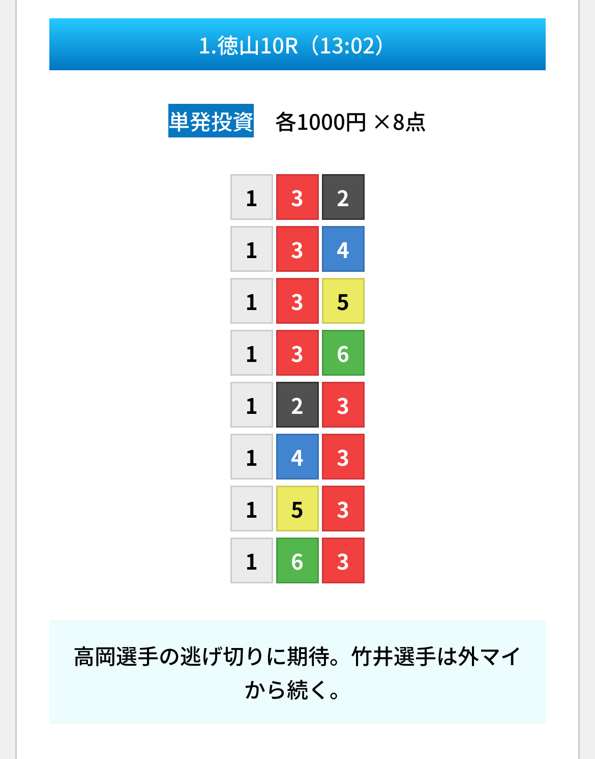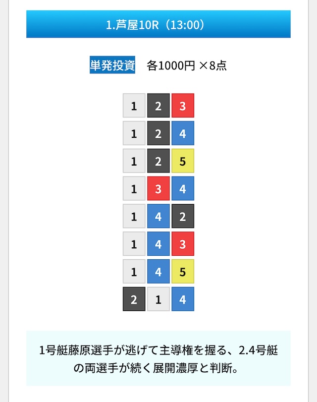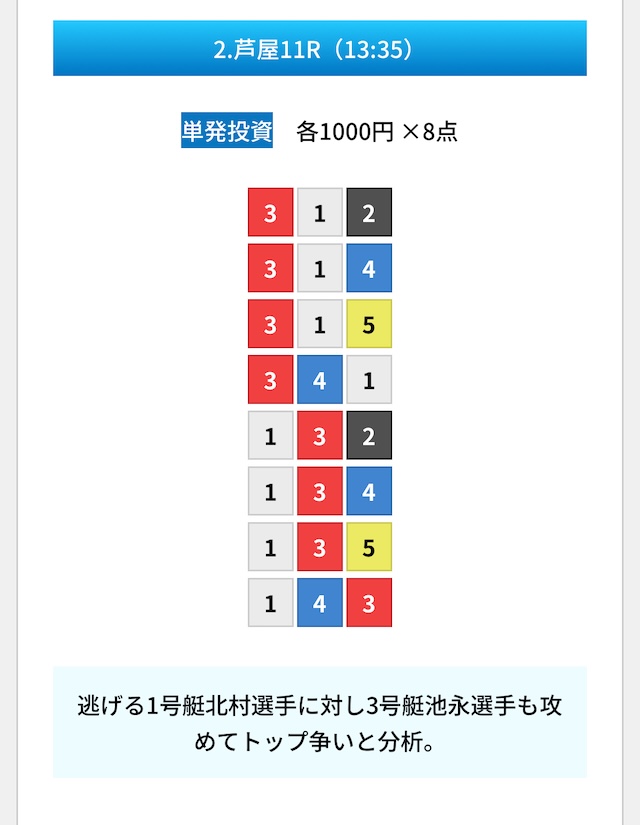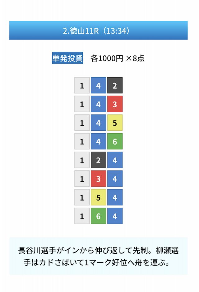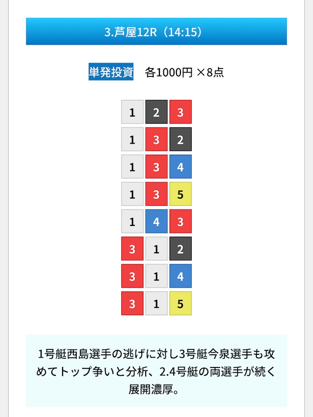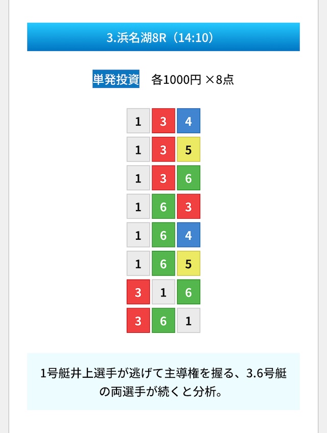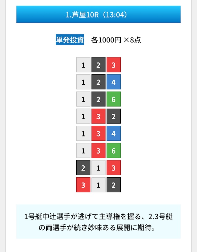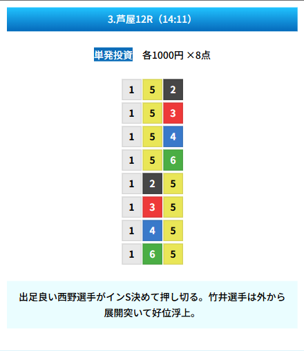 POINTポイント①.本命決着でも数万円の払い戻し!ポイント②.金額と点数調整がまさにプロ!ポイント③.2連勝で10万円超えのプラスも!- 匿名当たり前みたいに1号艇軸かと思いきや、3号艇から仕掛けて的中。ヒモ荒れまで拾ってくれてたのが地味にすごい。 ちょっと尖ってる構成だけど、変に手数が多くないのがありがたい。