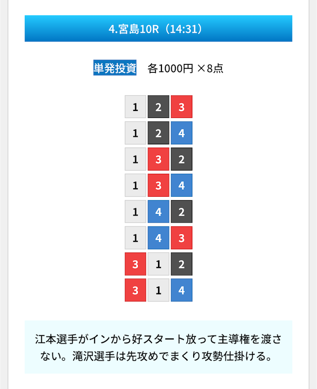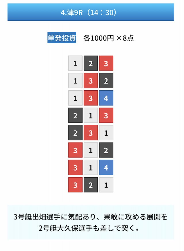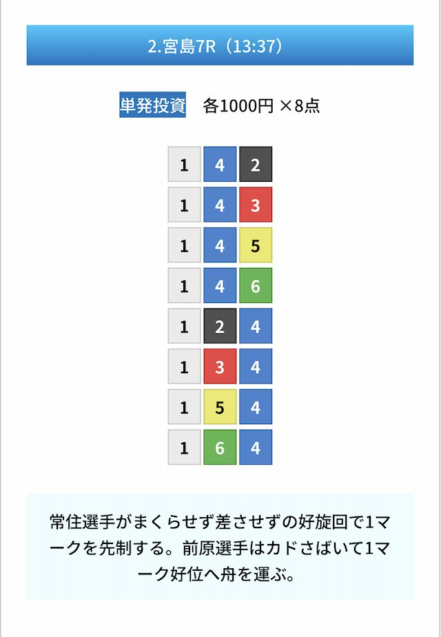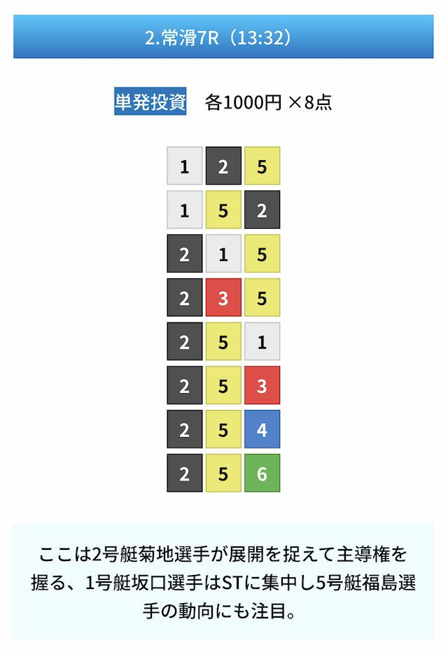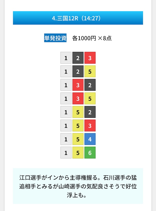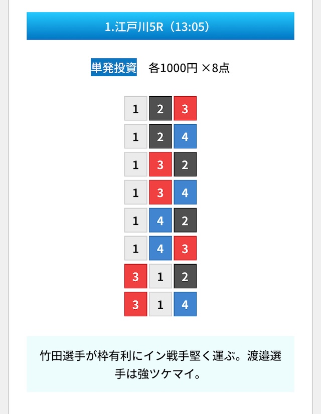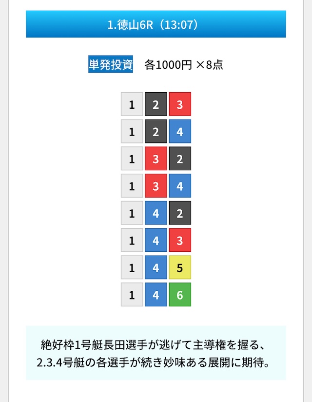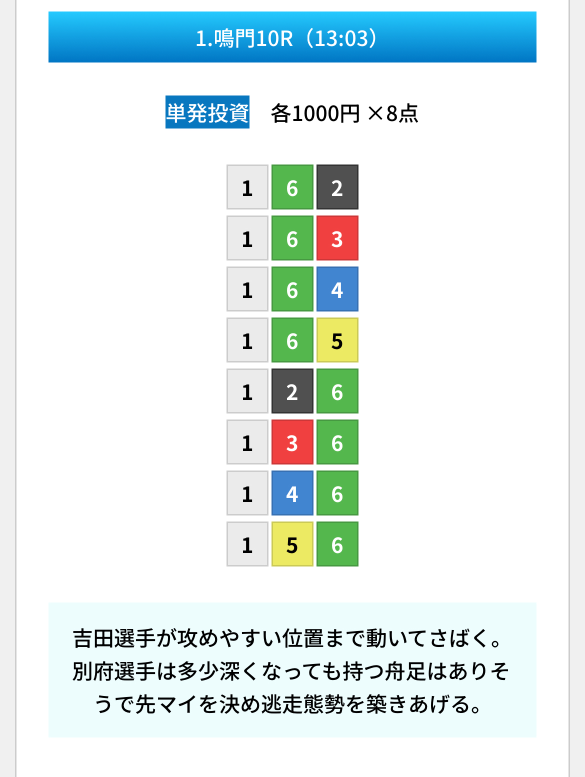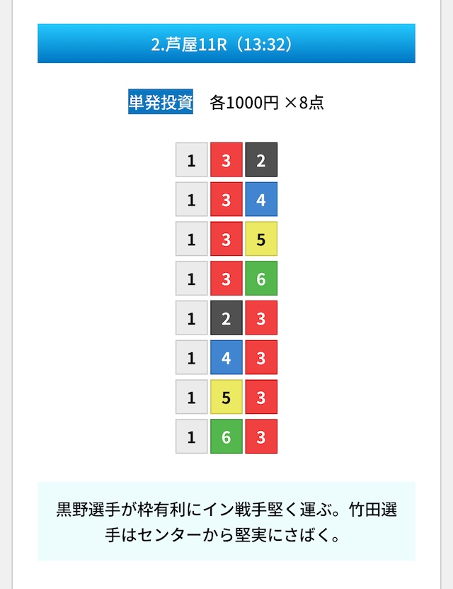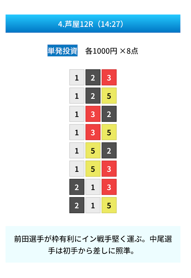 POINTポイント①.本命決着でも数万円の払い戻し!ポイント②.金額と点数調整がまさにプロ!ポイント③.2連勝で10万円超えのプラスも!- 匿名当たり前みたいに1号艇軸かと思いきや、3号艇から仕掛けて的中。ヒモ荒れまで拾ってくれてたのが地味にすごい。 ちょっと尖ってる構成だけど、変に手数が多くないのがありがたい。
