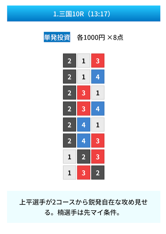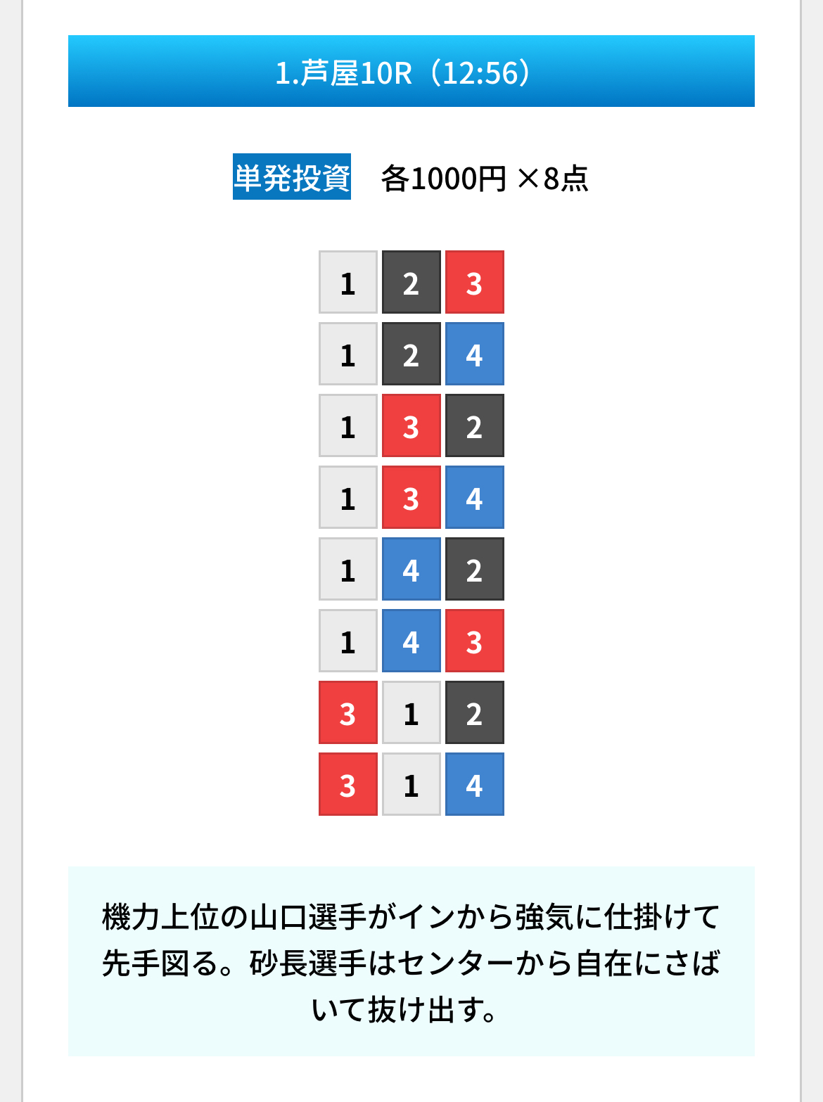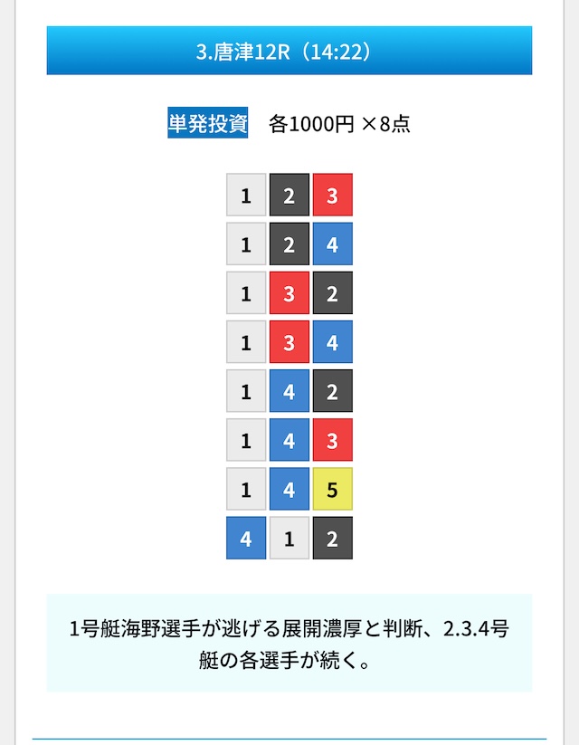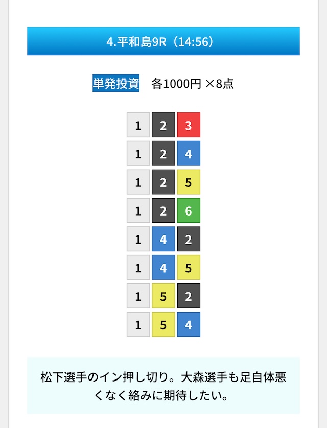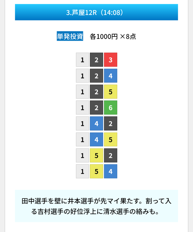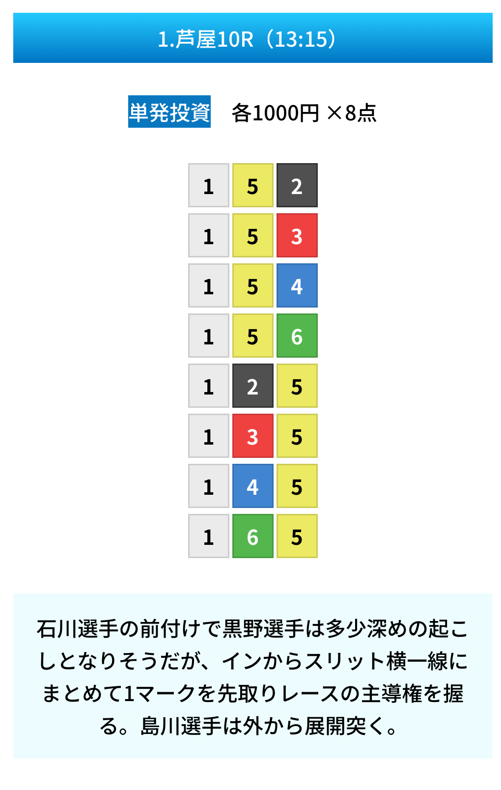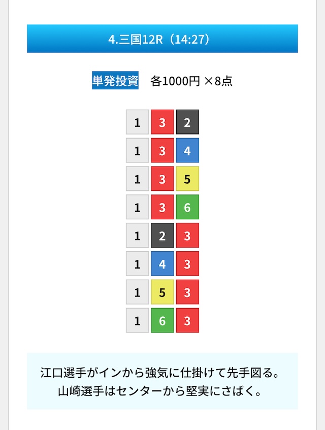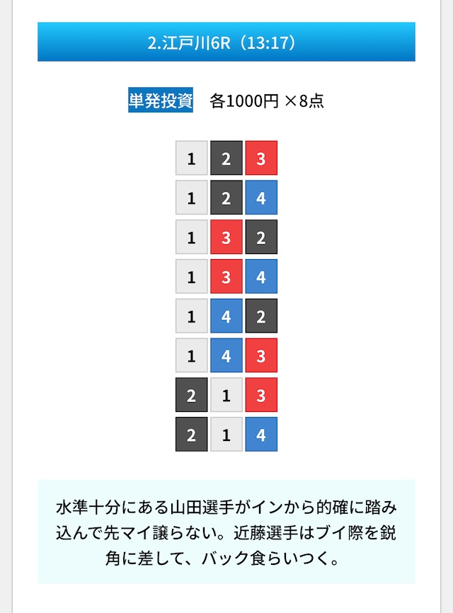 POINTポイント①.本命決着でも数万円の払い戻し!ポイント②.金額と点数調整がまさにプロ!ポイント③.2連勝で10万円超えのプラスも!- 匿名当たり前みたいに1号艇軸かと思いきや、3号艇から仕掛けて的中。ヒモ荒れまで拾ってくれてたのが地味にすごい。 ちょっと尖ってる構成だけど、変に手数が多くないのがありがたい。