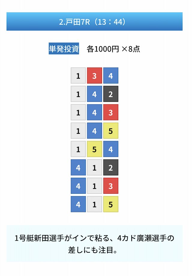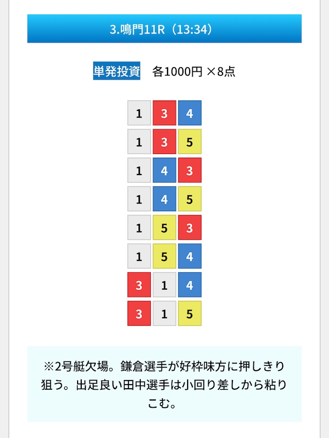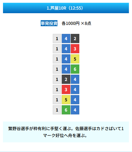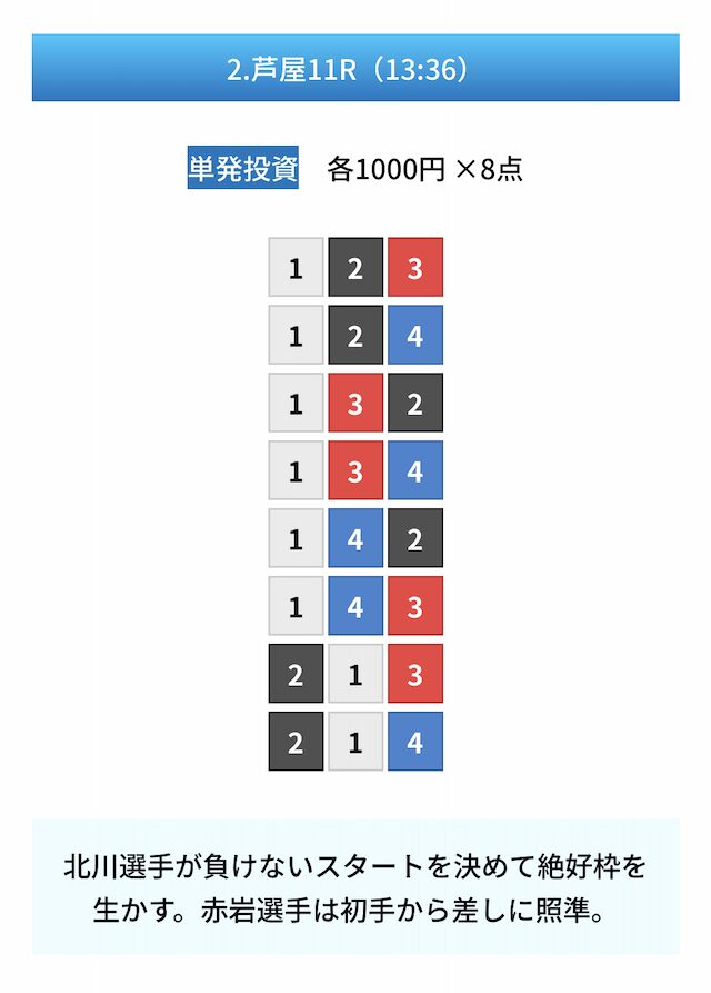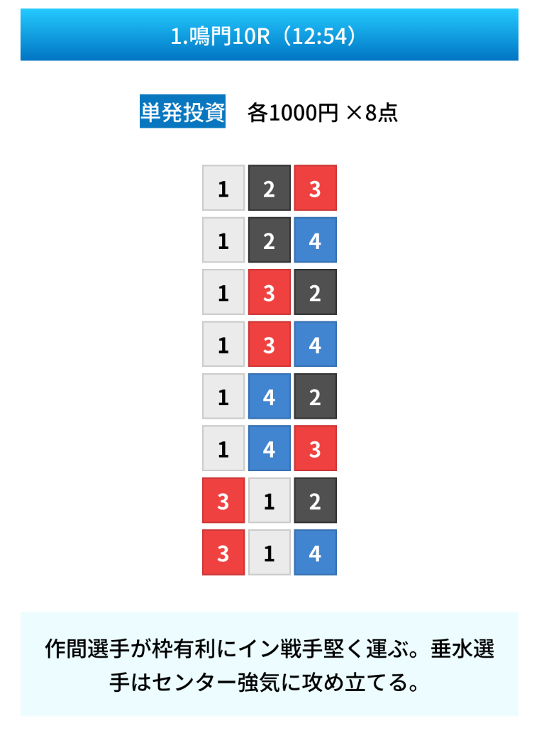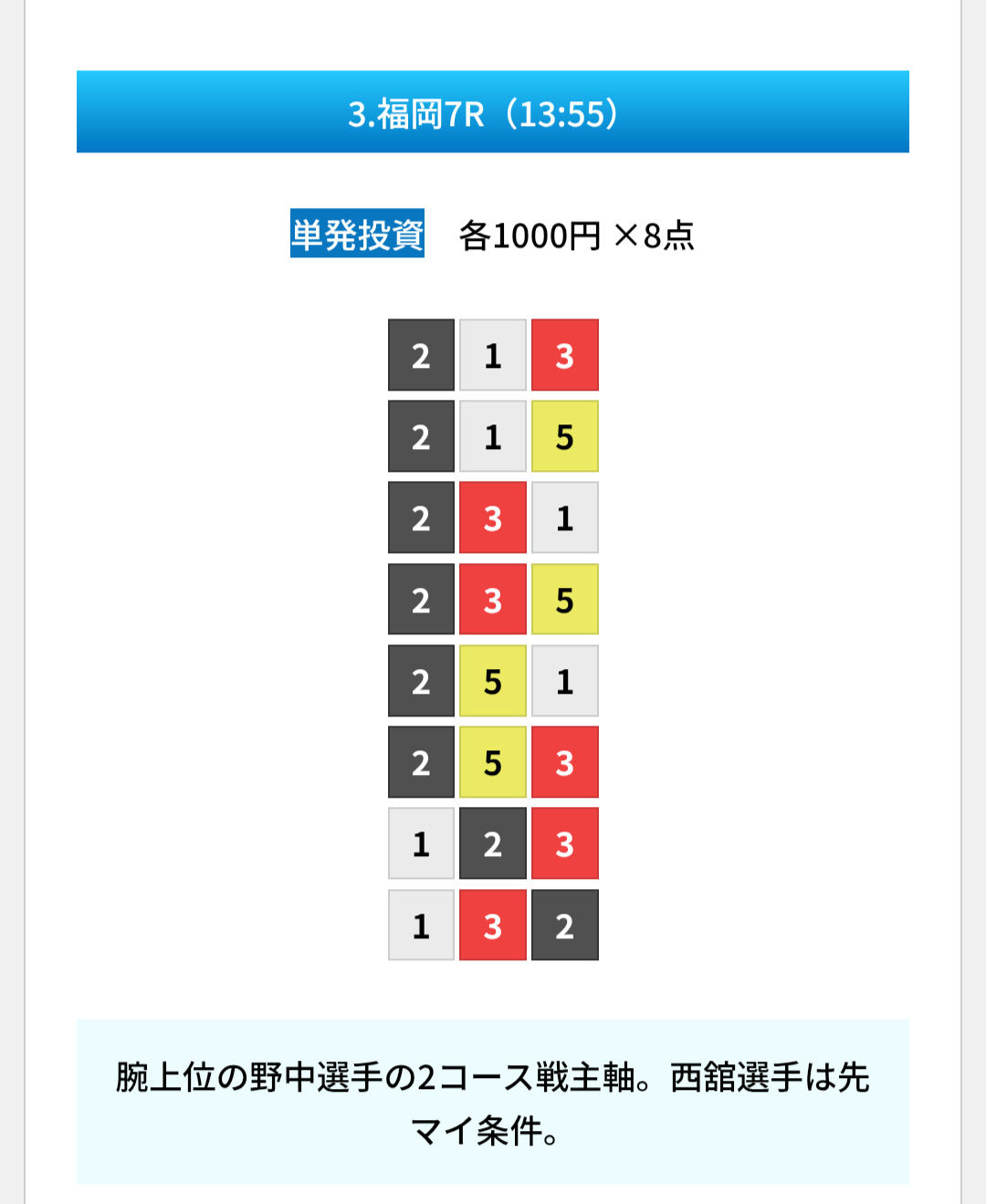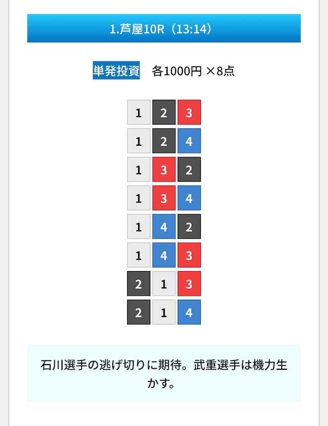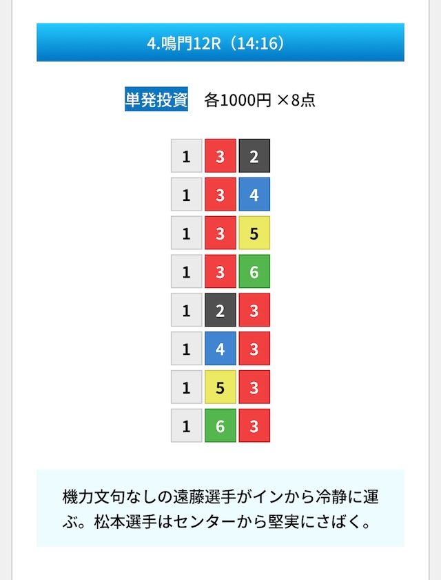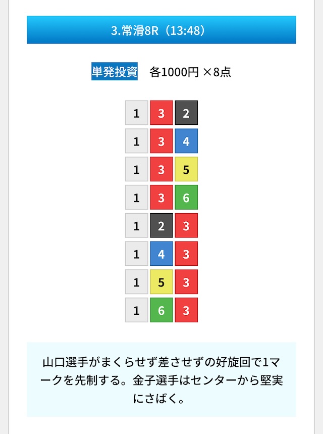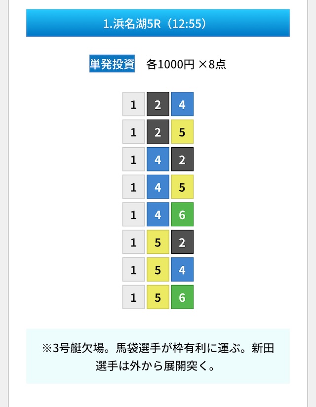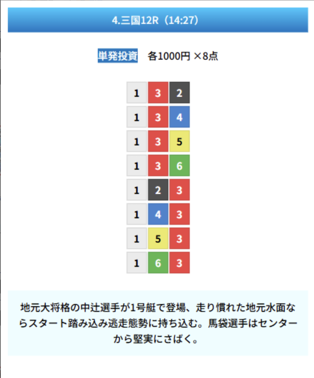 POINTポイント①.本命決着でも数万円の払い戻し!ポイント②.金額と点数調整がまさにプロ!ポイント③.2連勝で10万円超えのプラスも!- 匿名当たり前みたいに1号艇軸かと思いきや、3号艇から仕掛けて的中。ヒモ荒れまで拾ってくれてたのが地味にすごい。 ちょっと尖ってる構成だけど、変に手数が多くないのがありがたい。