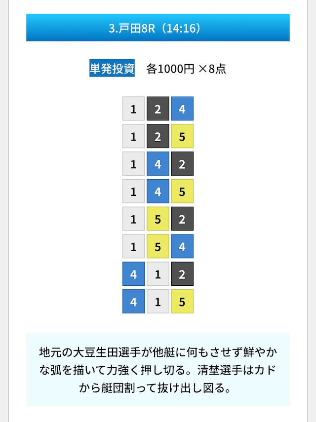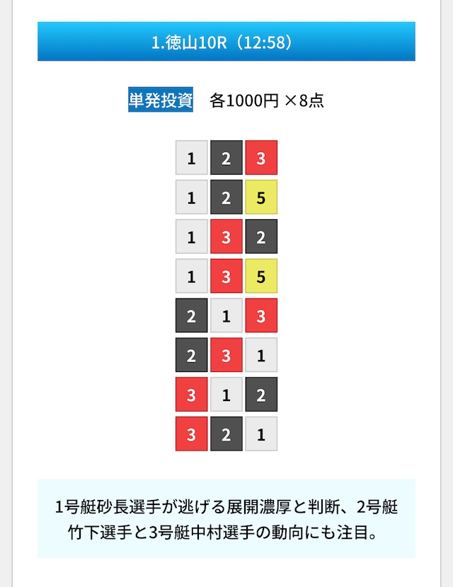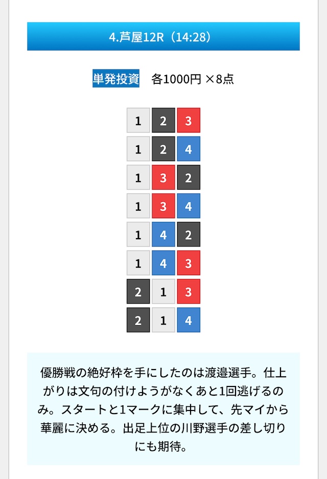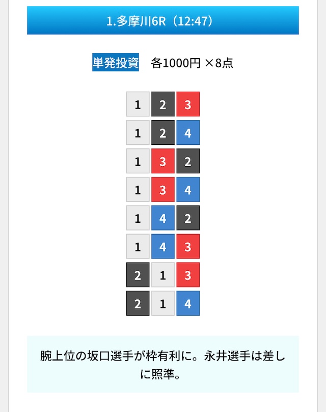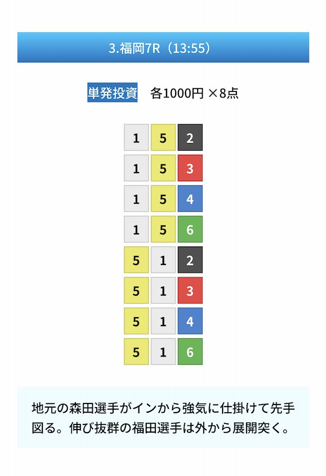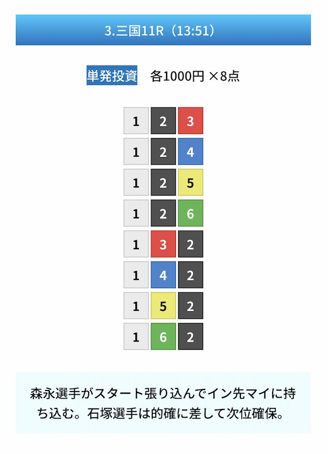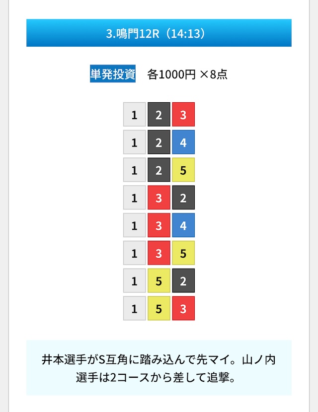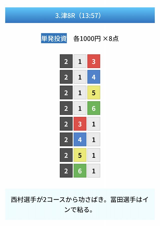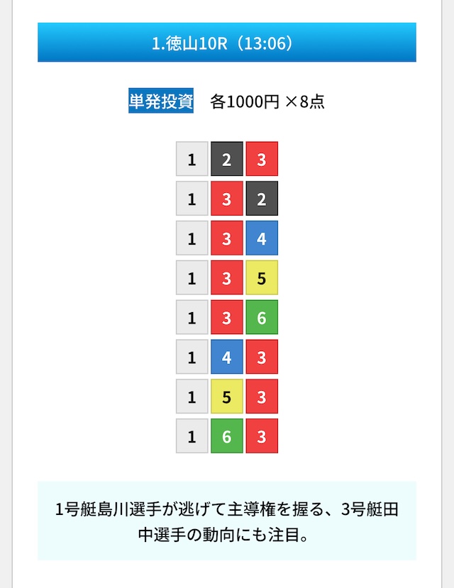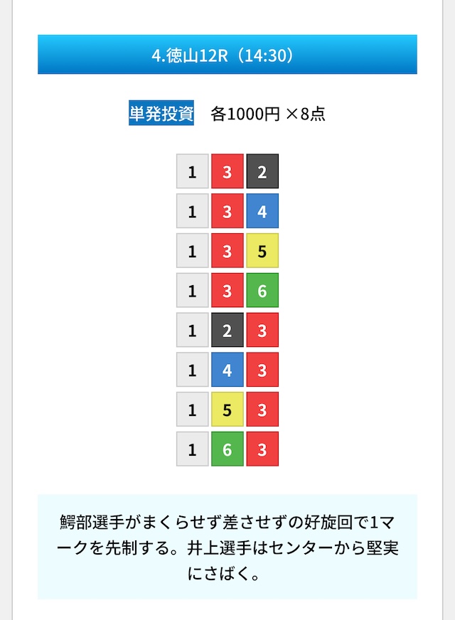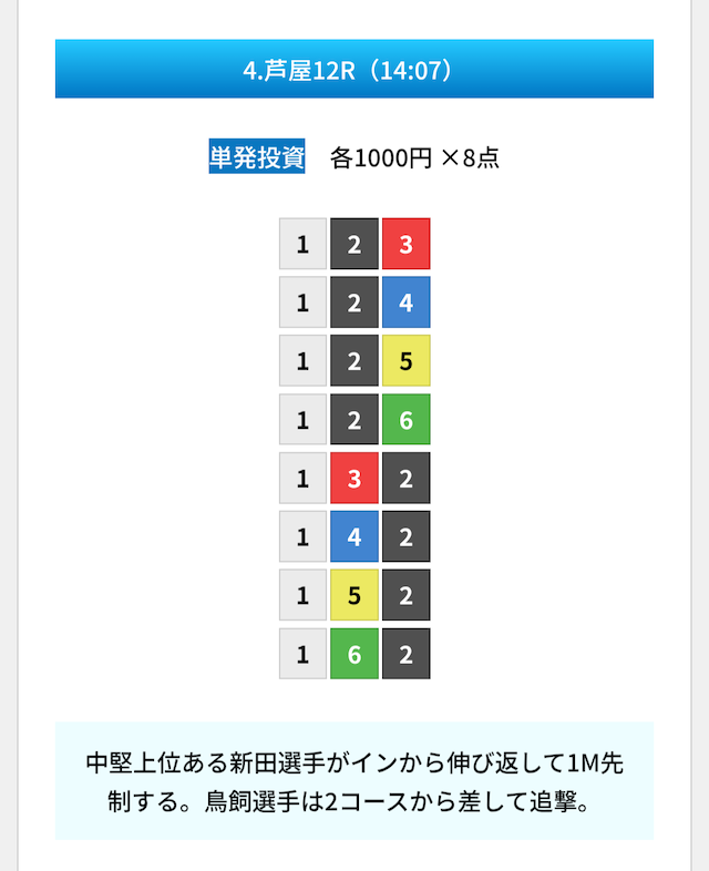 POINTポイント①.本命決着でも数万円の払い戻し!ポイント②.金額と点数調整がまさにプロ!ポイント③.2連勝で10万円超えのプラスも!- 匿名当たり前みたいに1号艇軸かと思いきや、3号艇から仕掛けて的中。ヒモ荒れまで拾ってくれてたのが地味にすごい。 ちょっと尖ってる構成だけど、変に手数が多くないのがありがたい。