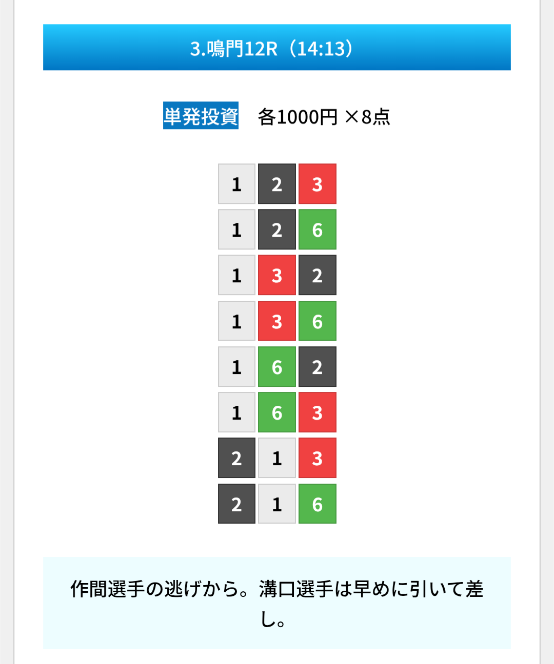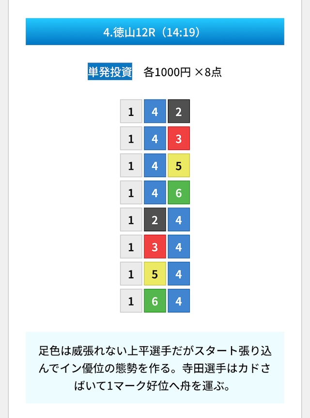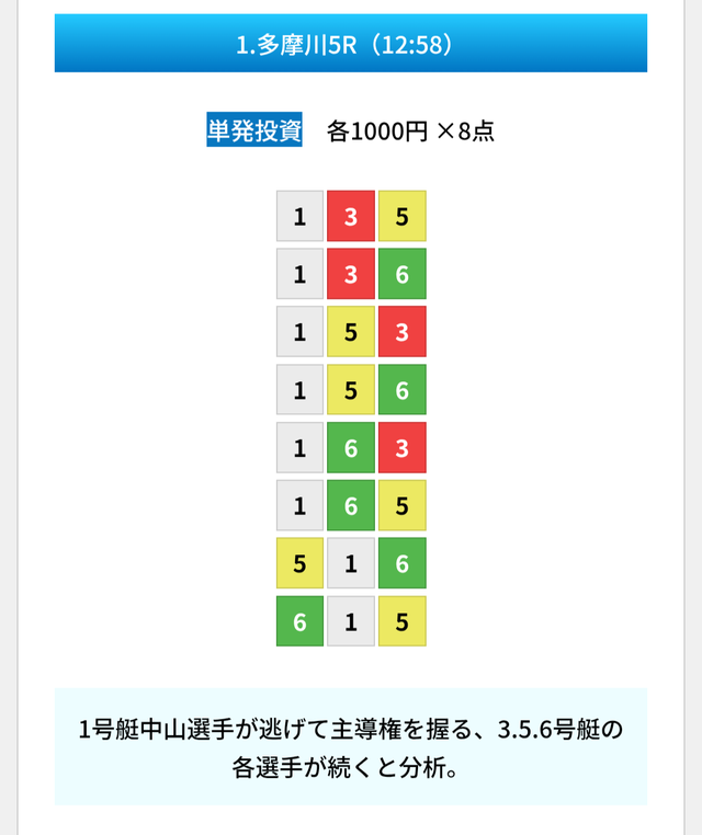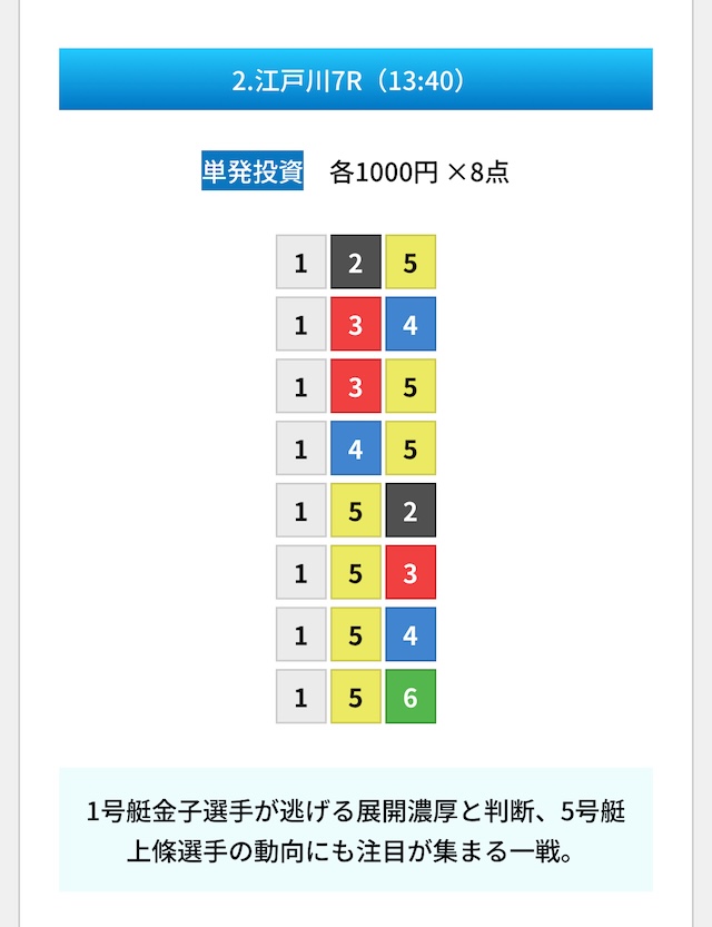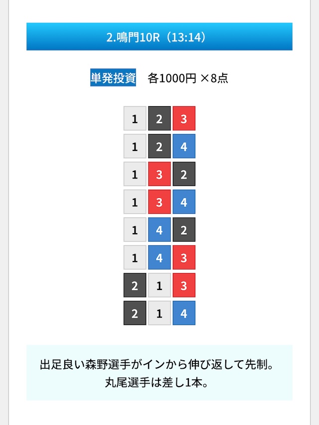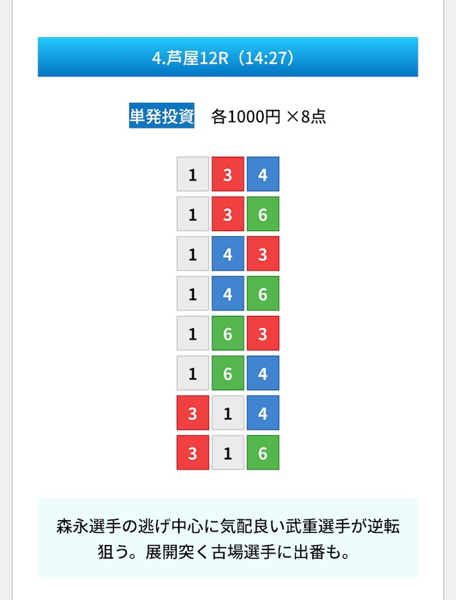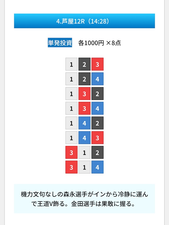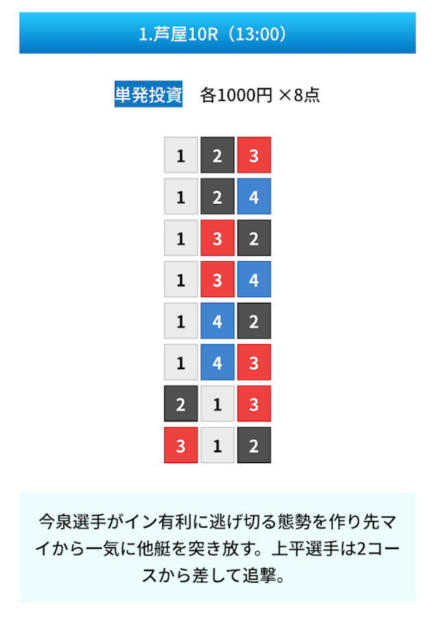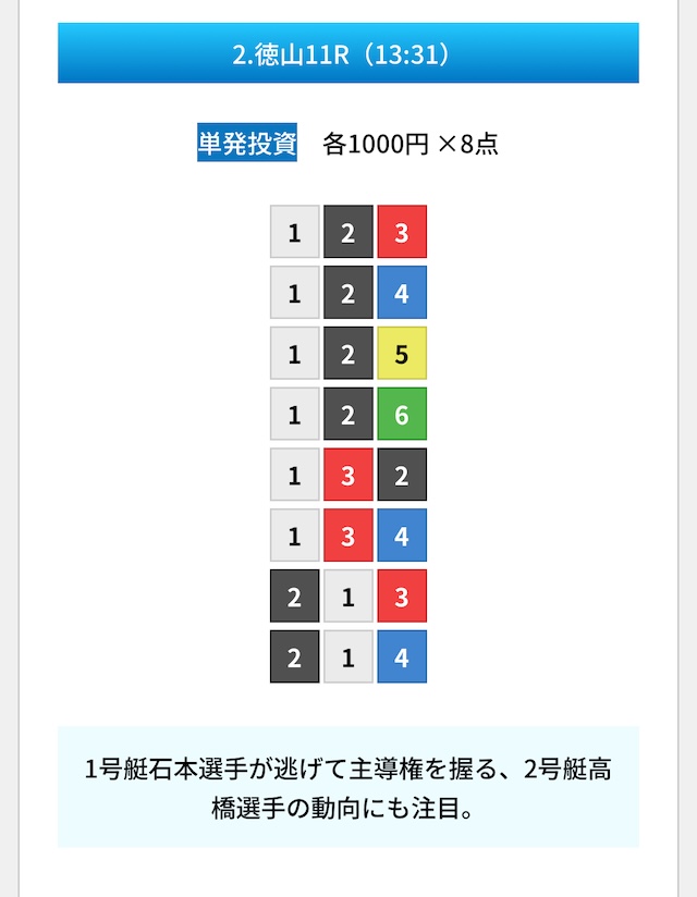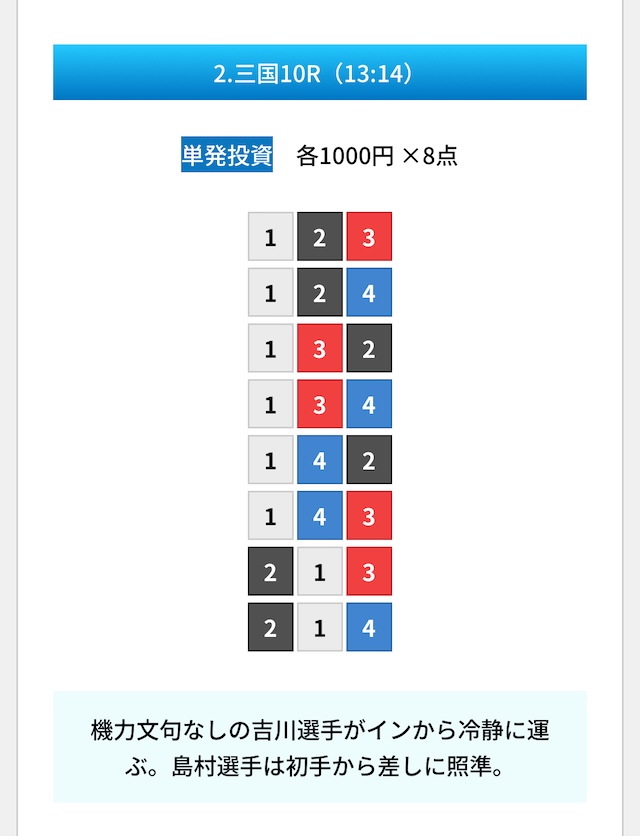 POINTポイント①.本命決着でも数万円の払い戻し!ポイント②.金額と点数調整がまさにプロ!ポイント③.2連勝で10万円超えのプラスも!- 匿名当たり前みたいに1号艇軸かと思いきや、3号艇から仕掛けて的中。ヒモ荒れまで拾ってくれてたのが地味にすごい。 ちょっと尖ってる構成だけど、変に手数が多くないのがありがたい。