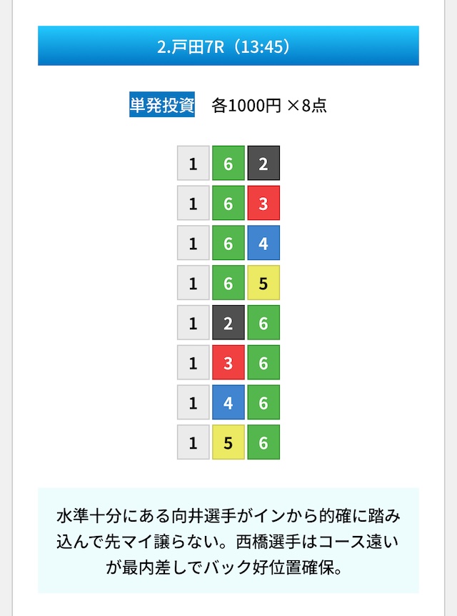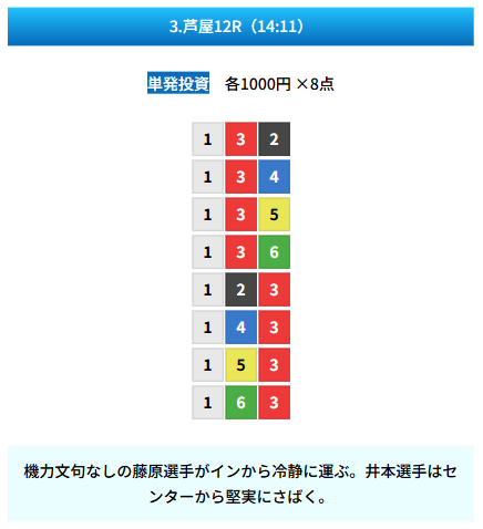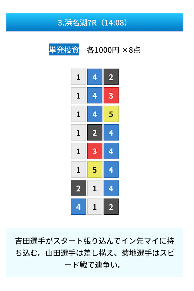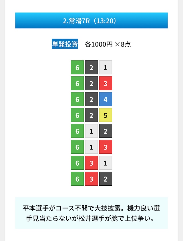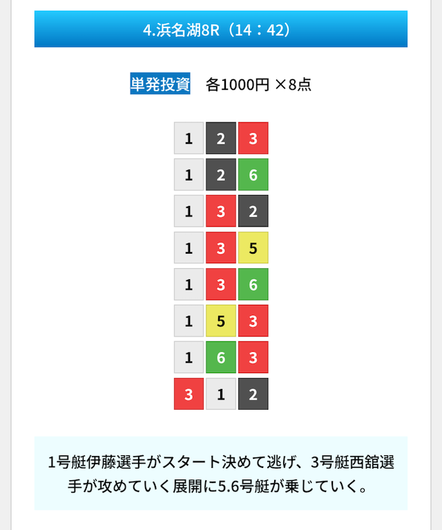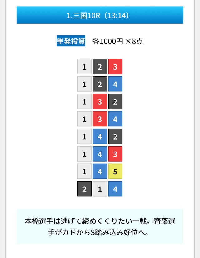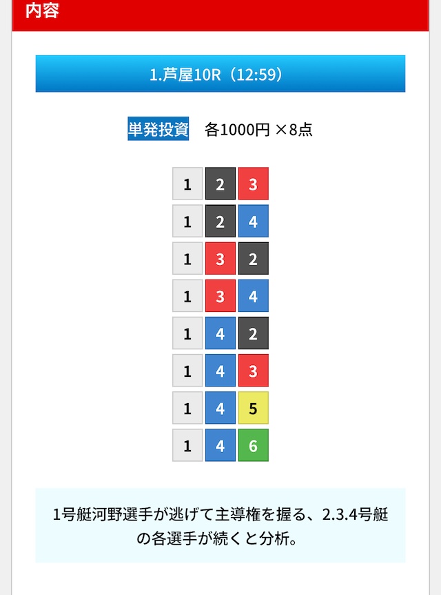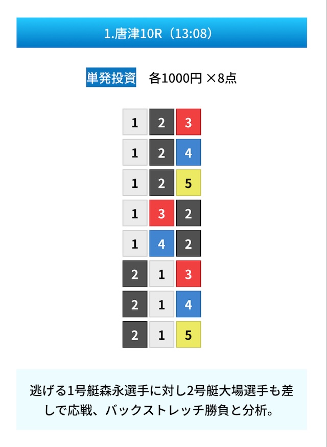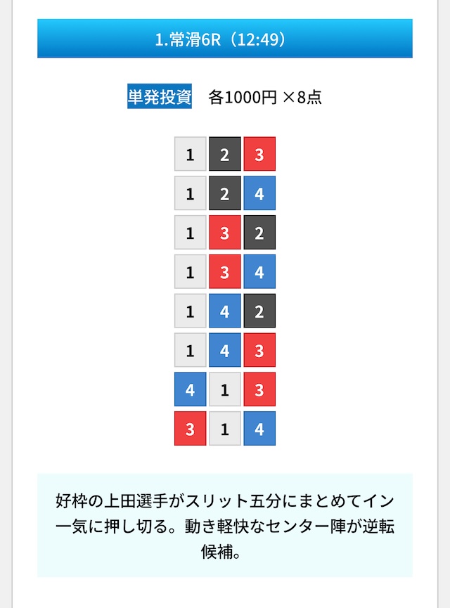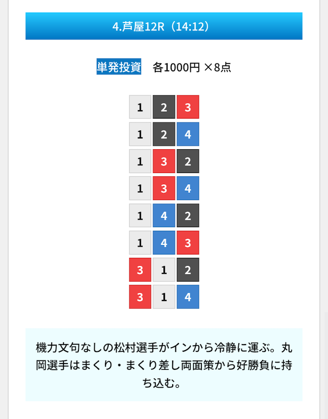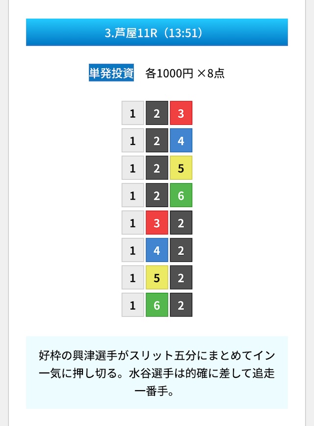 POINTポイント①.本命決着でも数万円の払い戻し!ポイント②.金額と点数調整がまさにプロ!ポイント③.2連勝で10万円超えのプラスも!- 匿名当たり前みたいに1号艇軸かと思いきや、3号艇から仕掛けて的中。ヒモ荒れまで拾ってくれてたのが地味にすごい。 ちょっと尖ってる構成だけど、変に手数が多くないのがありがたい。