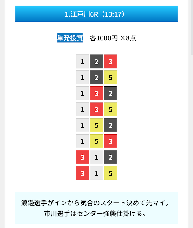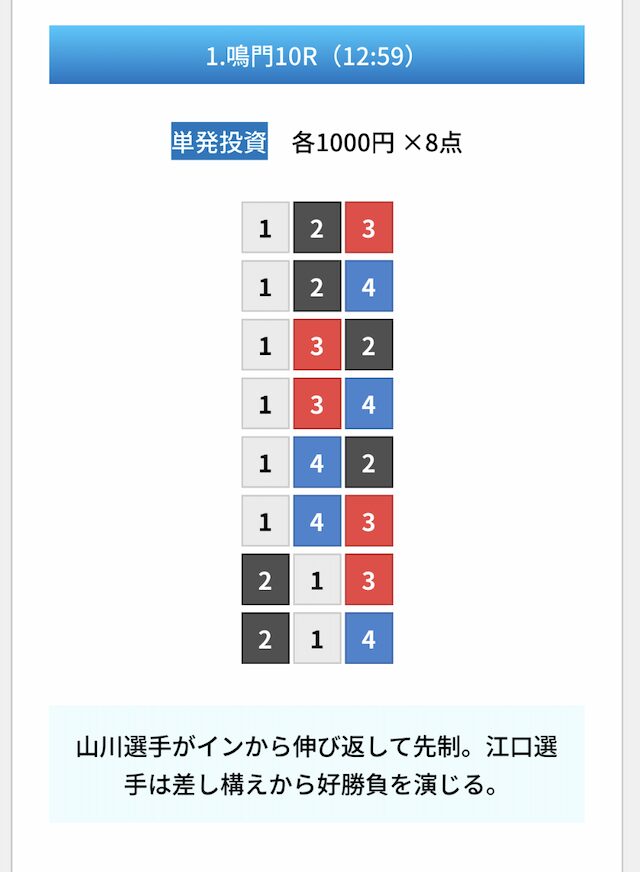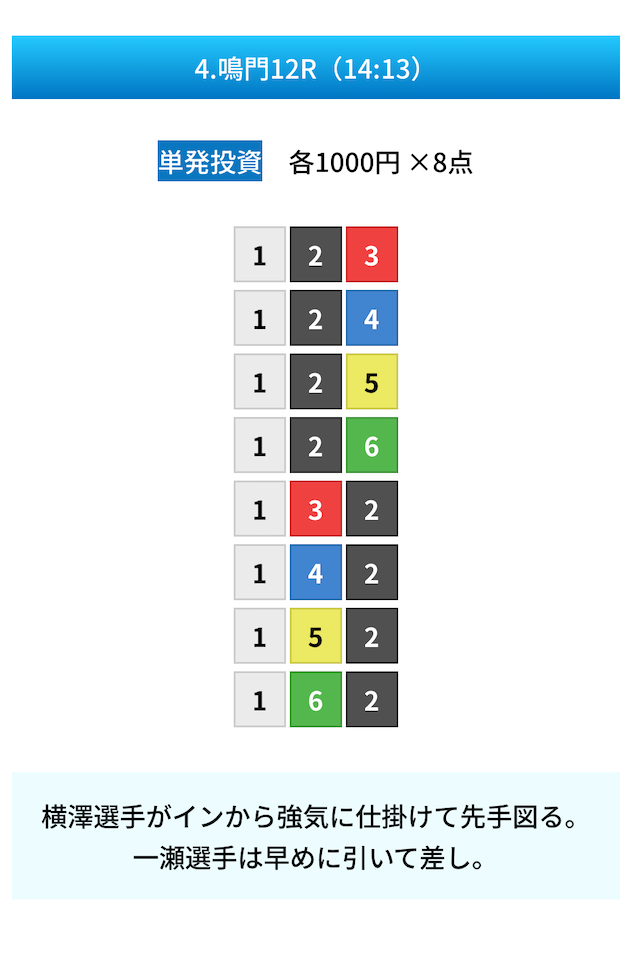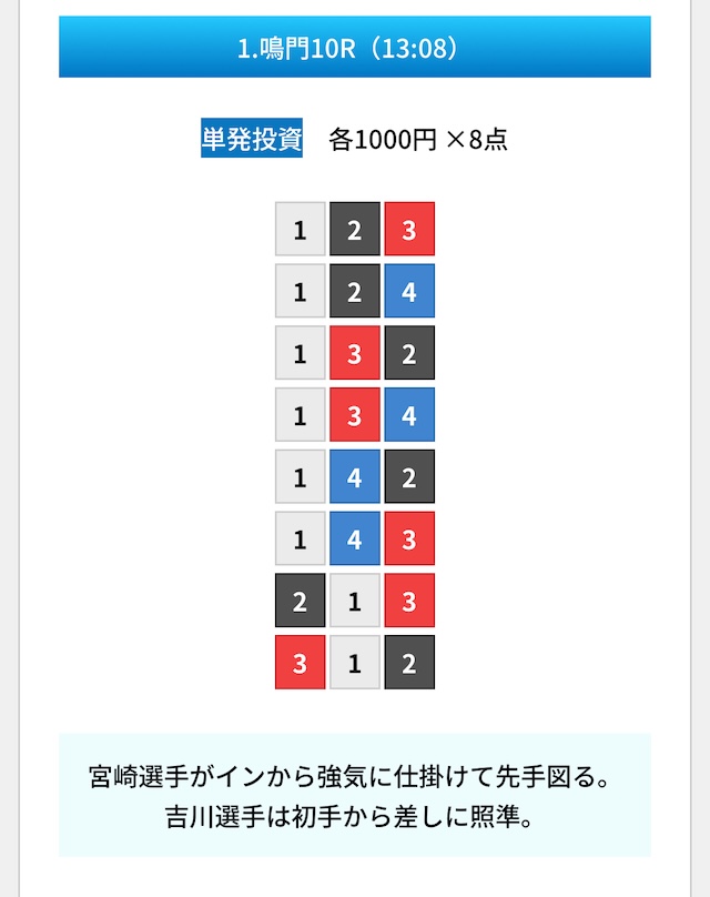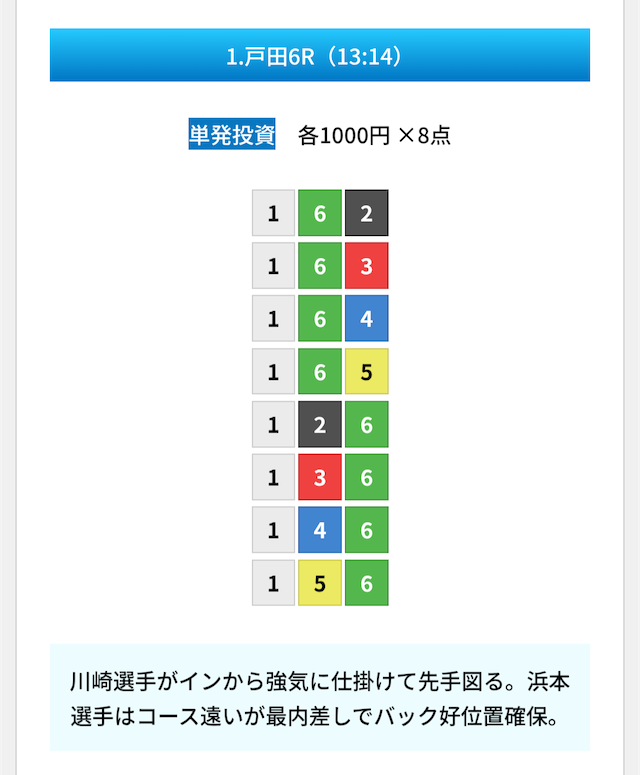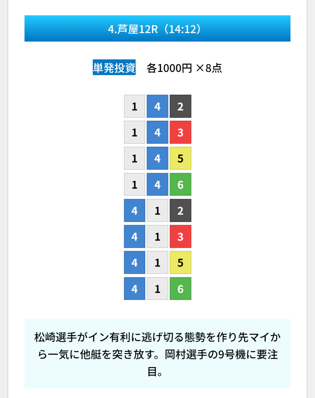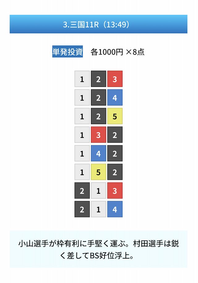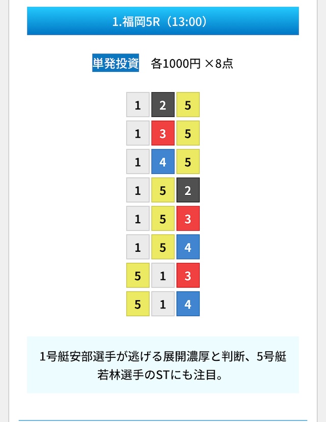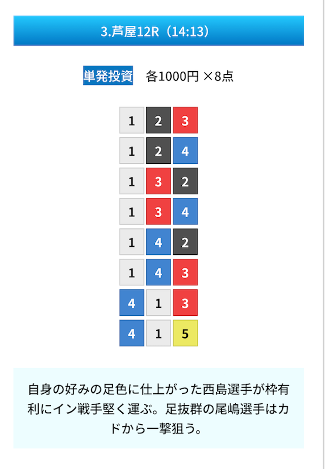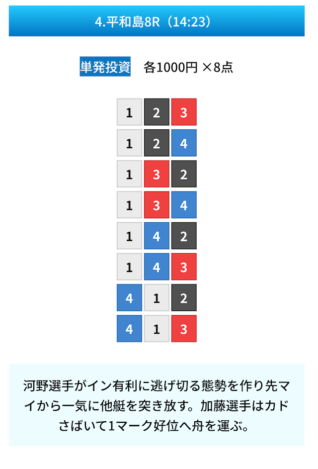 POINTポイント①.本命決着でも数万円の払い戻し!ポイント②.金額と点数調整がまさにプロ!ポイント③.2連勝で10万円超えのプラスも!- 匿名当たり前みたいに1号艇軸かと思いきや、3号艇から仕掛けて的中。ヒモ荒れまで拾ってくれてたのが地味にすごい。 ちょっと尖ってる構成だけど、変に手数が多くないのがありがたい。
