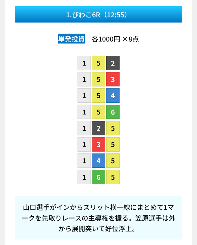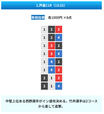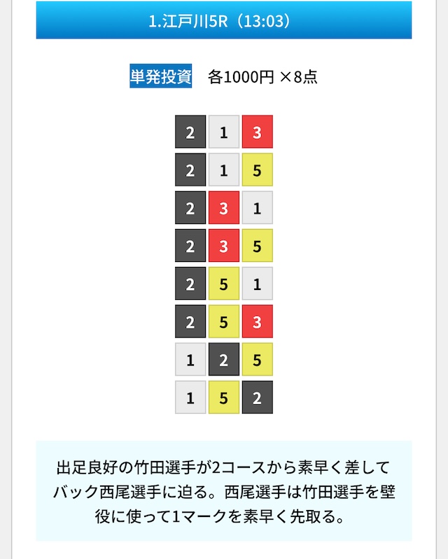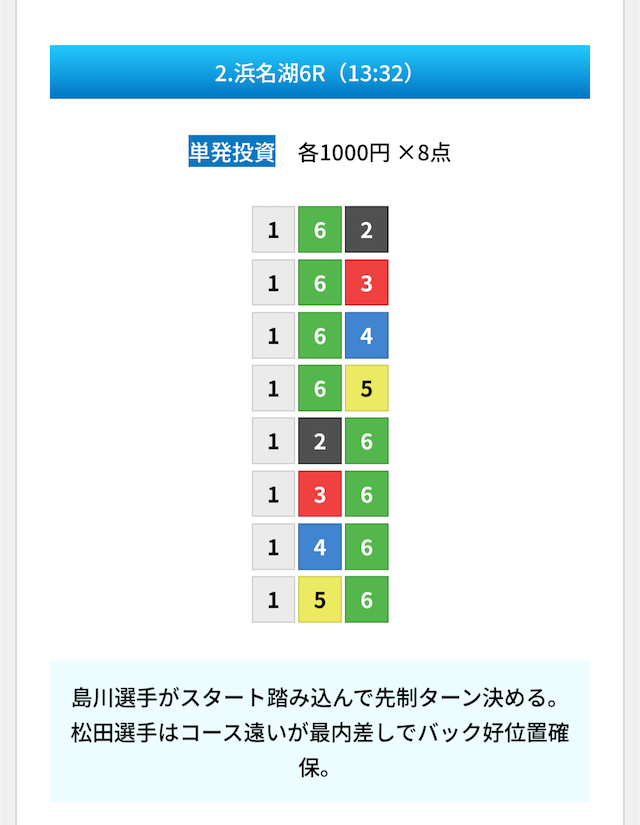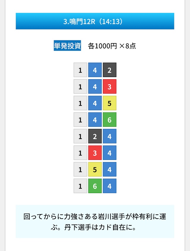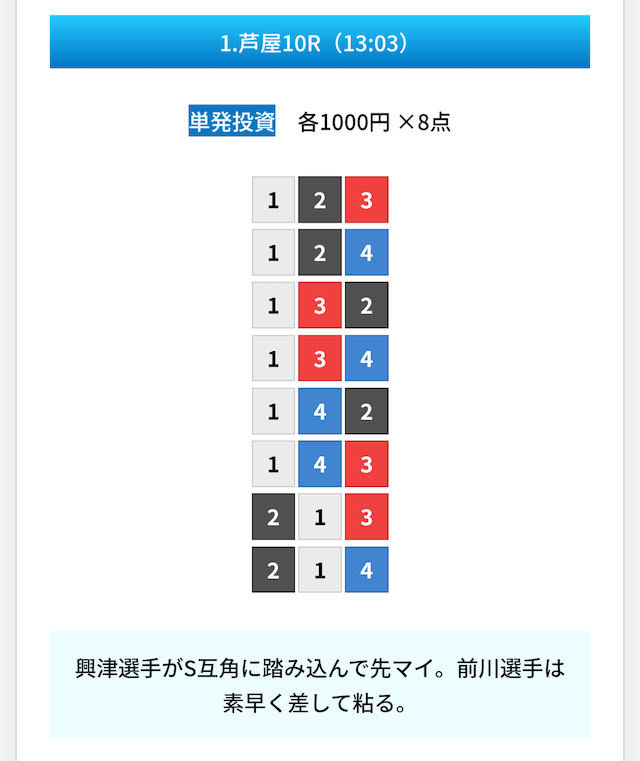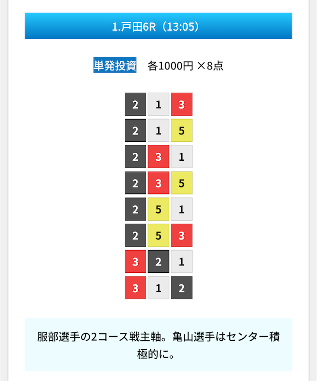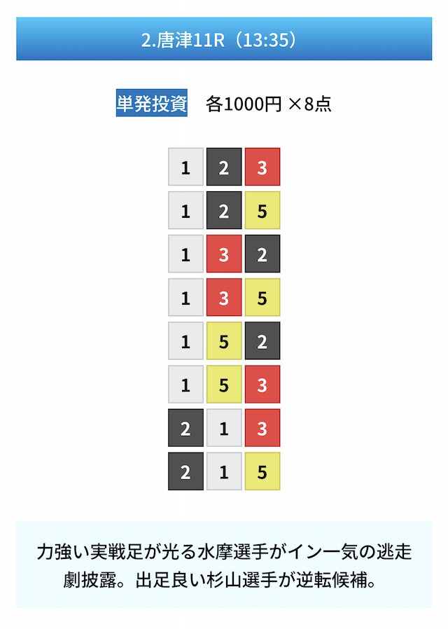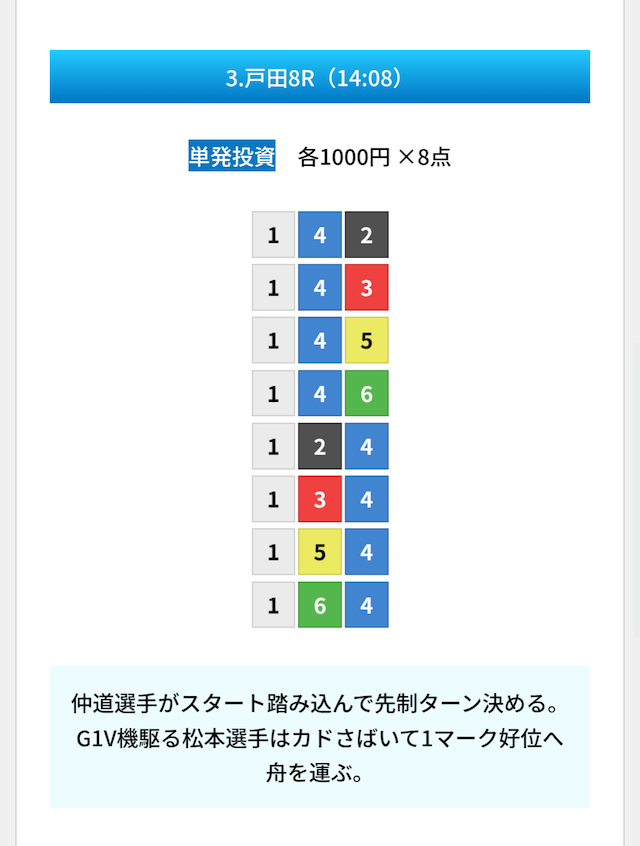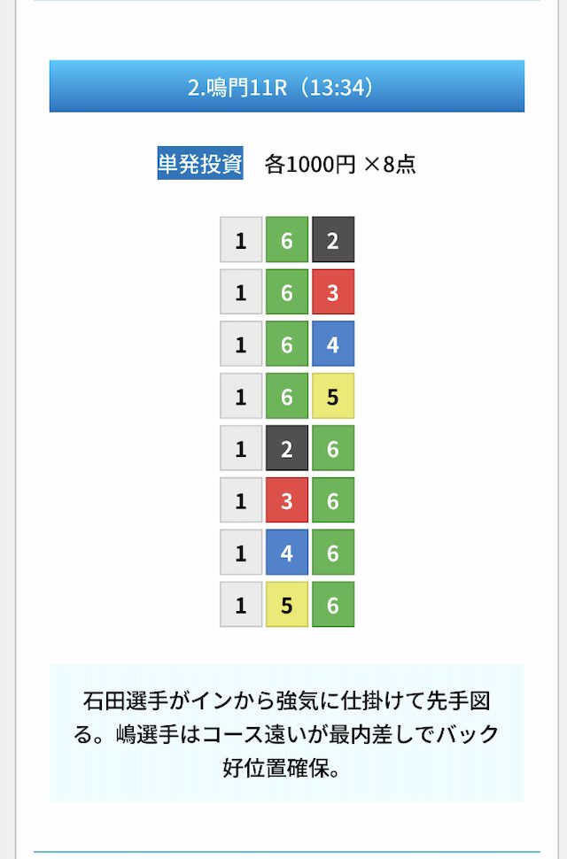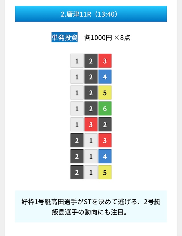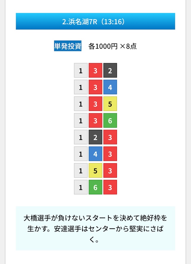 POINTポイント①.本命決着でも数万円の払い戻し!ポイント②.金額と点数調整がまさにプロ!ポイント③.2連勝で10万円超えのプラスも!- 匿名当たり前みたいに1号艇軸かと思いきや、3号艇から仕掛けて的中。ヒモ荒れまで拾ってくれてたのが地味にすごい。 ちょっと尖ってる構成だけど、変に手数が多くないのがありがたい。