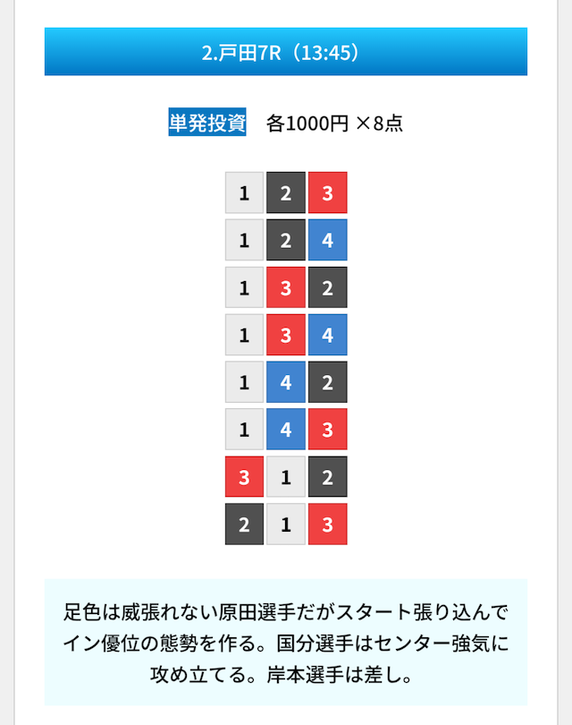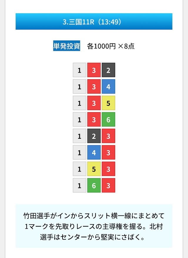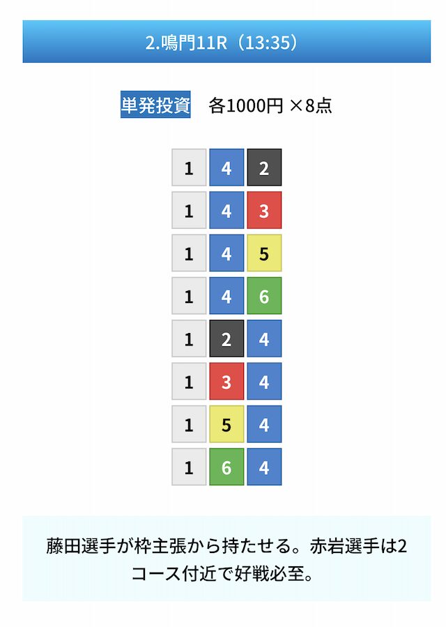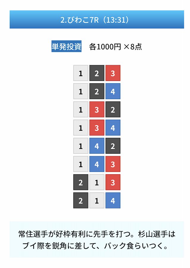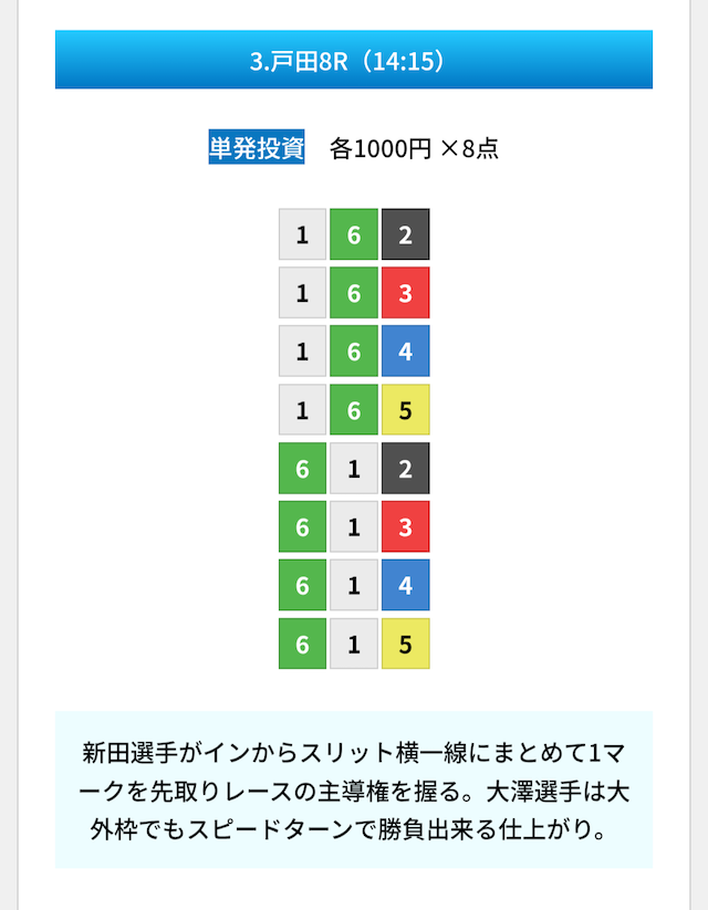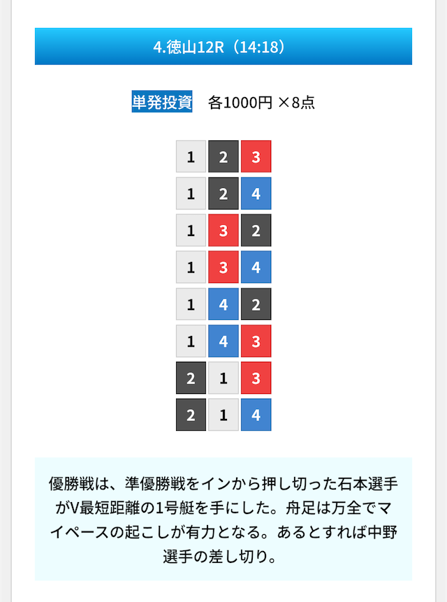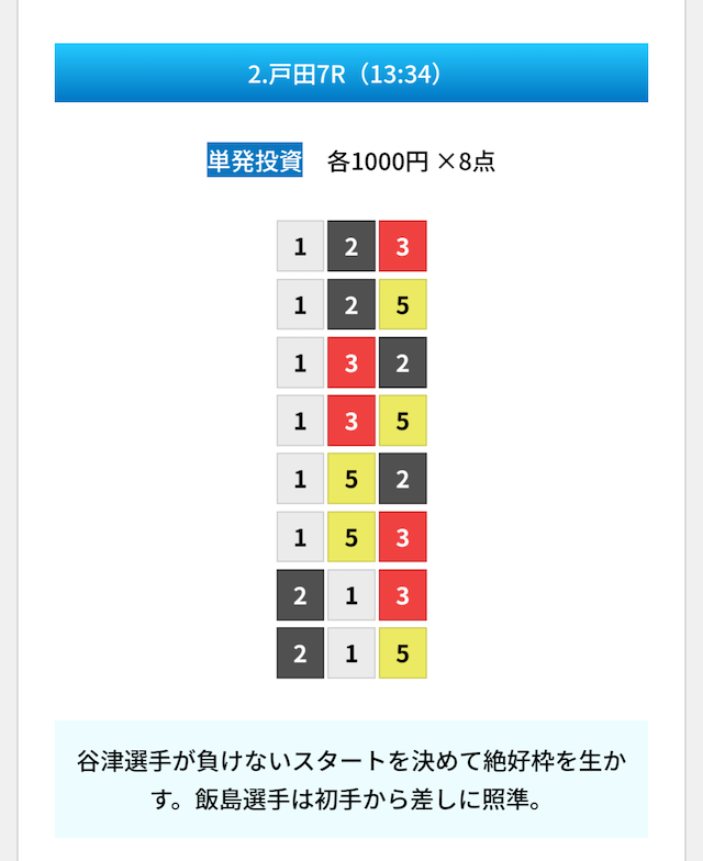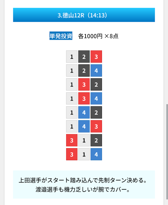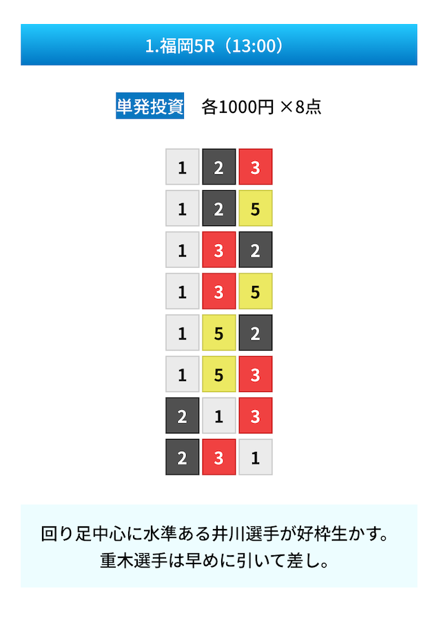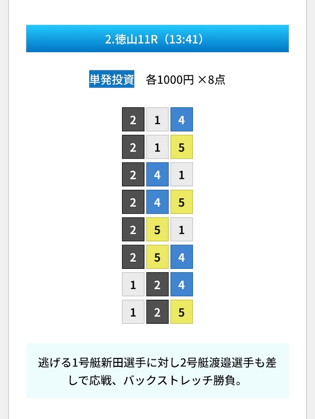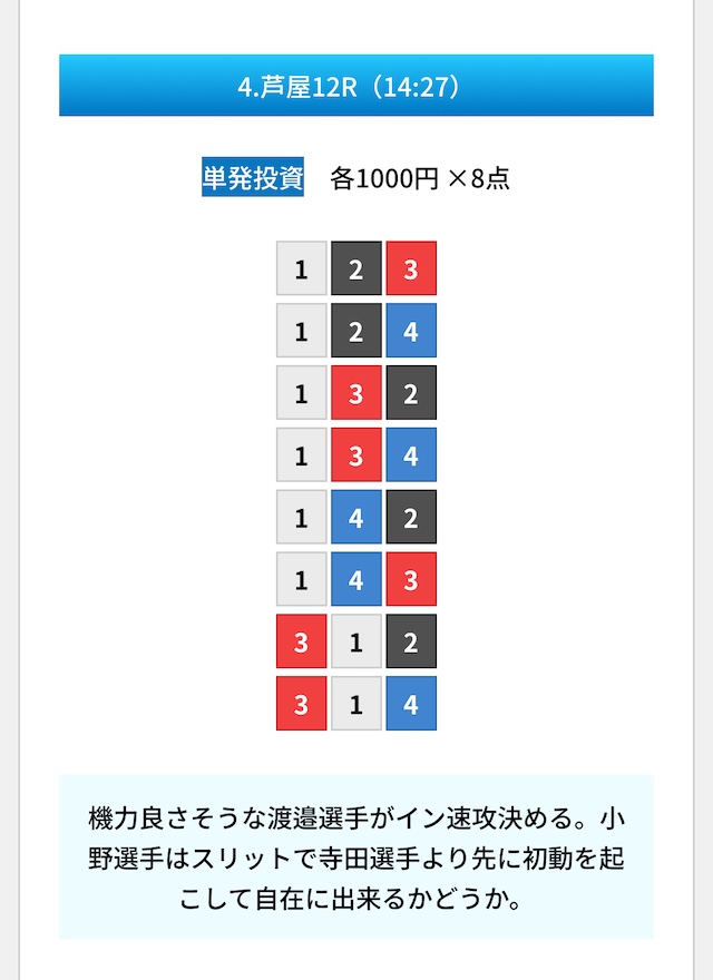POINTポイント①.本命決着でも数万円の払い戻し!ポイント②.金額と点数調整がまさにプロ!ポイント③.2連勝で10万円超えのプラスも!- 匿名当たり前みたいに1号艇軸かと思いきや、3号艇から仕掛けて的中。ヒモ荒れまで拾ってくれてたのが地味にすごい。 ちょっと尖ってる構成だけど、変に手数が多くないのがありがたい。
