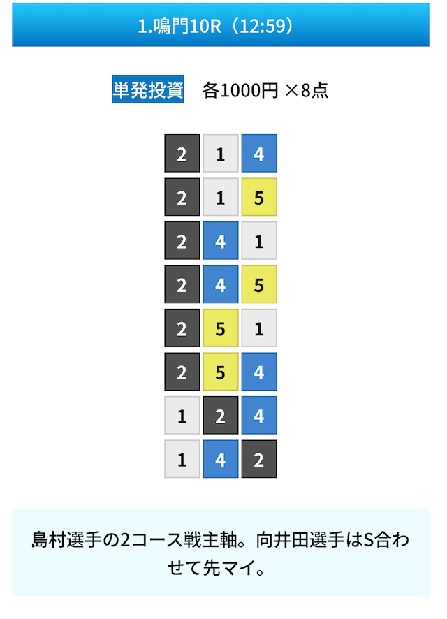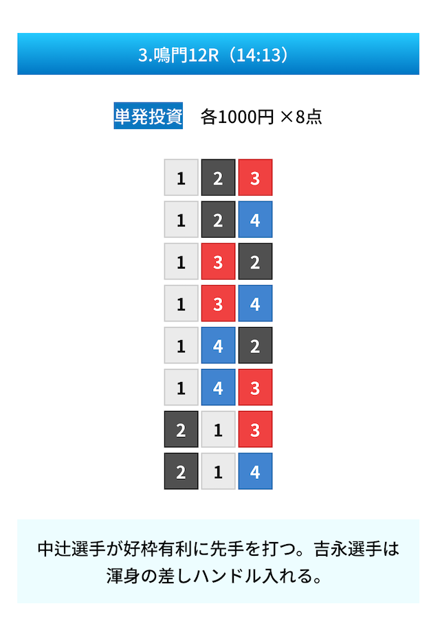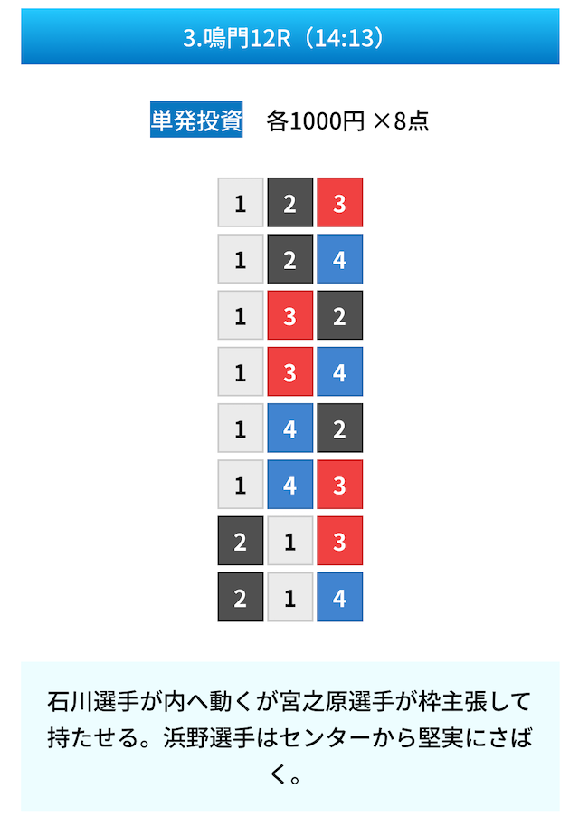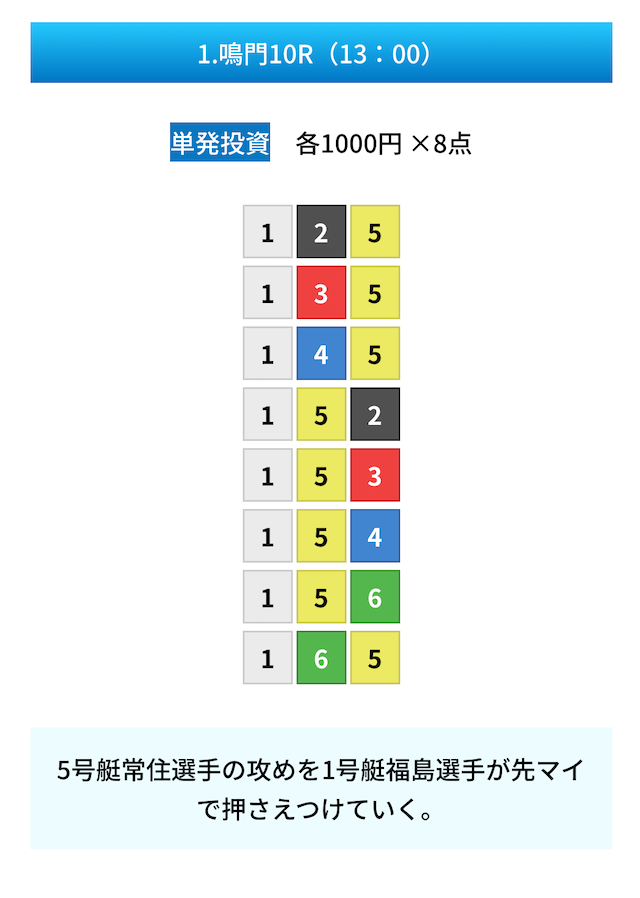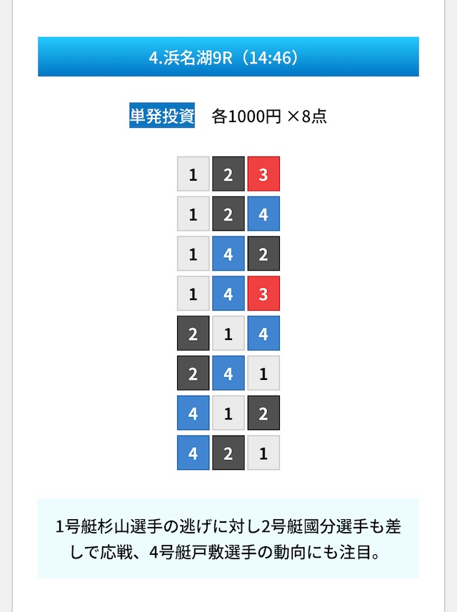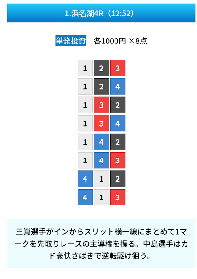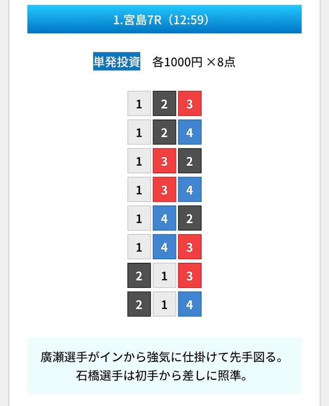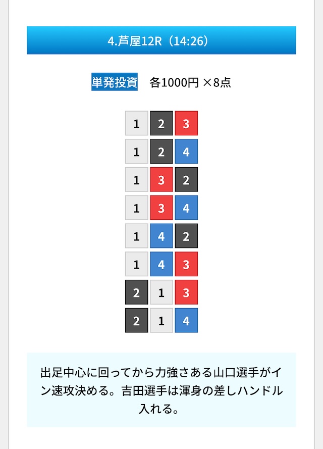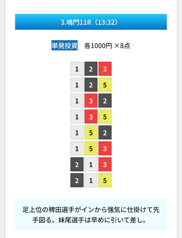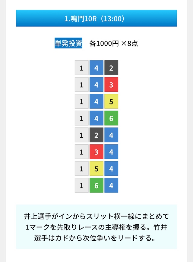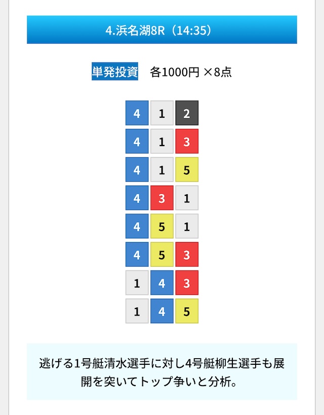 POINTポイント①.本命決着でも数万円の払い戻し!ポイント②.金額と点数調整がまさにプロ!ポイント③.2連勝で10万円超えのプラスも!- 匿名当たり前みたいに1号艇軸かと思いきや、3号艇から仕掛けて的中。ヒモ荒れまで拾ってくれてたのが地味にすごい。 ちょっと尖ってる構成だけど、変に手数が多くないのがありがたい。