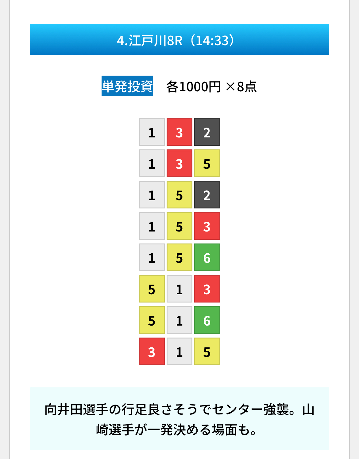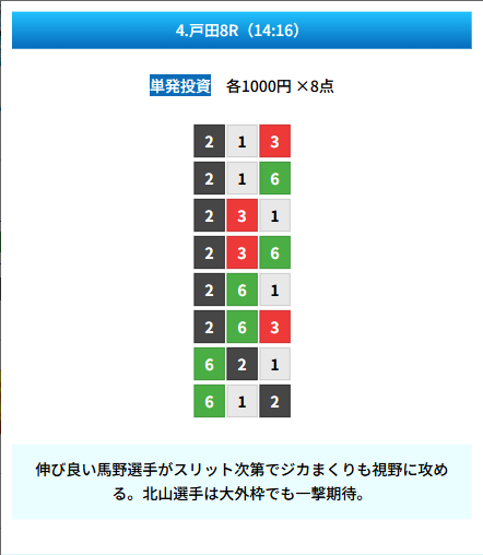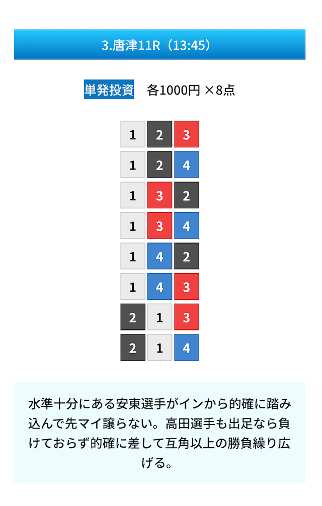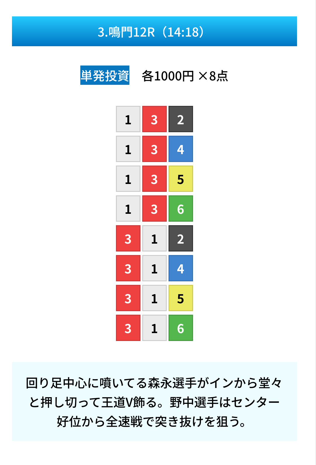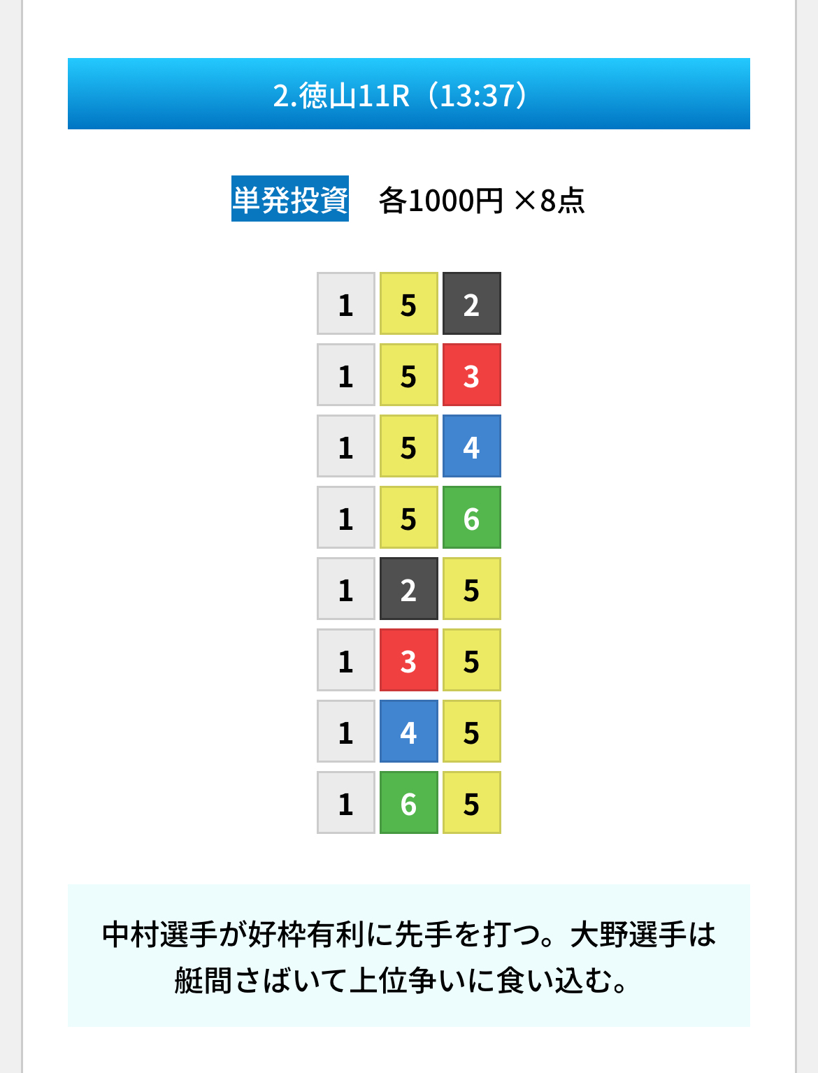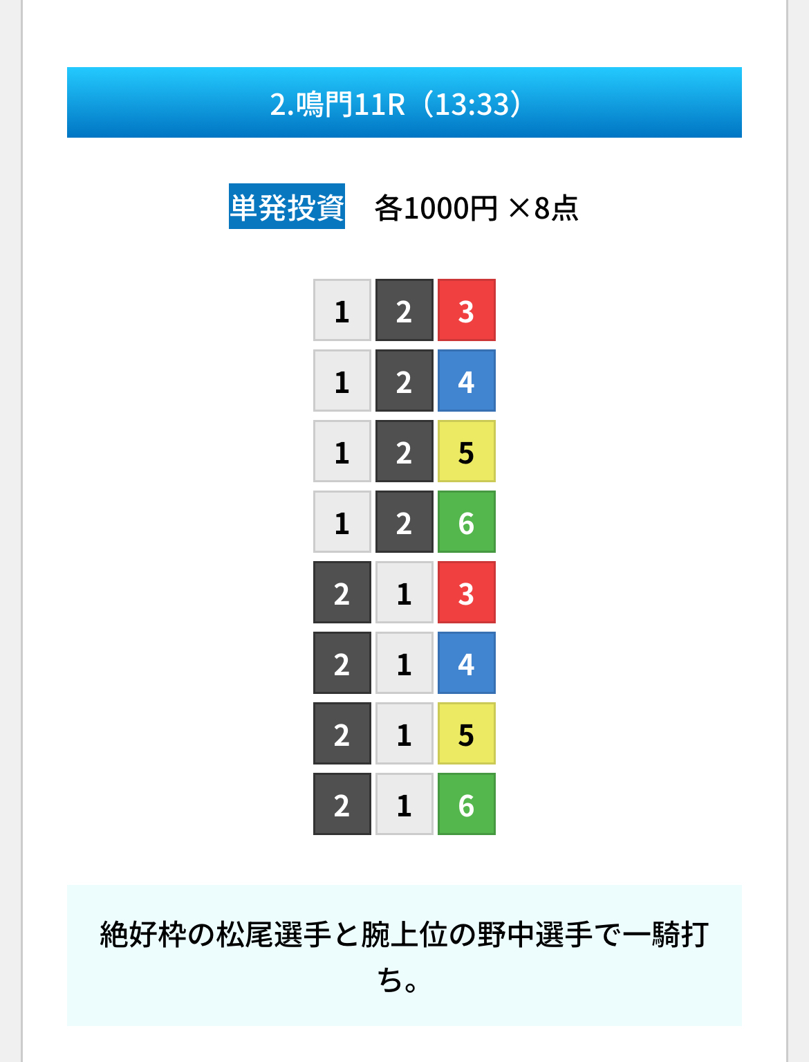 - 匿名1点1点の金額が調整されてて、オッズに対する意識の高さを感じた。 厚く押さえてたとこが来たから利益が残った。トリガミにならないように組んでる予想って少ないからこれは貴重かも。