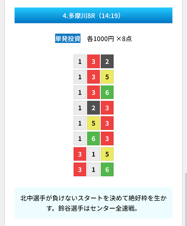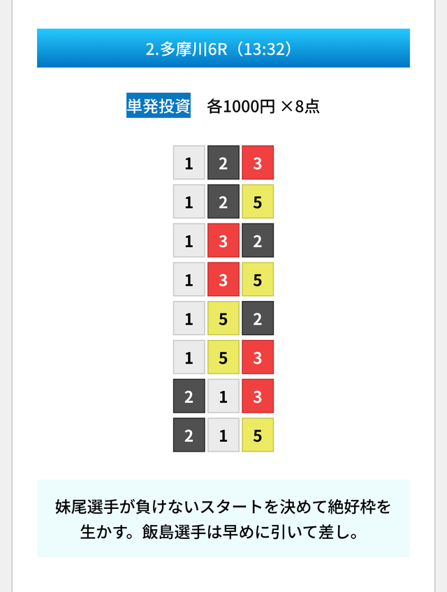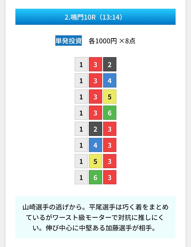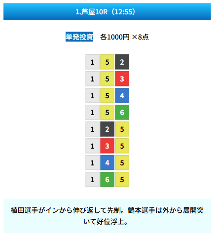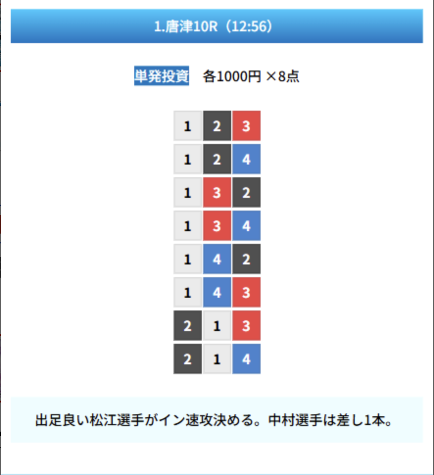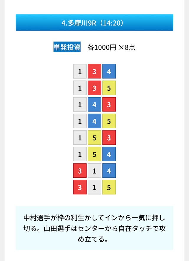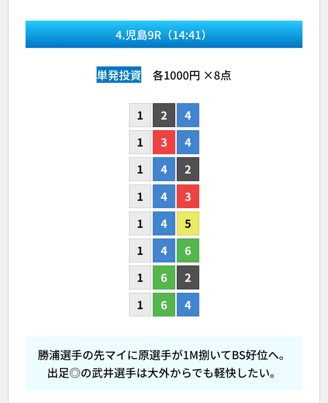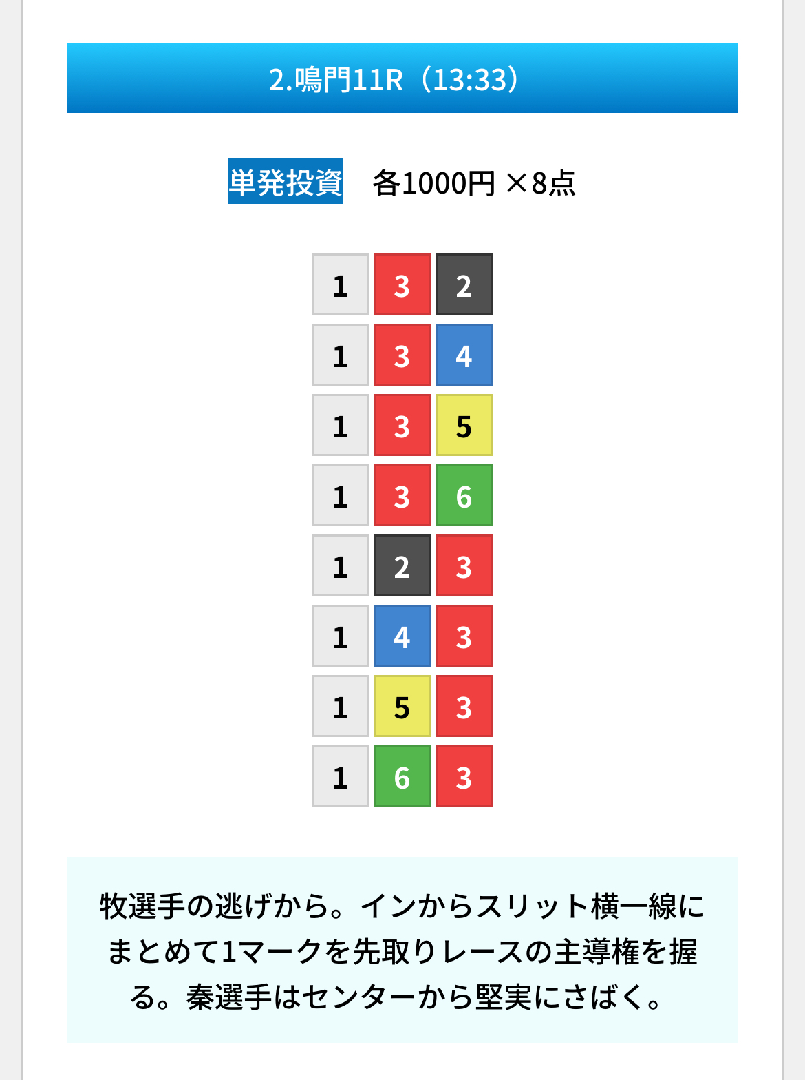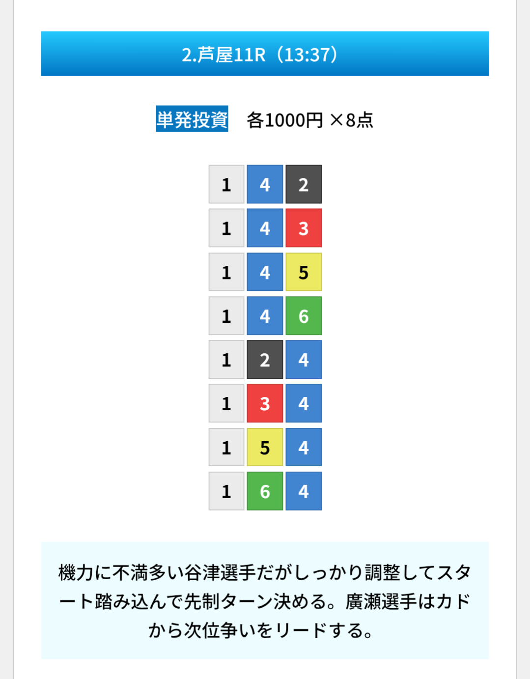 - 匿名1点1点の金額が調整されてて、オッズに対する意識の高さを感じた。 厚く押さえてたとこが来たから利益が残った。トリガミにならないように組んでる予想って少ないからこれは貴重かも。