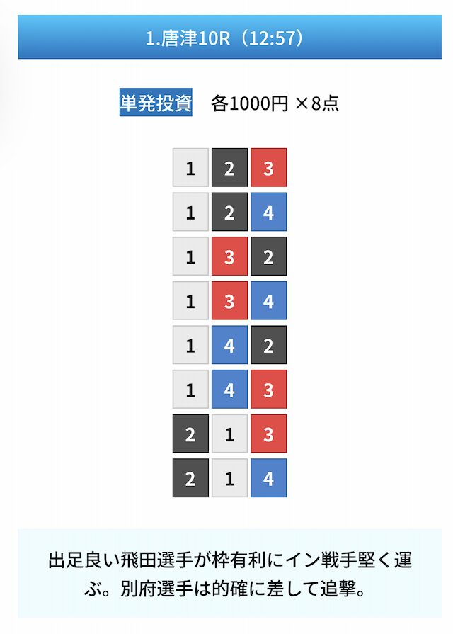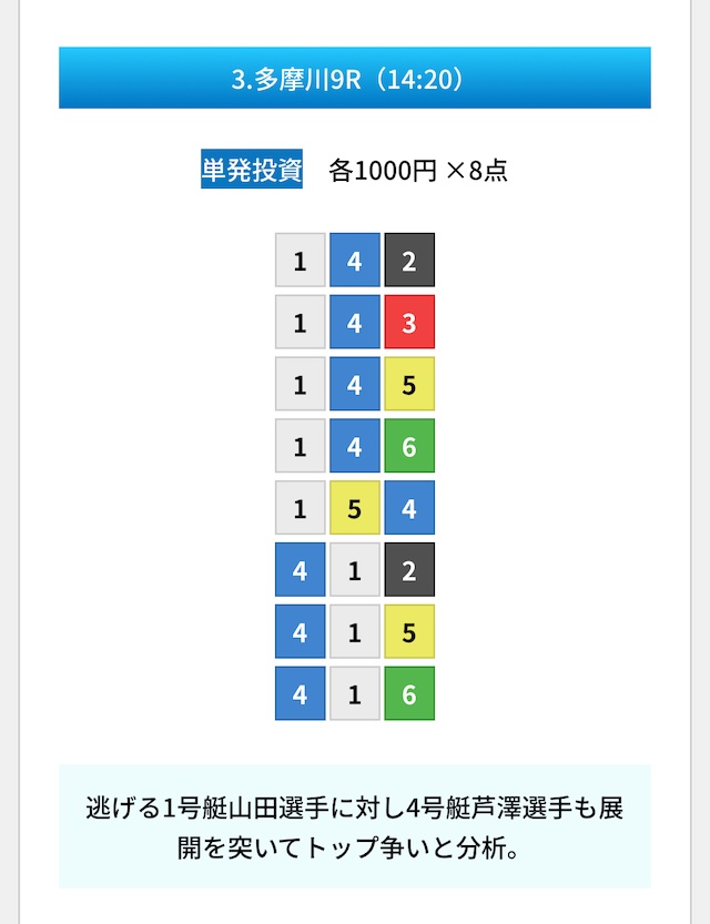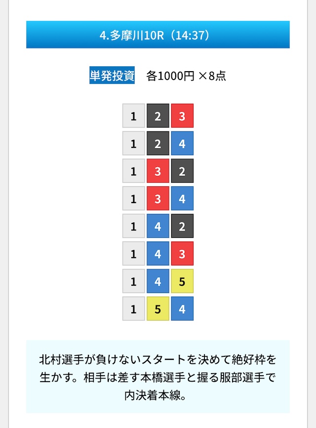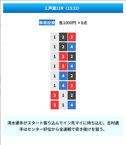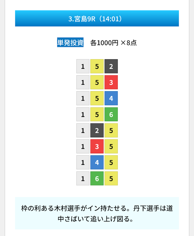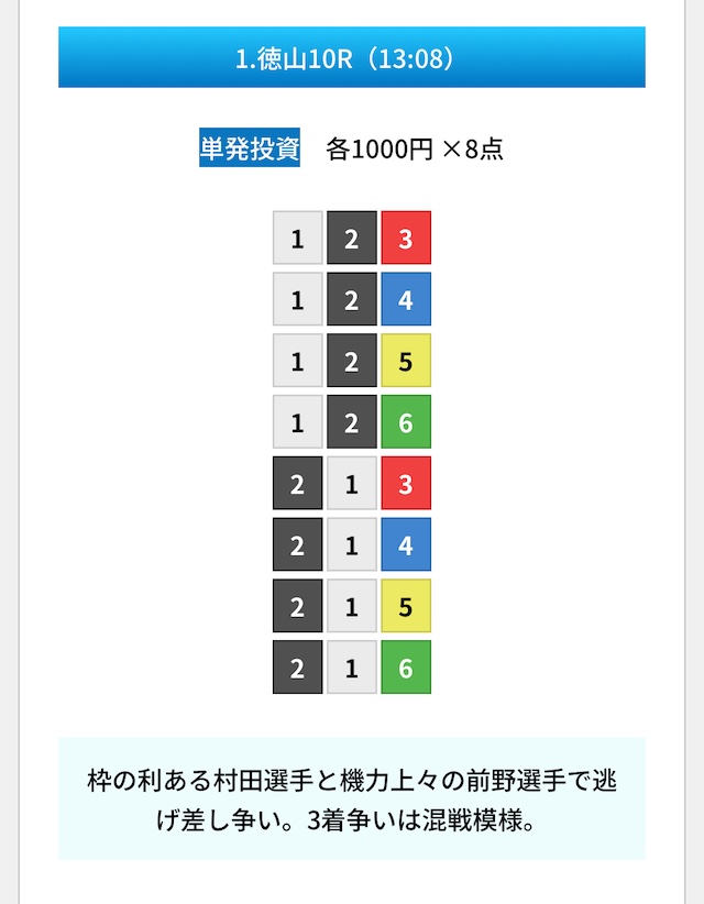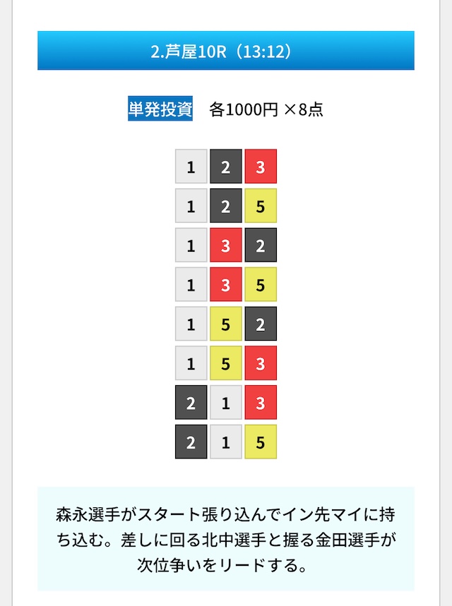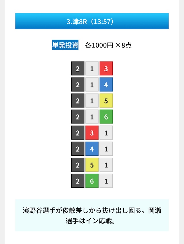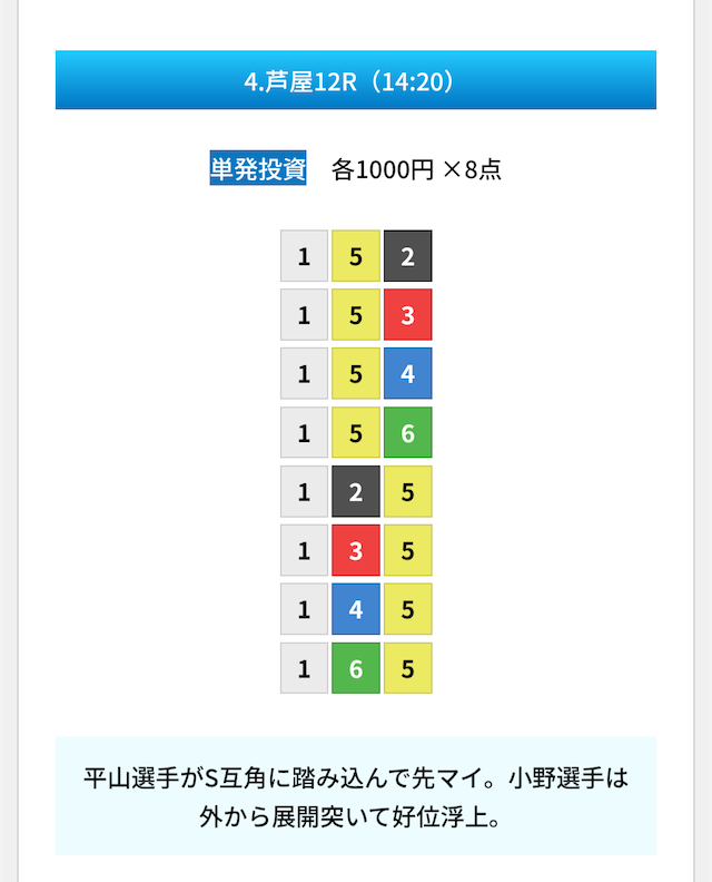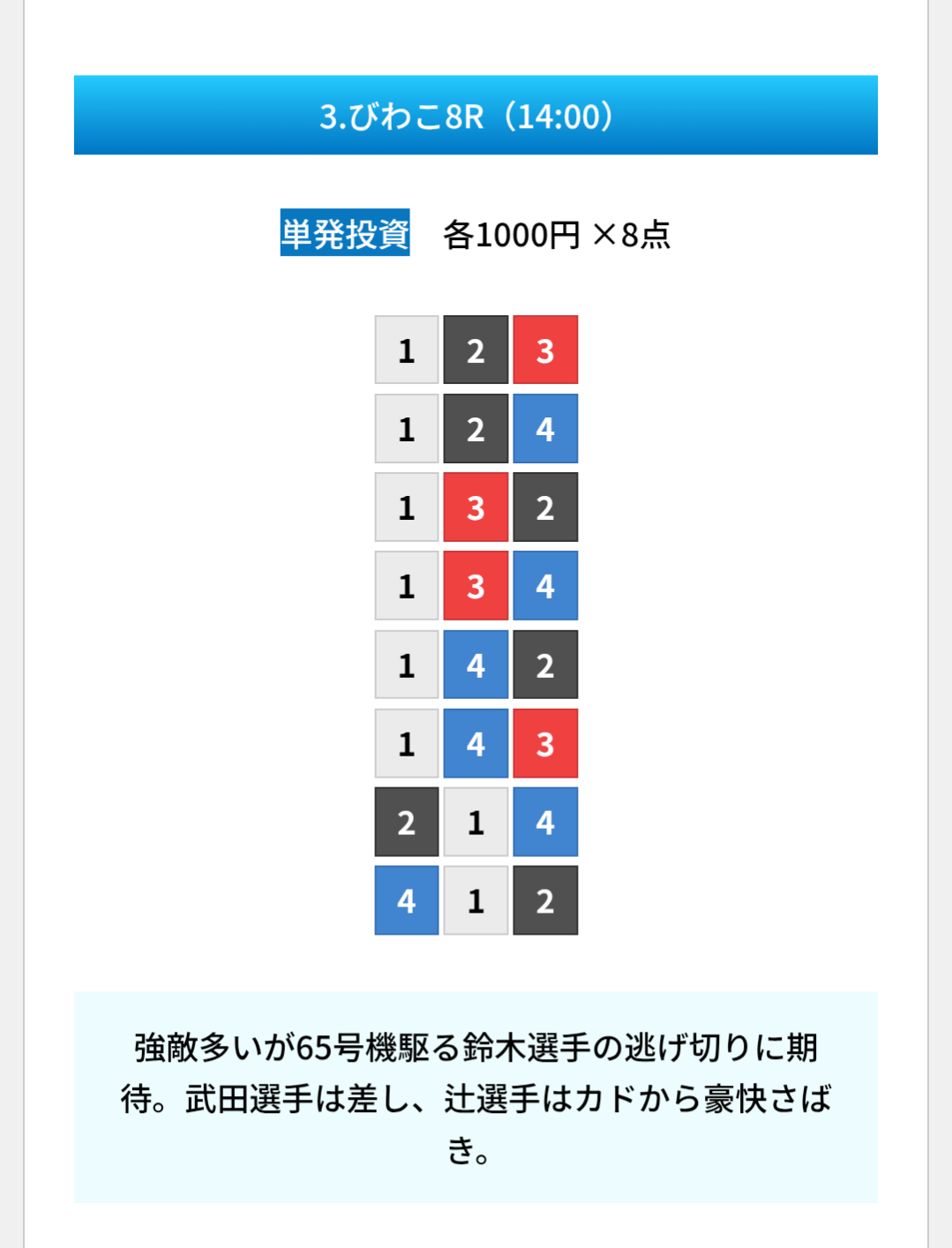 - 匿名1点1点の金額が調整されてて、オッズに対する意識の高さを感じた。 厚く押さえてたとこが来たから利益が残った。トリガミにならないように組んでる予想って少ないからこれは貴重かも。