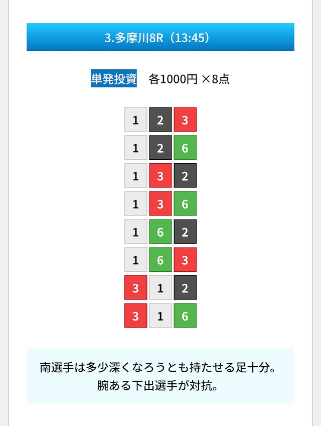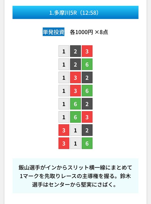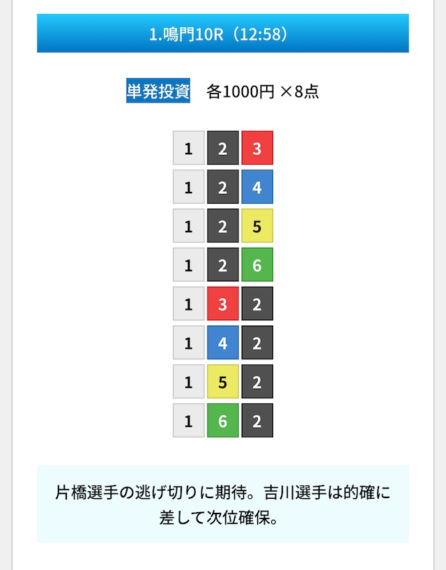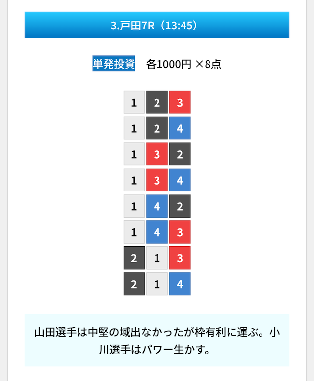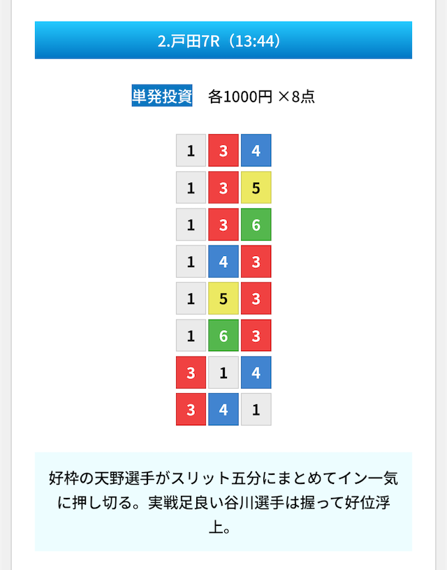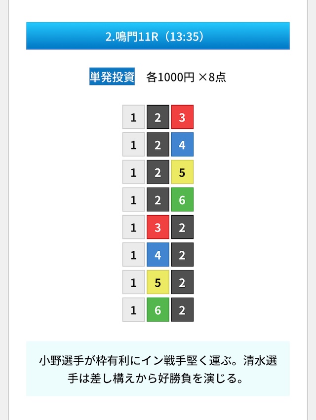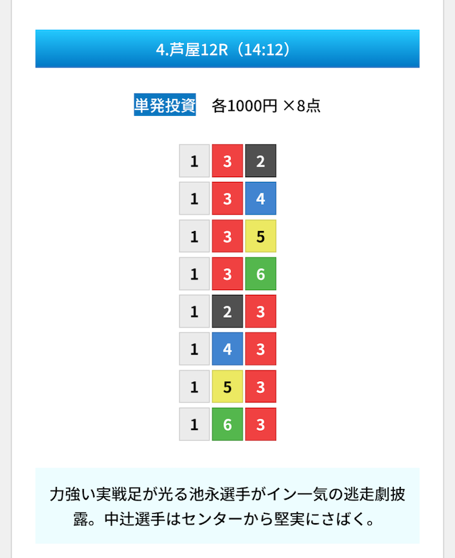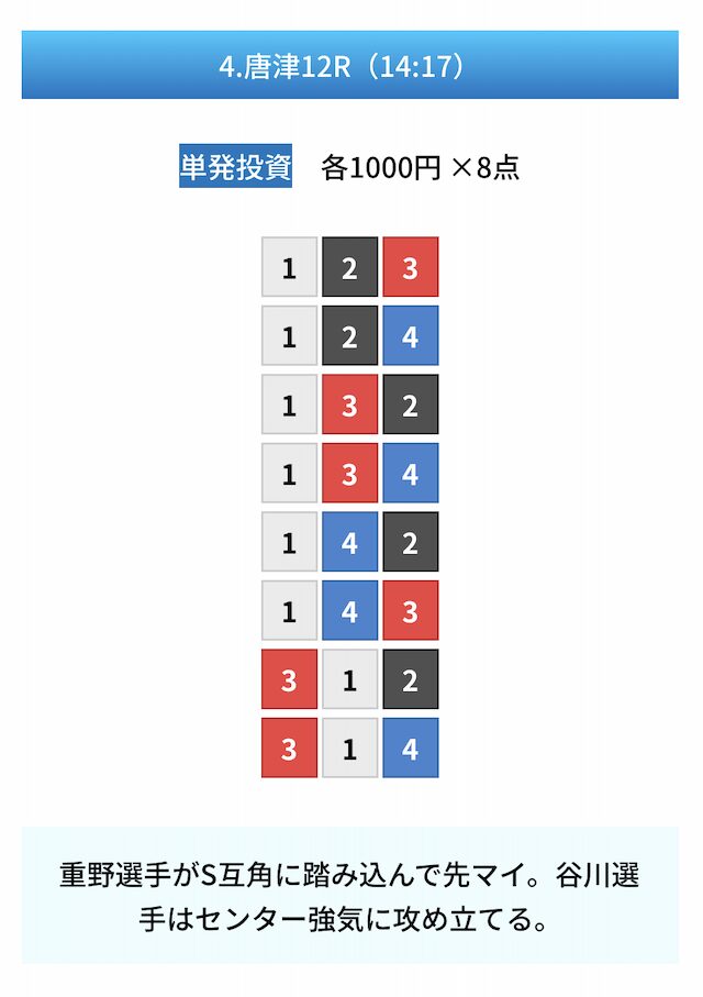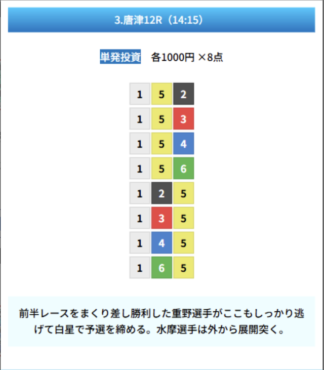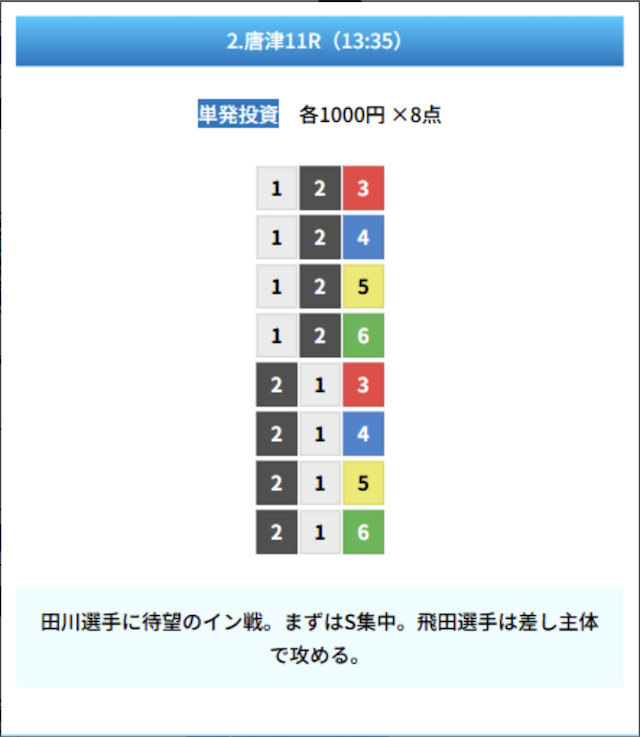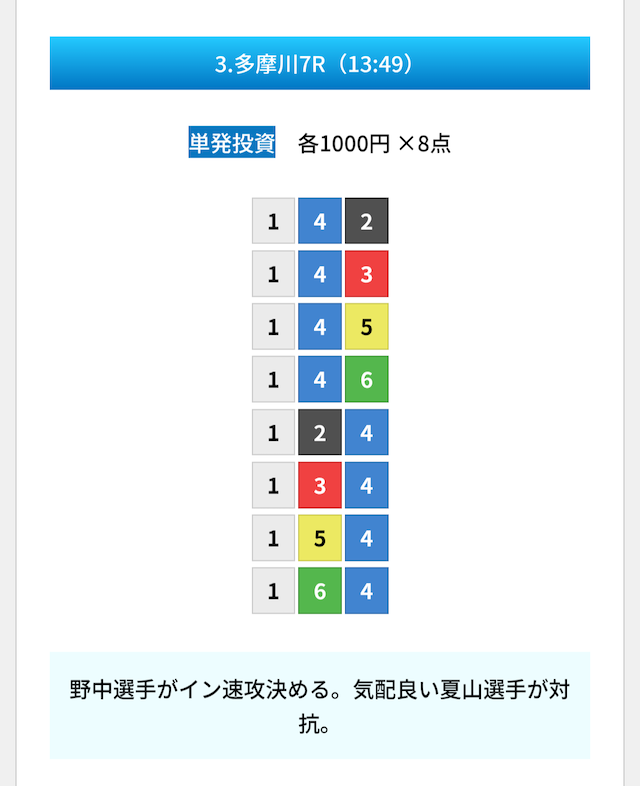 - 匿名1点1点の金額が調整されてて、オッズに対する意識の高さを感じた。 厚く押さえてたとこが来たから利益が残った。トリガミにならないように組んでる予想って少ないからこれは貴重かも。