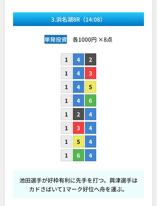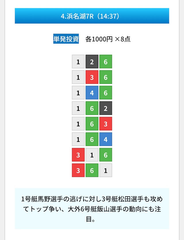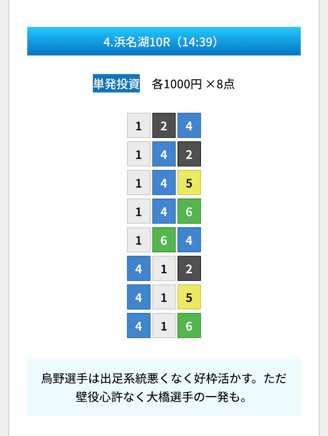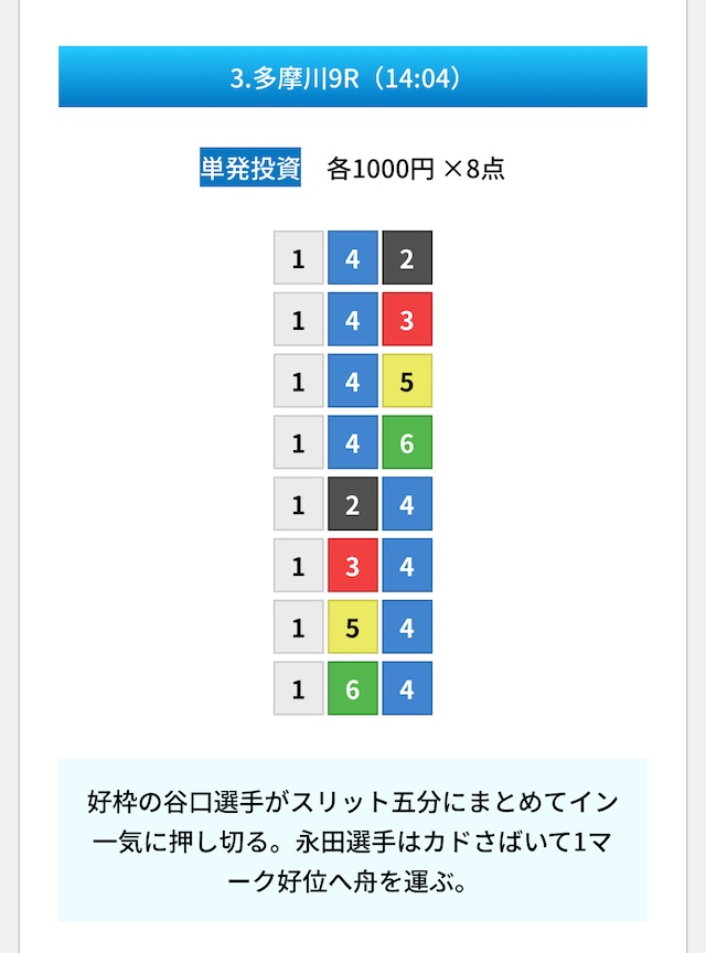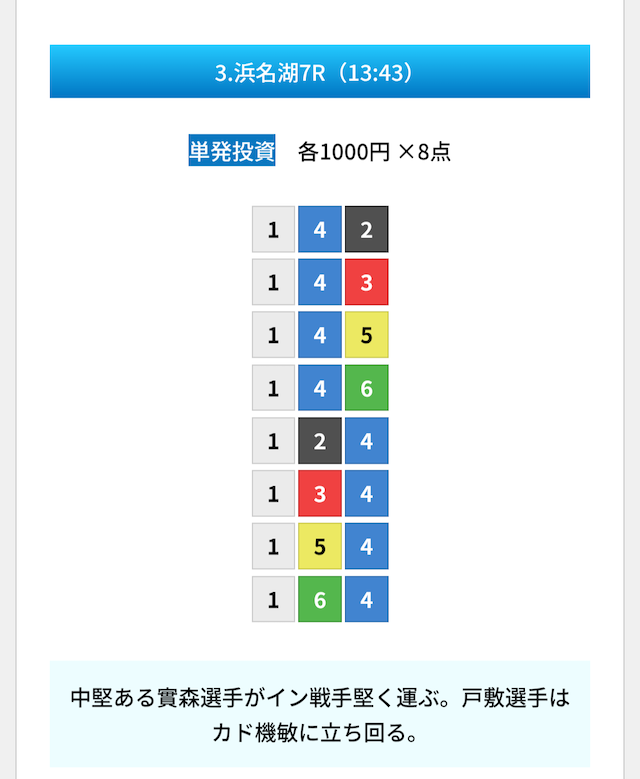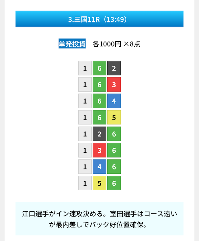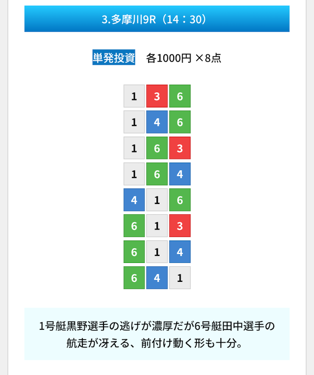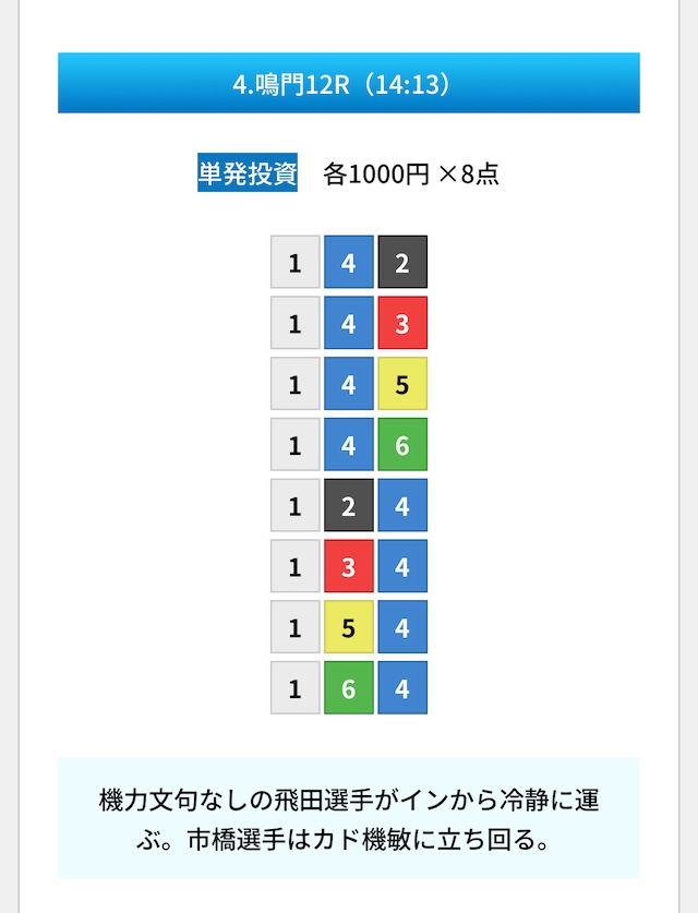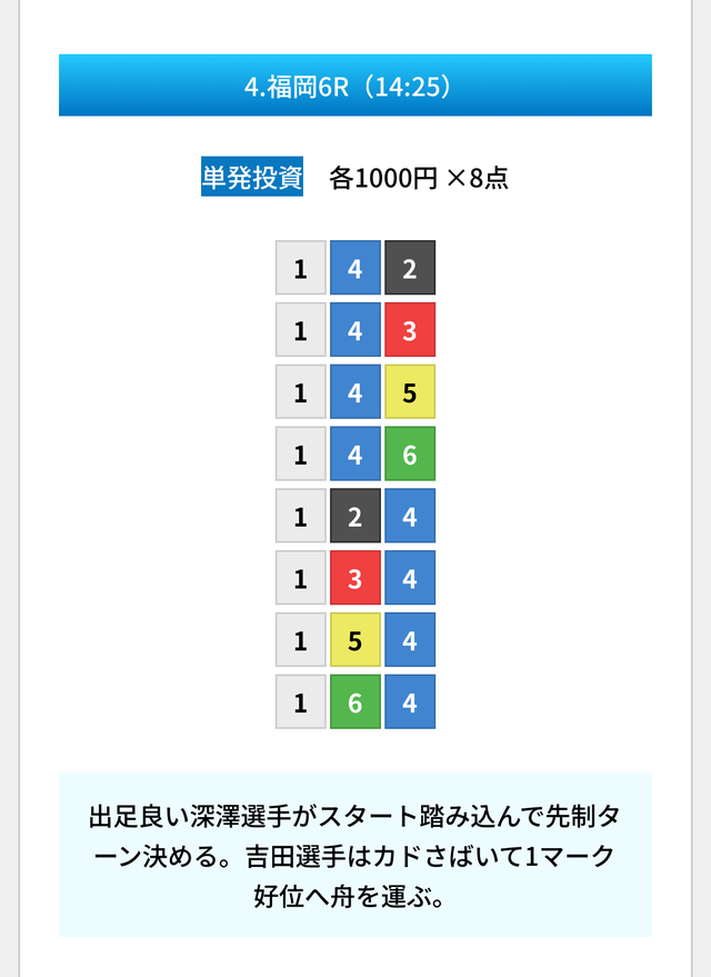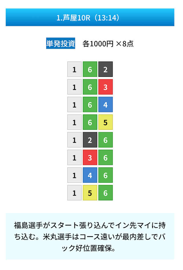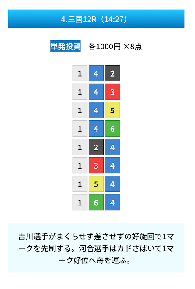 1・4・6号艇のボックス買いを6号艇よりに改良したような買い目。