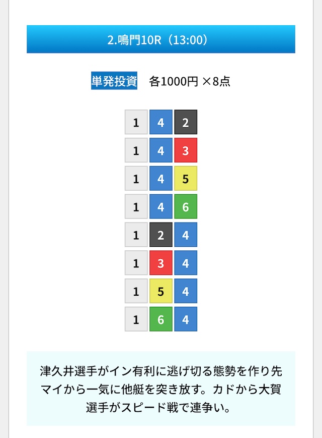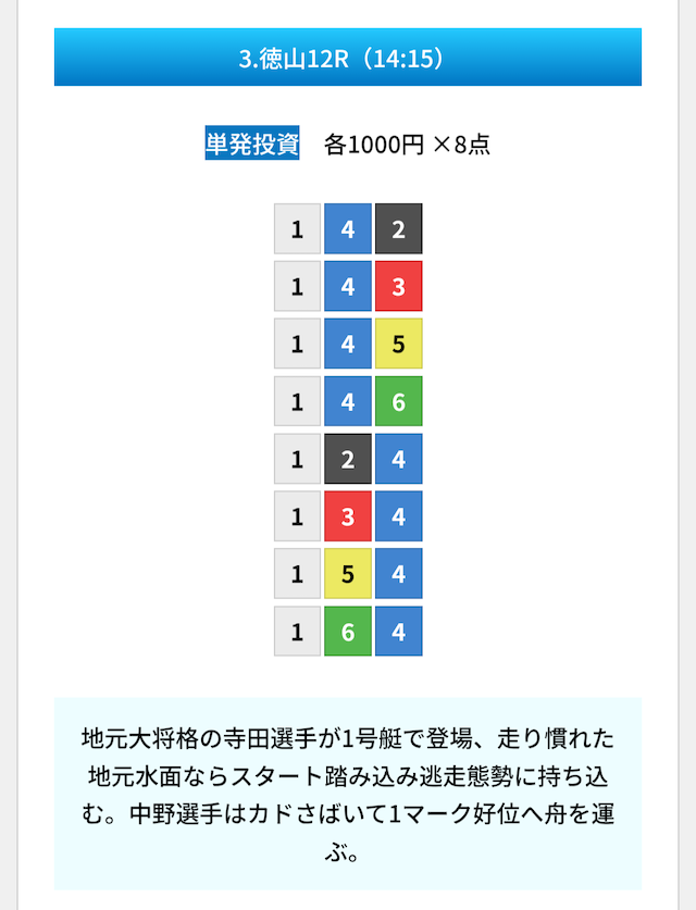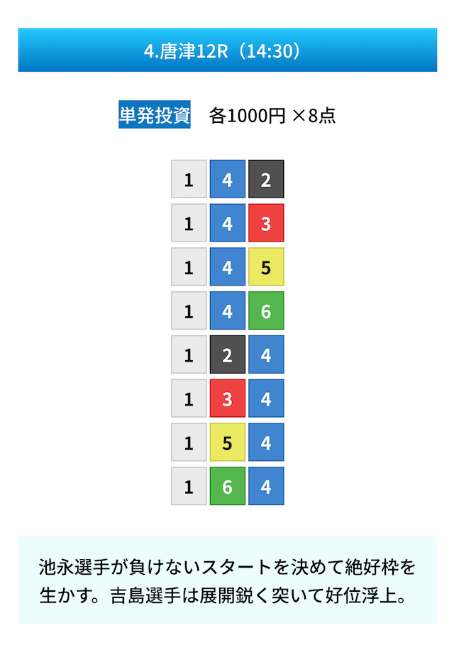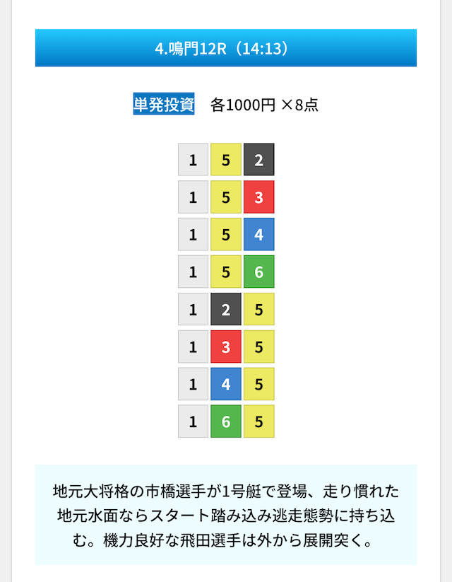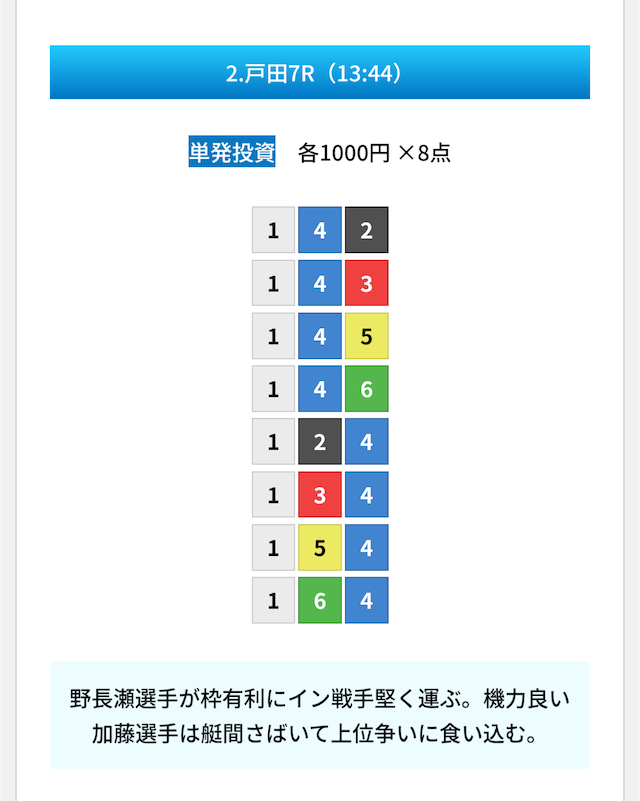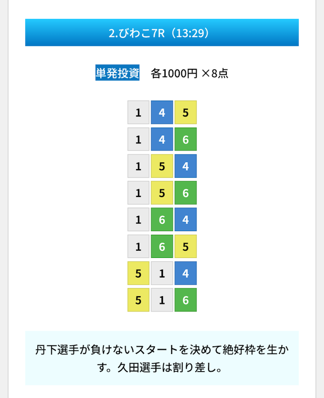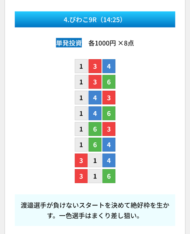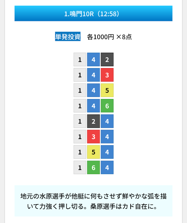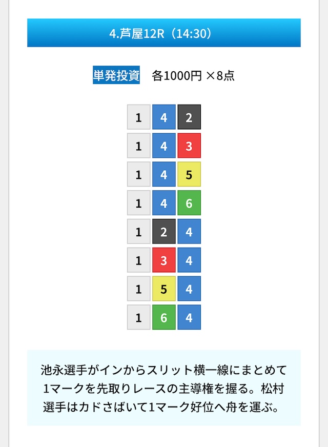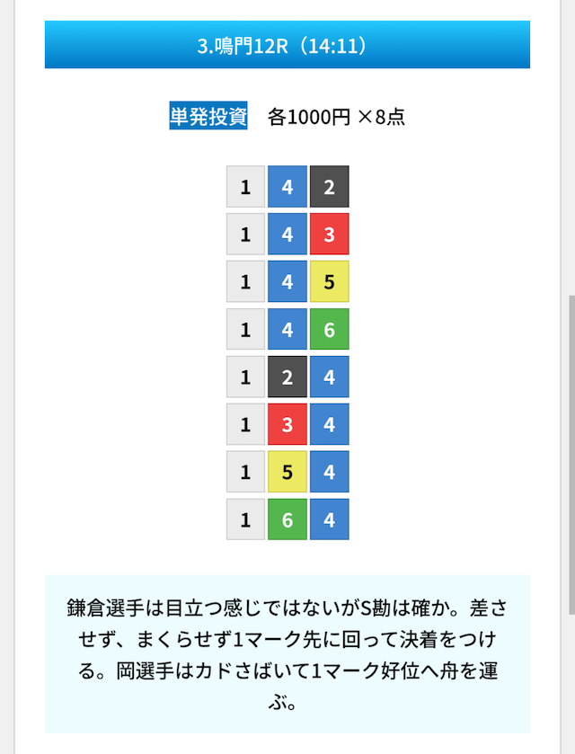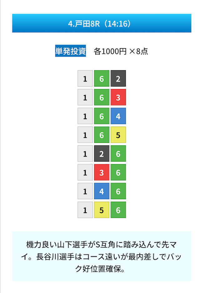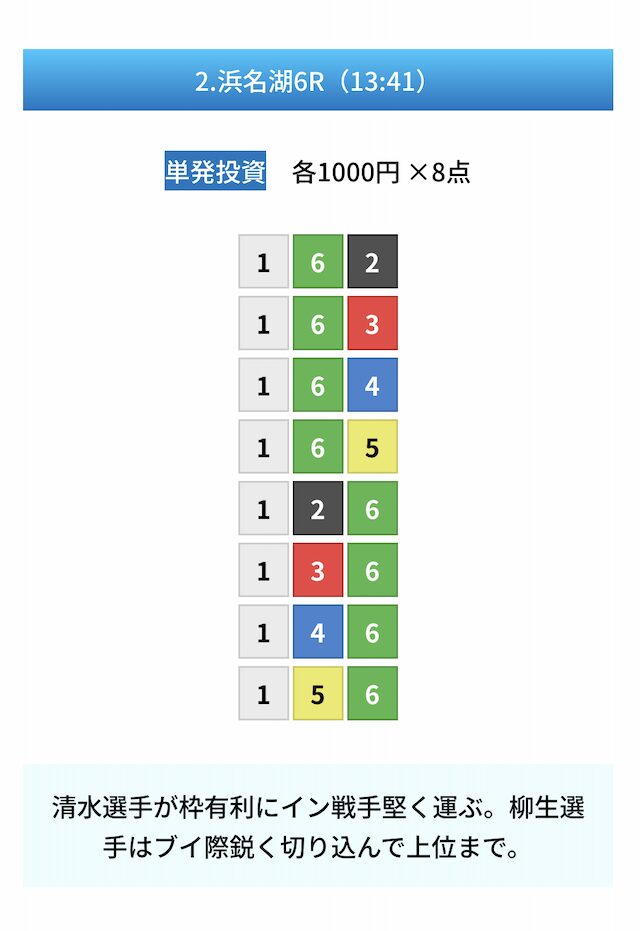 1・4・6号艇のボックス買いを6号艇よりに改良したような買い目。