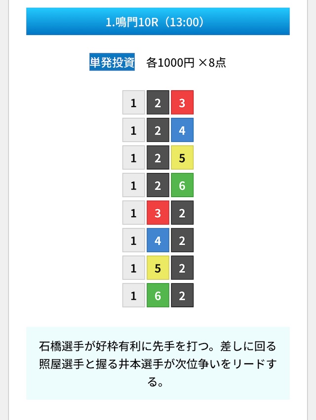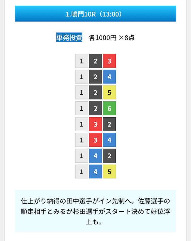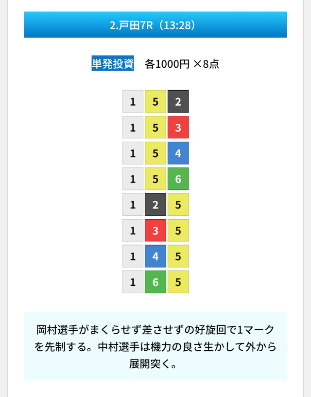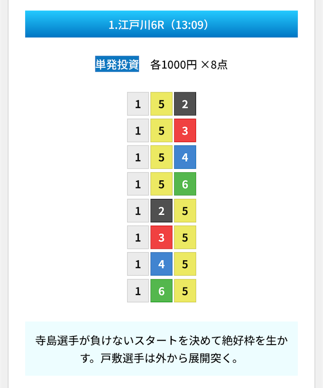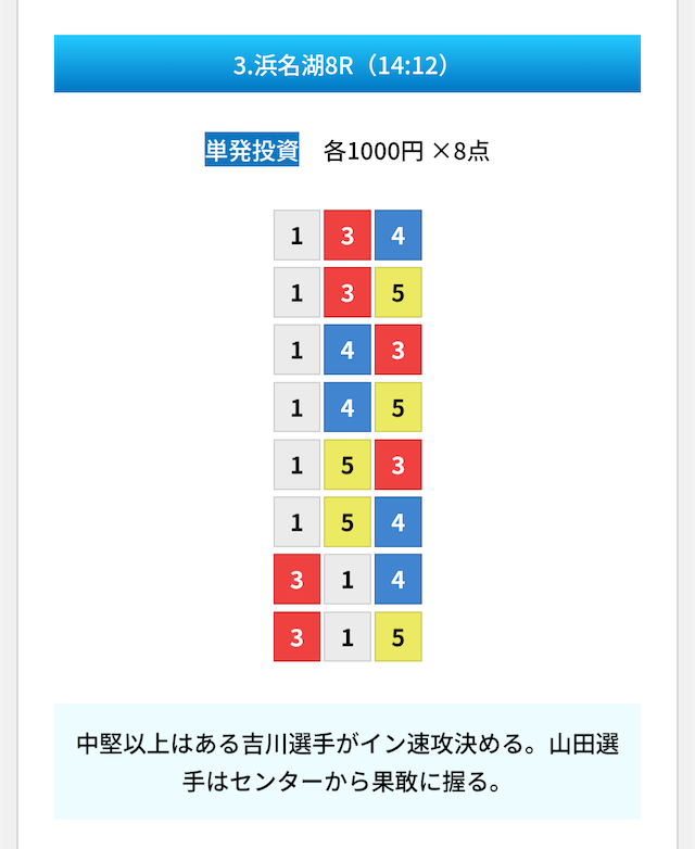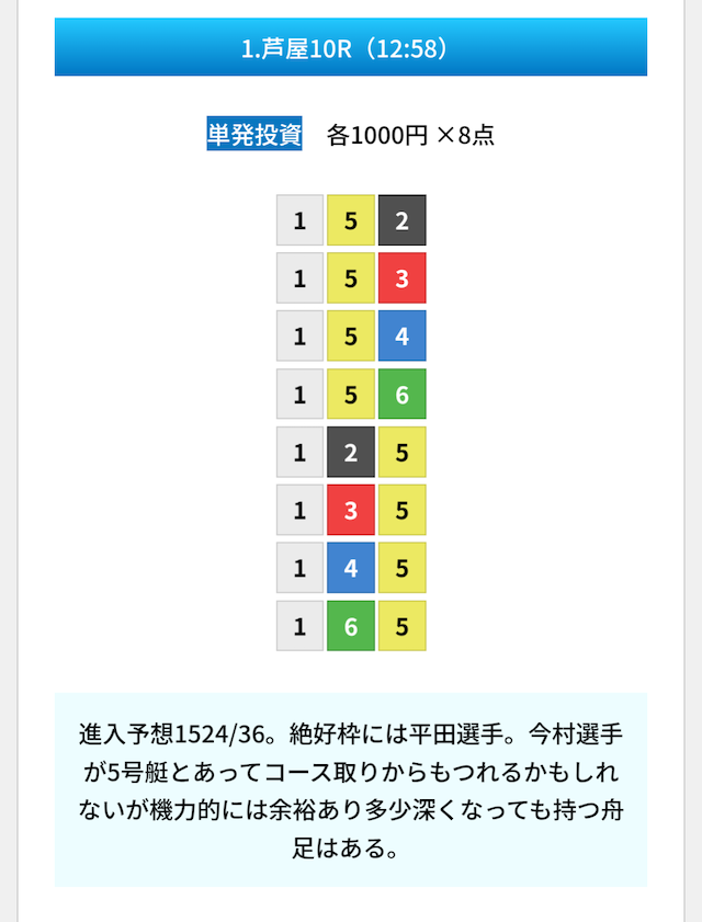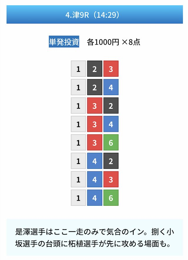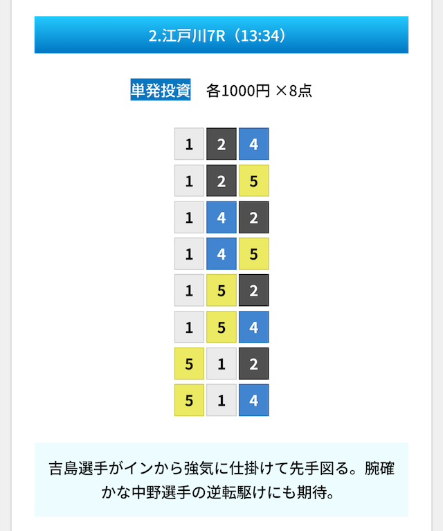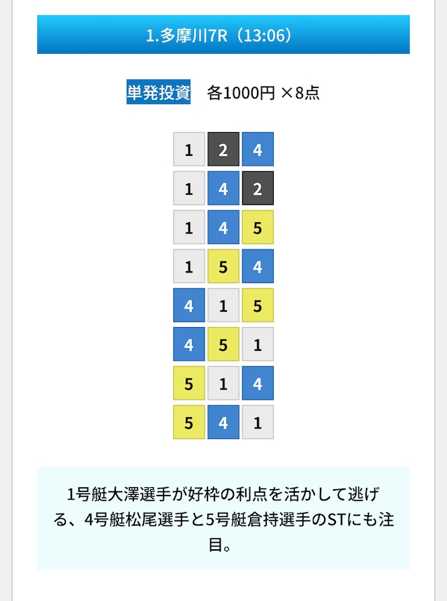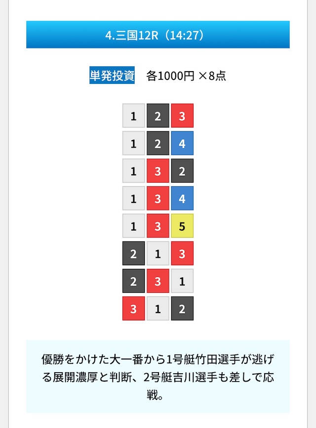 この3艇が舟券に絡んでくる可能性はかなり高いので、買い目の判断として妥当でしょう。