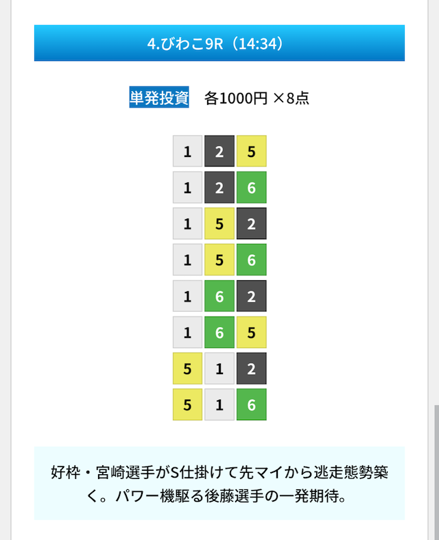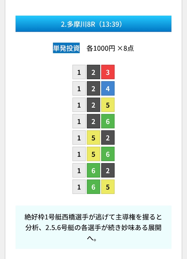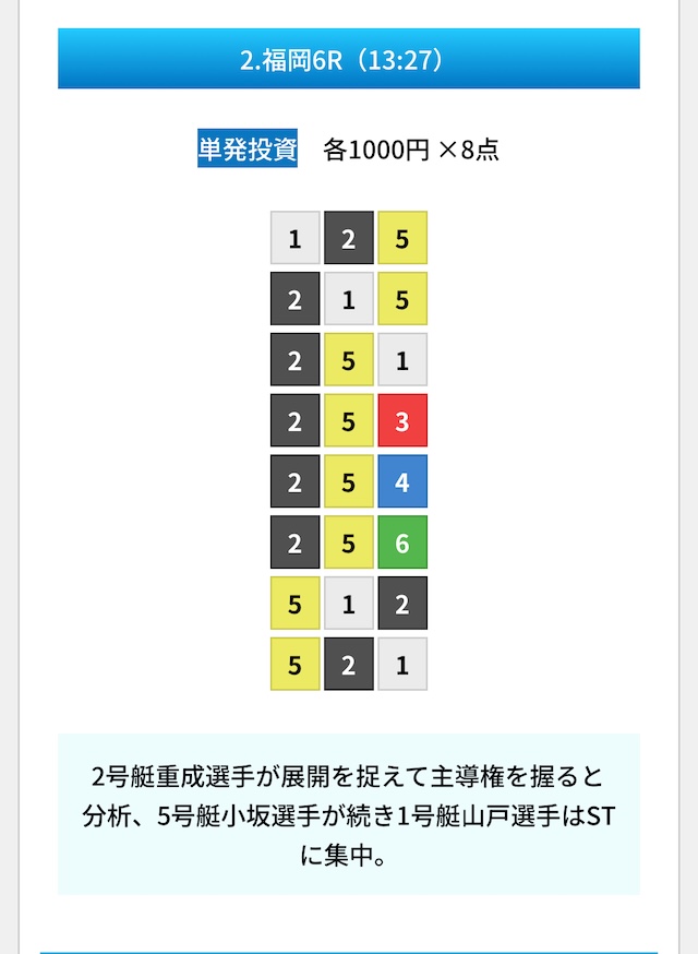 競艇ゾーンは2・6号艇共に3着にのみ絡んでくる予想で、さらに10点中2点と信頼度はかなり低め。