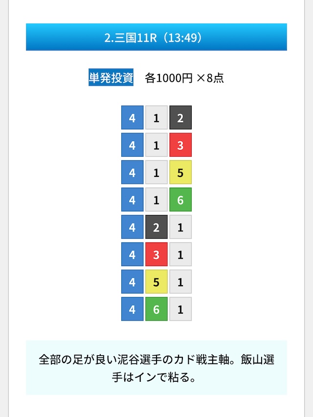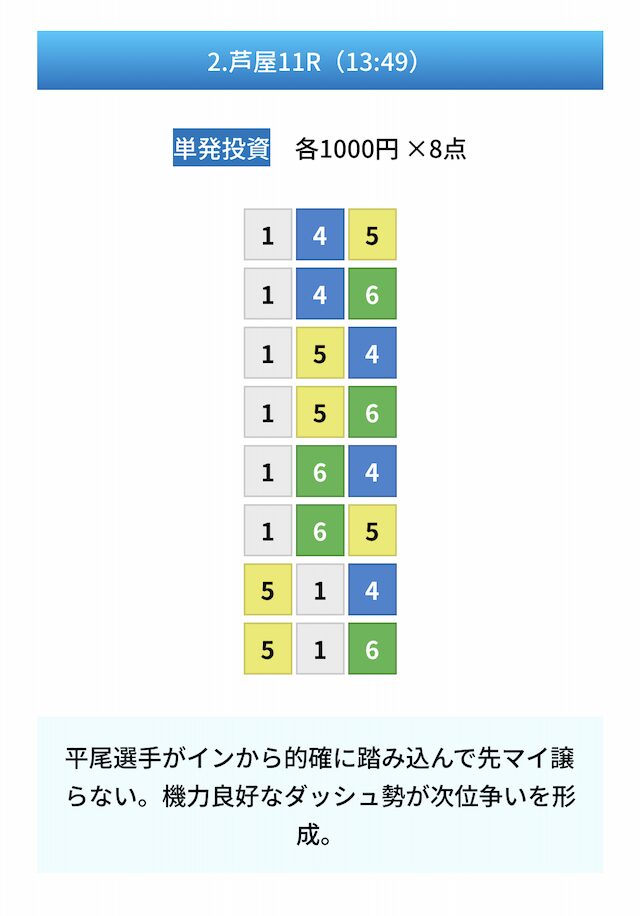 POINTポイント①.本命決着でも数万のプラスを出せる!ポイント②.一撃で帯まで見える有料予想!ポイント③.7点予想で連勝できる展開予想力!- コロ助昨日の無料が宮島で6万1200円の払い戻し出してくれて 今日11月27日は昼の無料が浜名湖で6万7200円、夜は蒲郡で31万5200円も無料情報が当ててくれた